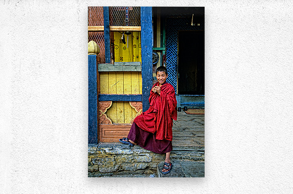 A smiling young monk in traditional red robes sits on a stone wall outside a colorful temple in Bhutan posing for a portrait.