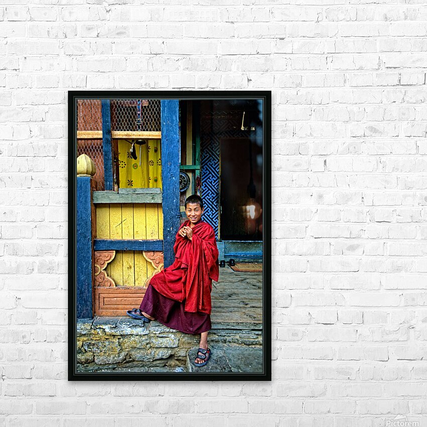 Smiling young monk in red robes at colorful traditional building Picture Frame Printing