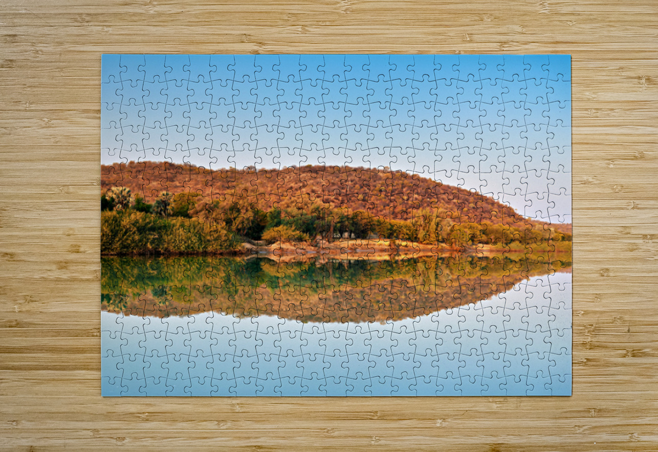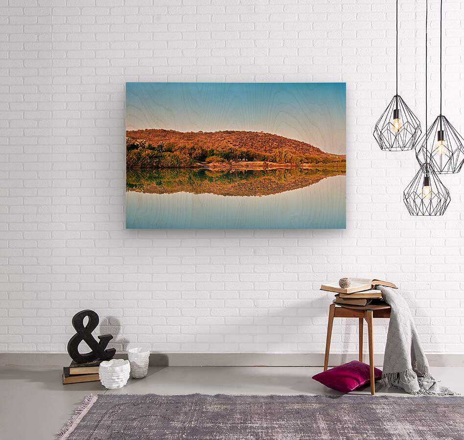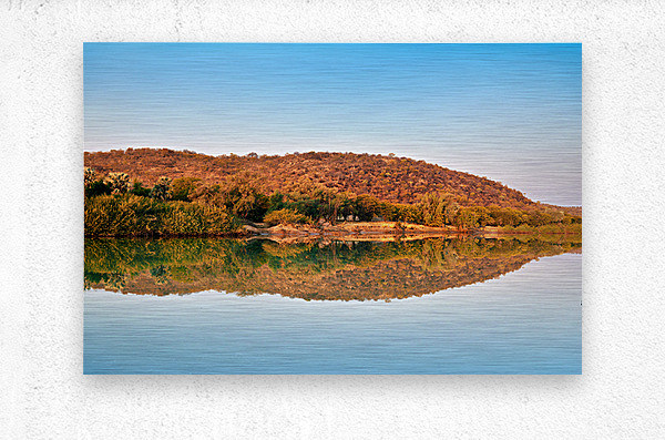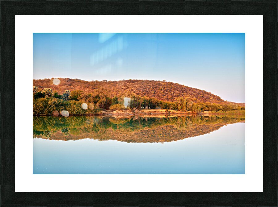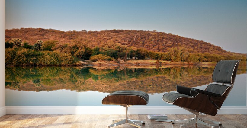 Okavango river flows quietly in Kavango region. The sky shows dusk colors as sunlight fades. Trees and hills reflect on water surface.