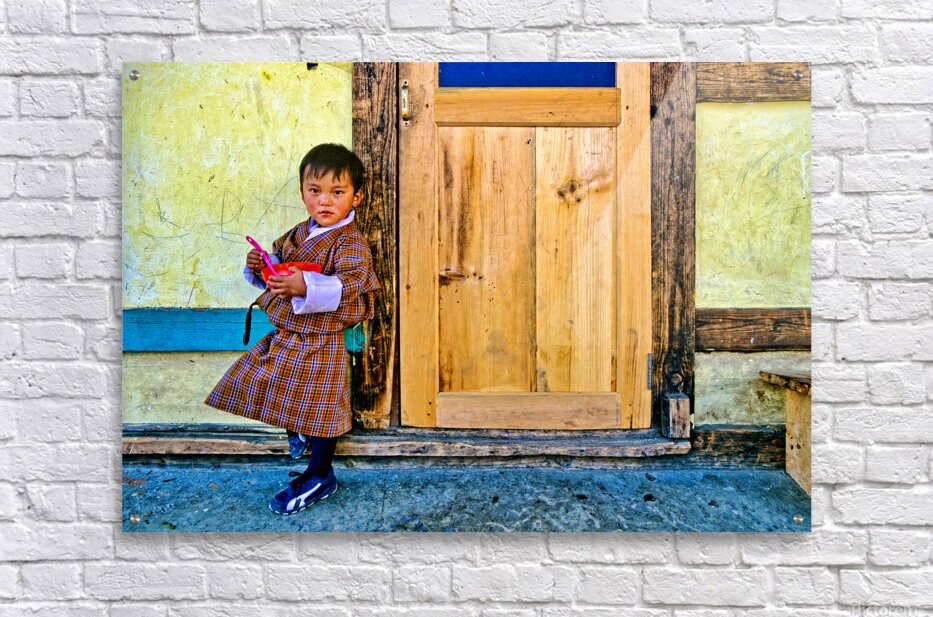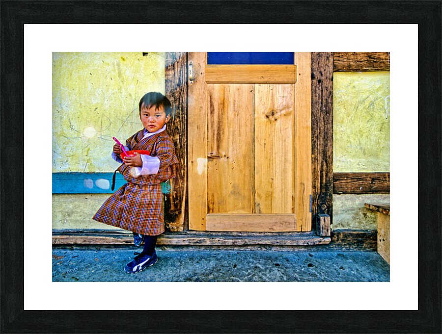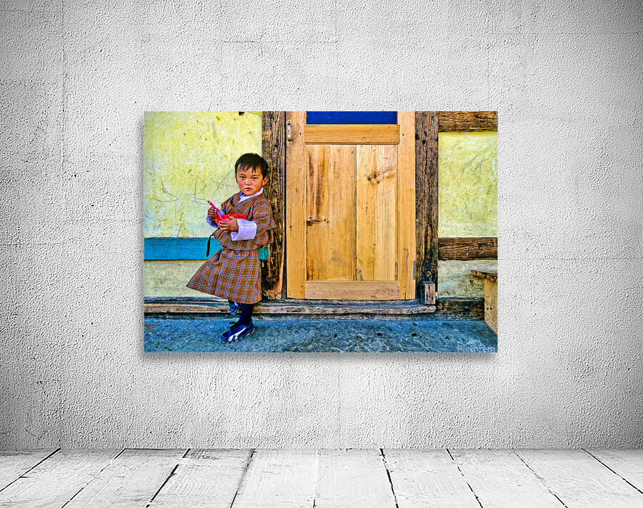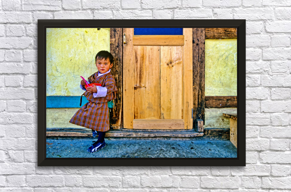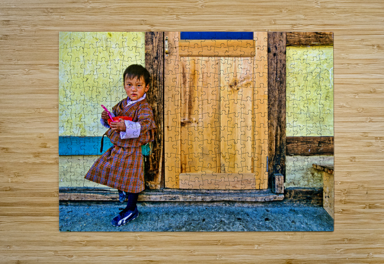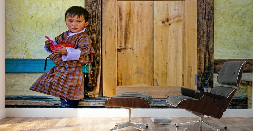 A young child in traditional Bhutanese dress holds a pink spoon and red bowl standing by a rustic wooden door and yellow wall perhaps in Bhutan.