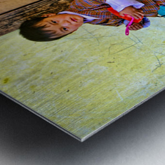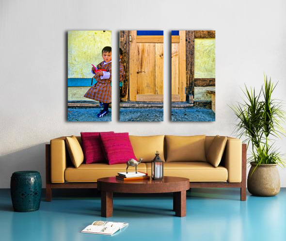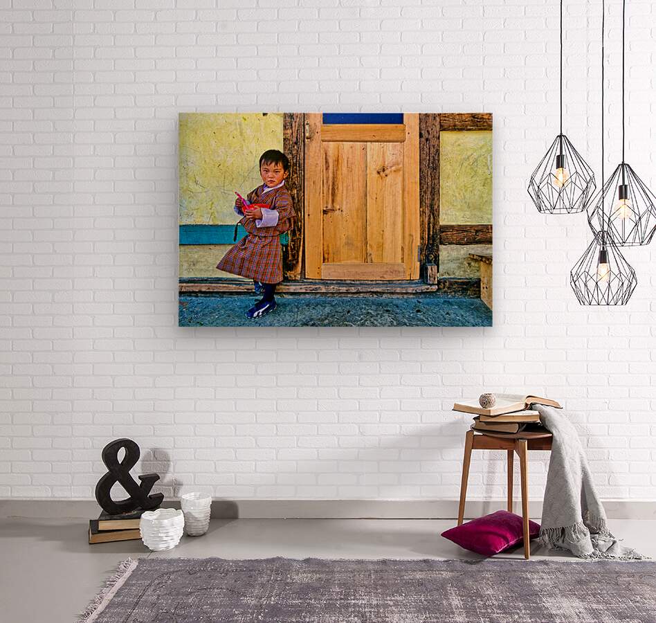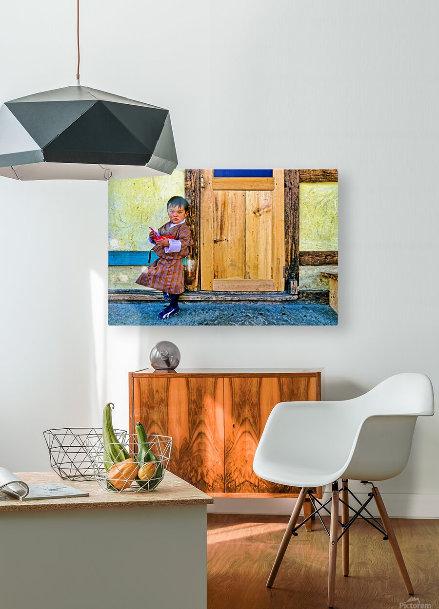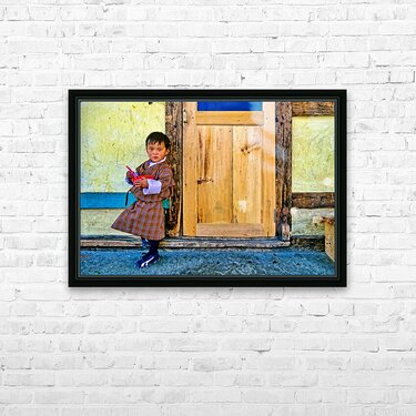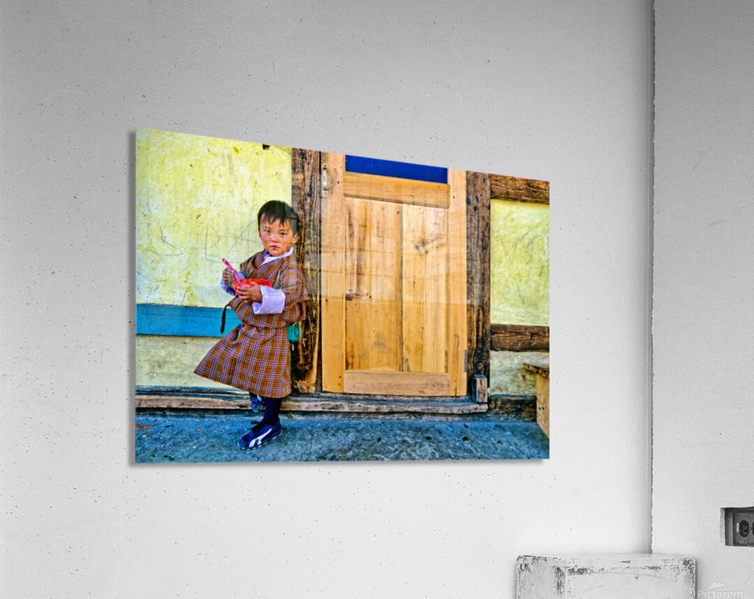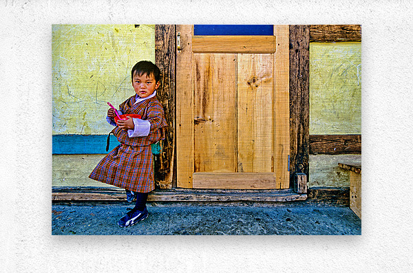 A young child in traditional Bhutanese dress holds a pink spoon and red bowl standing by a rustic wooden door and yellow wall perhaps in Bhutan.