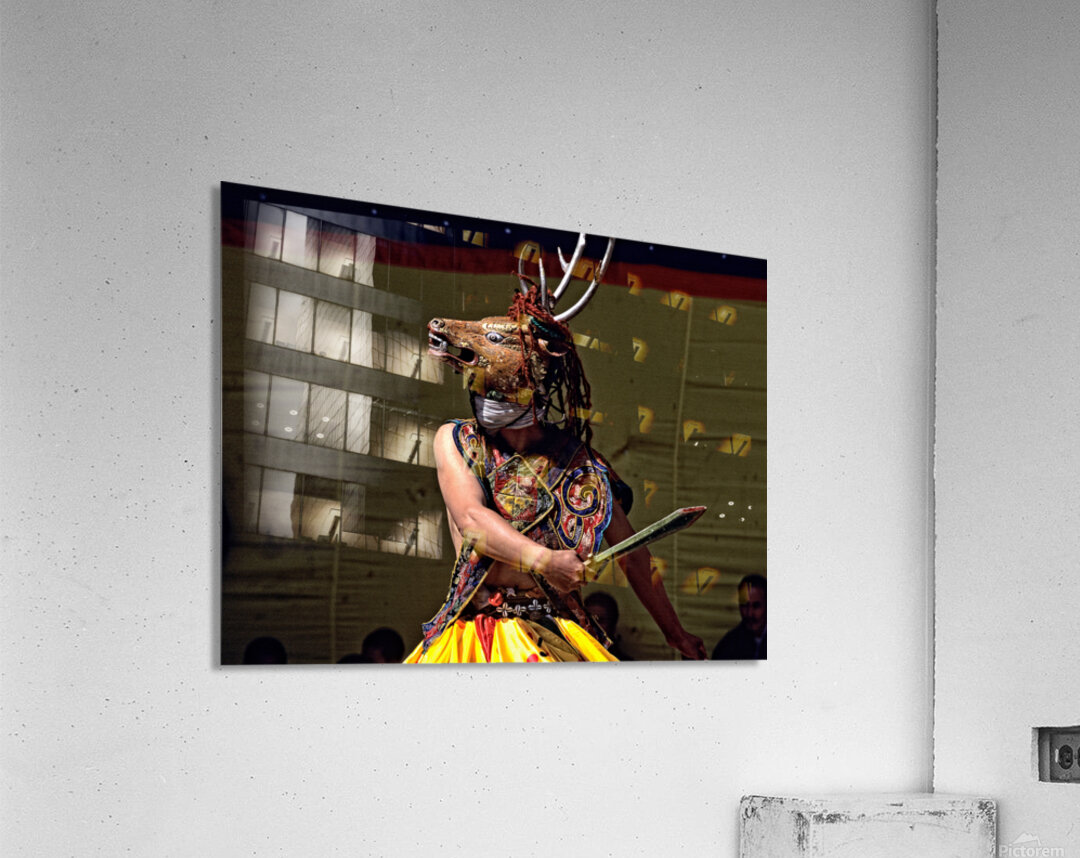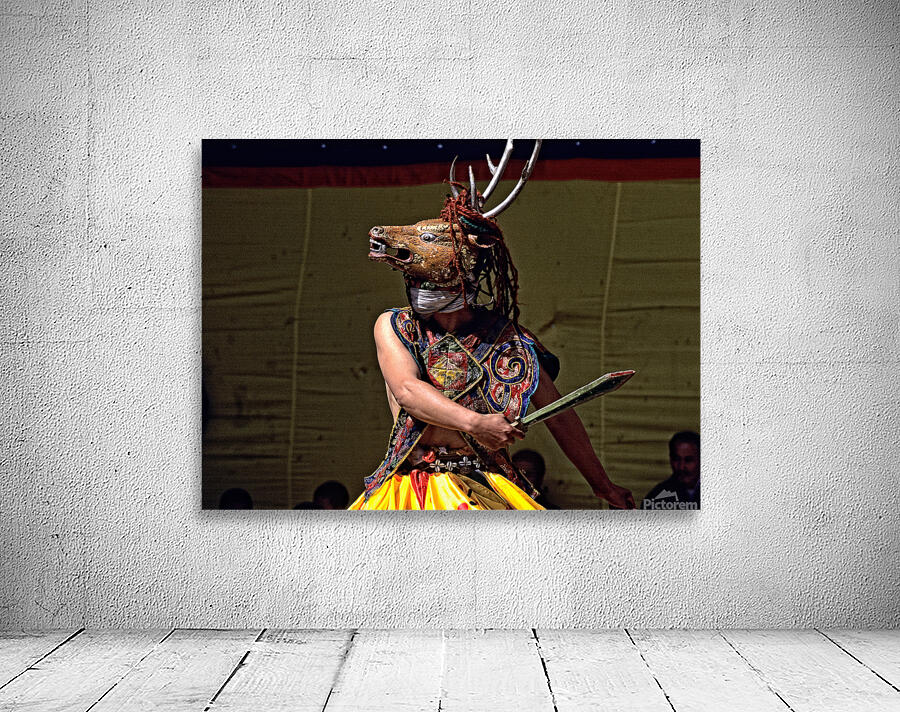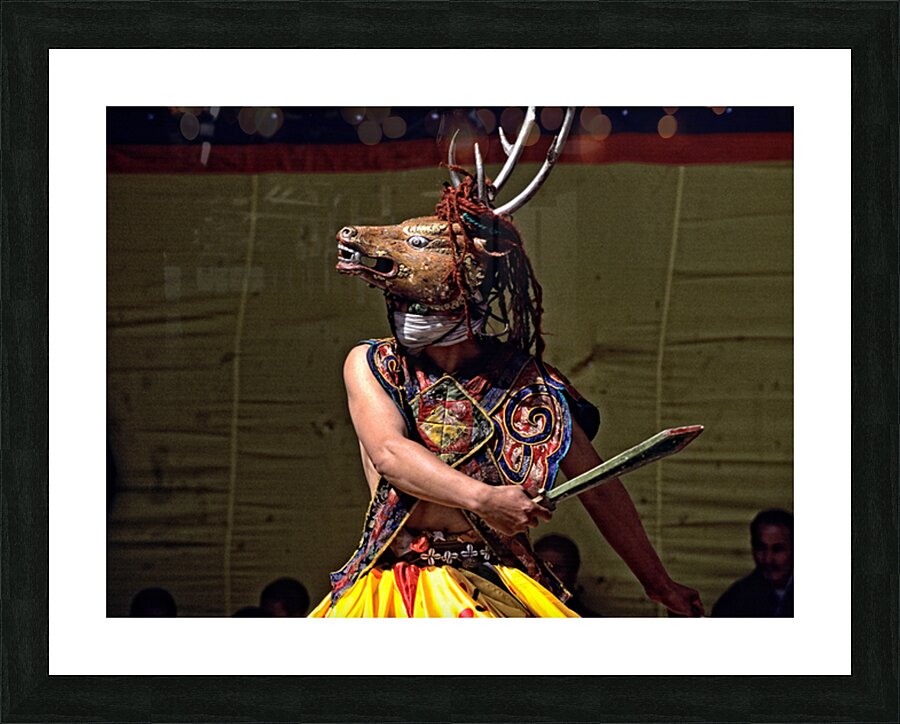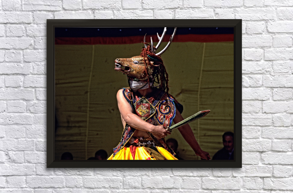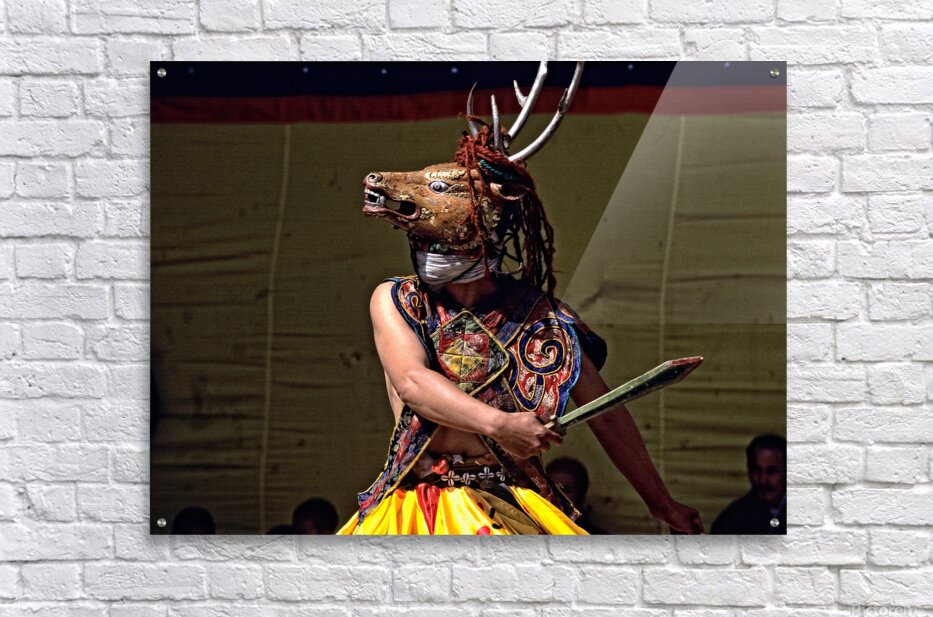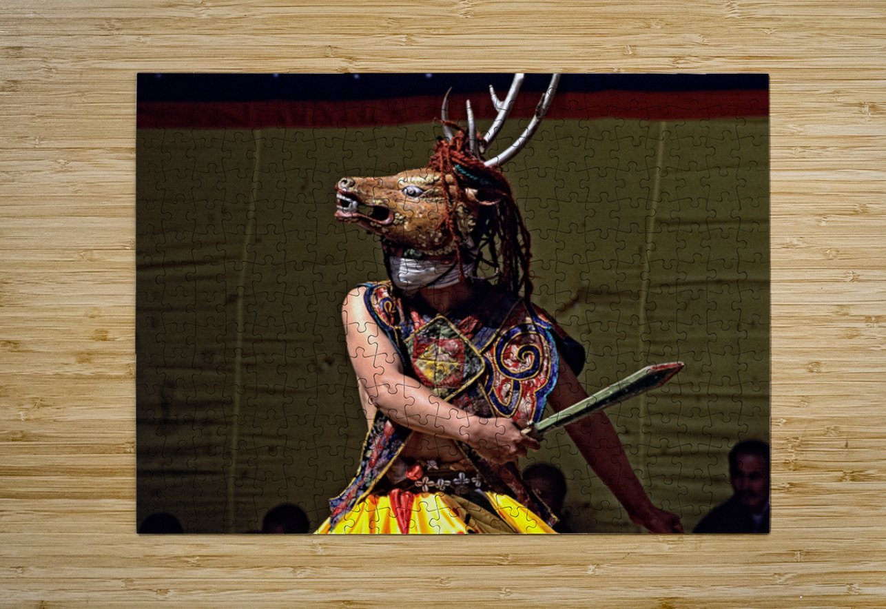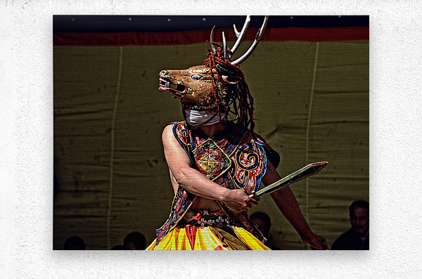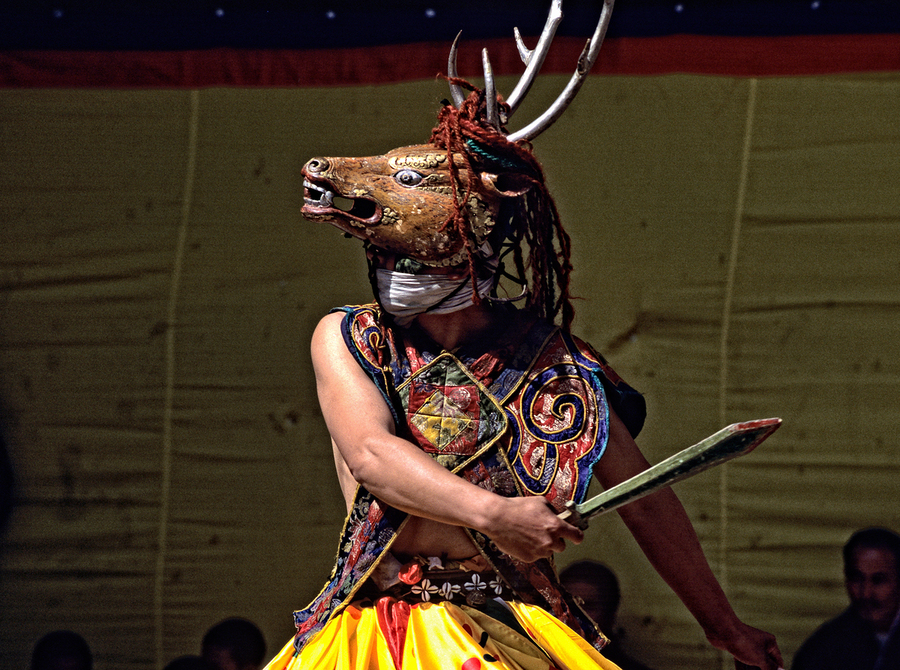 A performer in a traditional deer mask and vibrant costume holds a ceremonial sword during a cultural dance likely a Cham dance from Bhutan or a simil