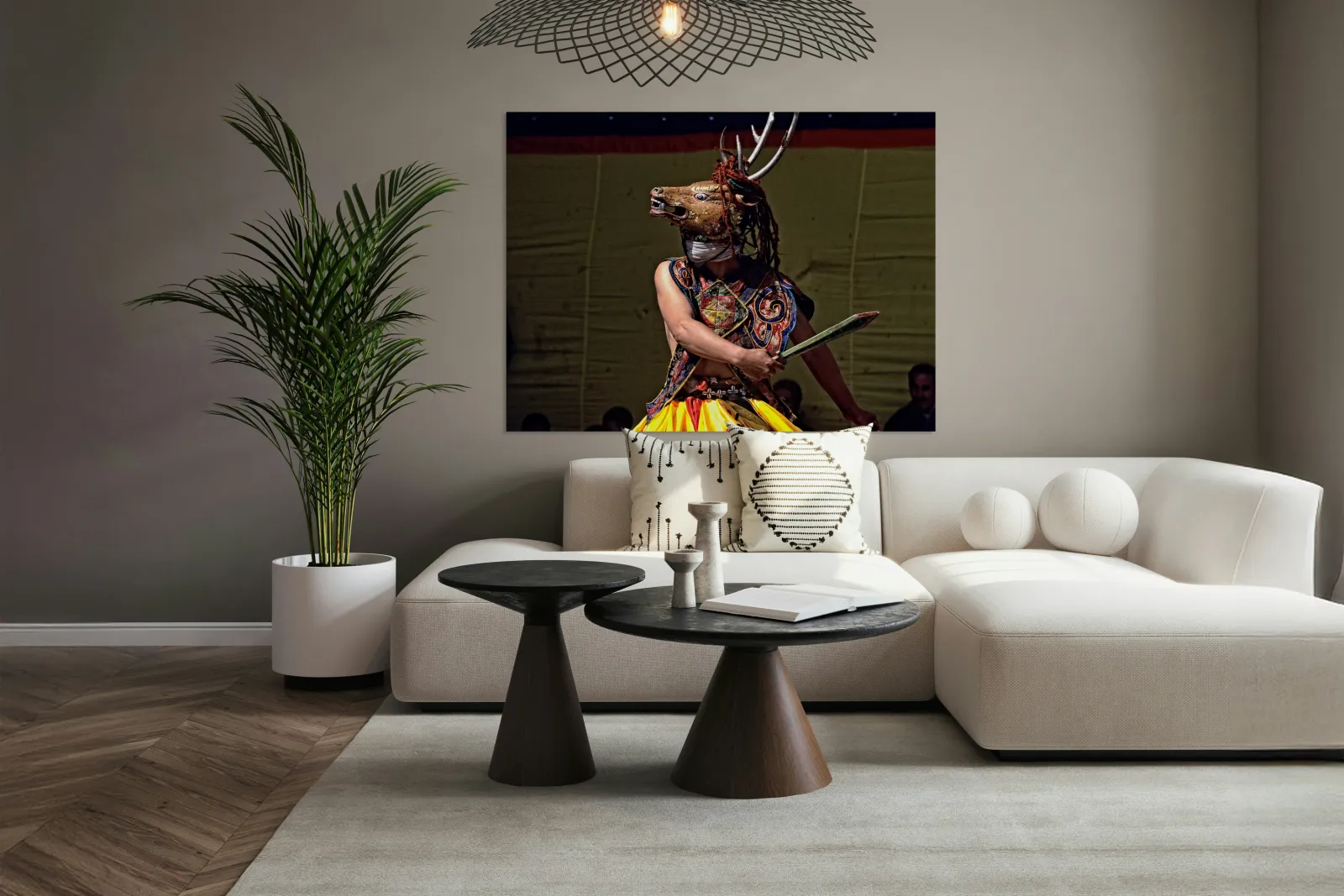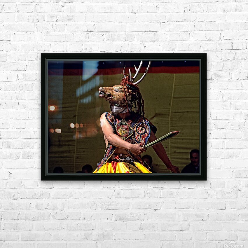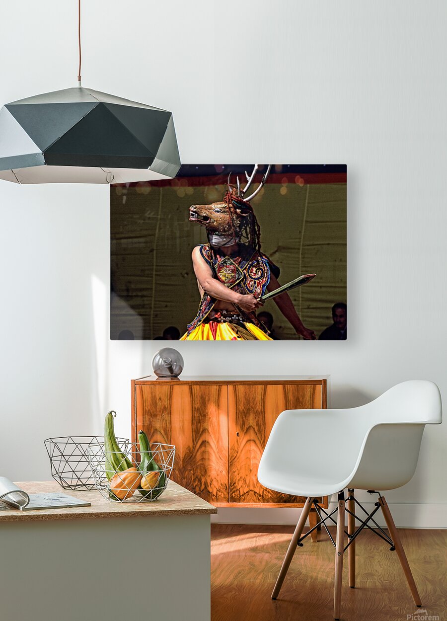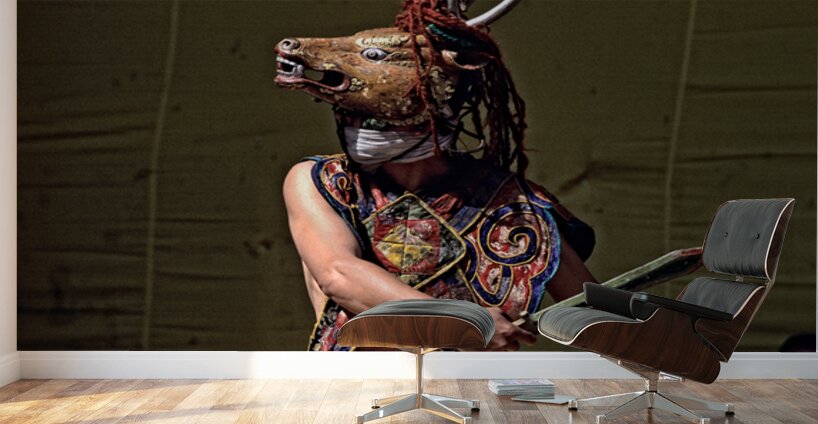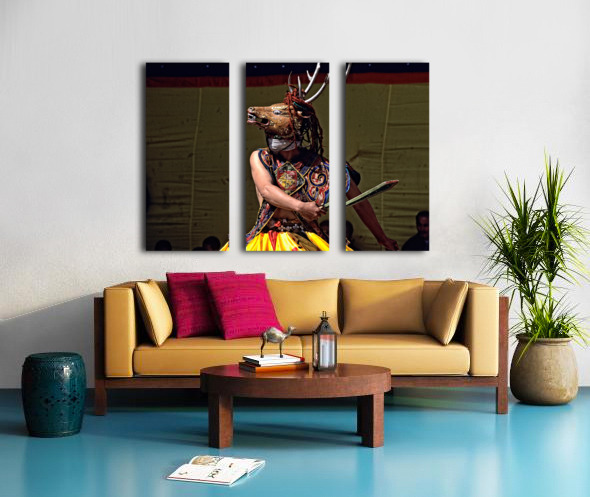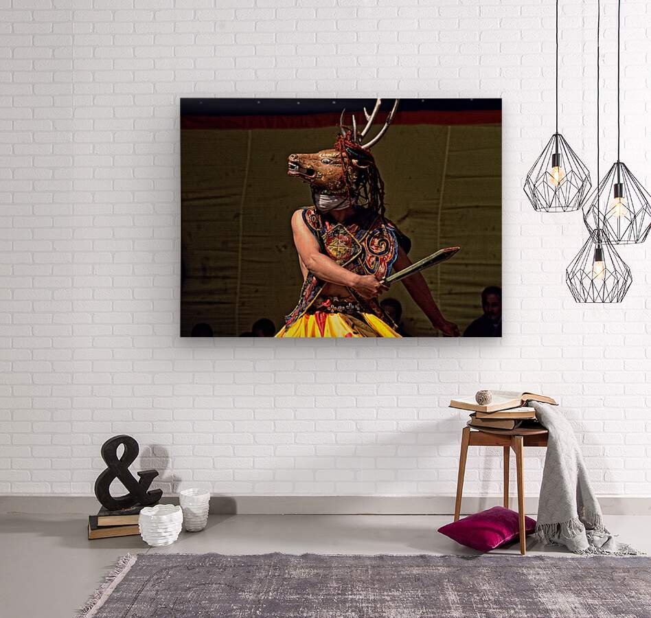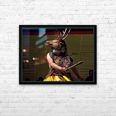 A performer in a traditional deer mask and vibrant costume holds a ceremonial sword during a cultural dance likely a Cham dance from Bhutan or a simil