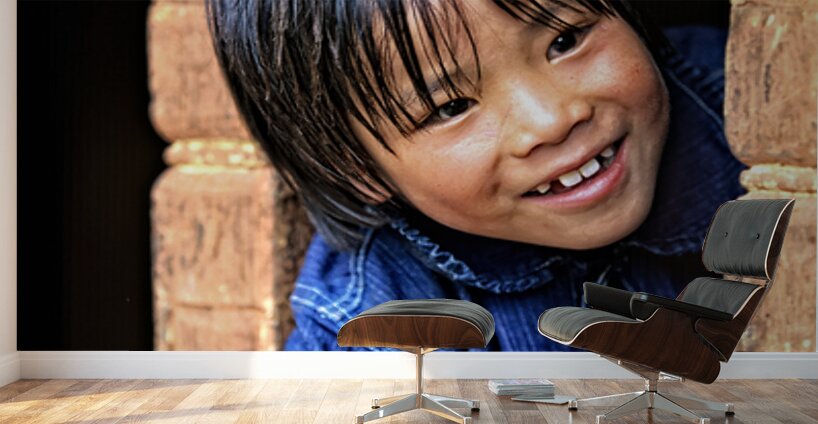A cheerful young child with dark hair smiles brightly peeking out from a carved wooden window frame expressing innocent joy.