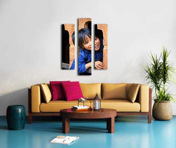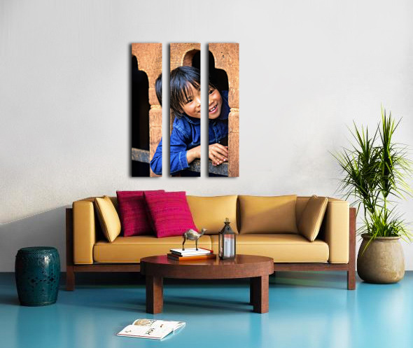 Smiling child peeking from a wooden window. Frame print