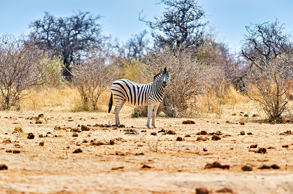 A zebra stands on dry land in Etosha National Park Namibia. Surrounding bushes and trees add to the natural setting of the area.