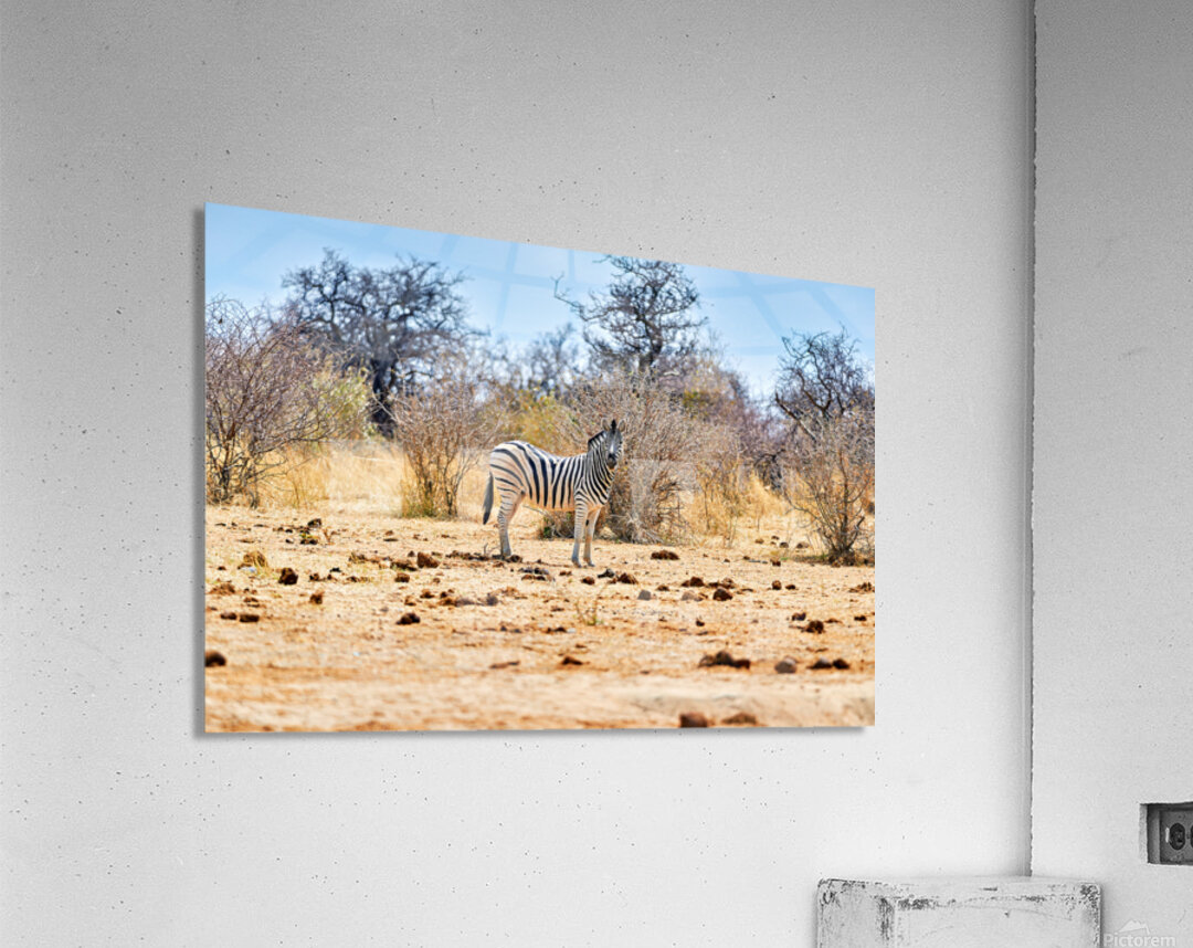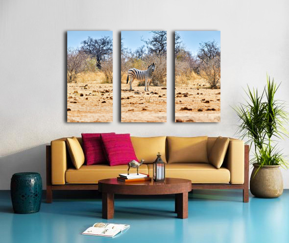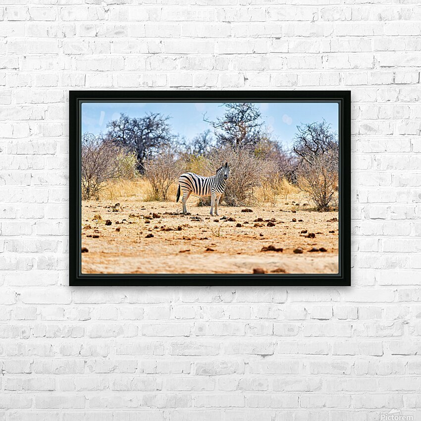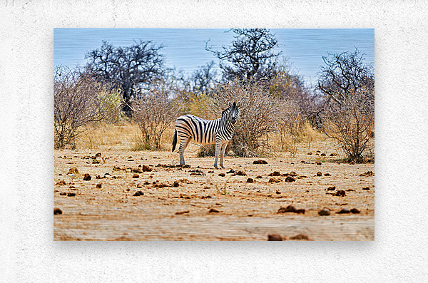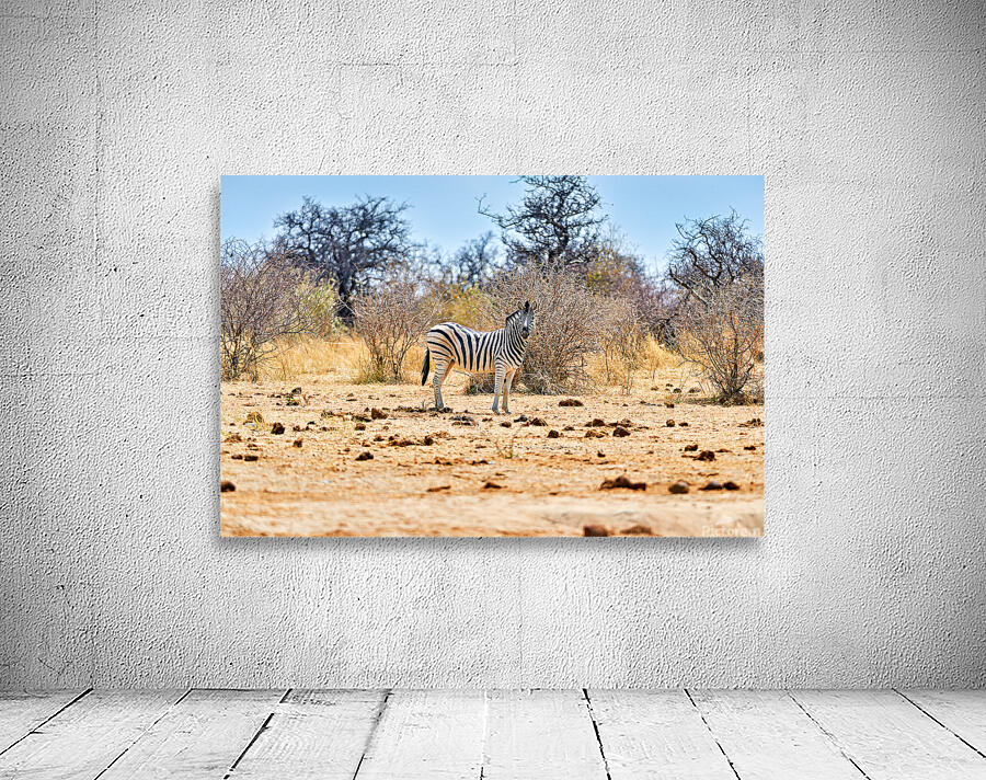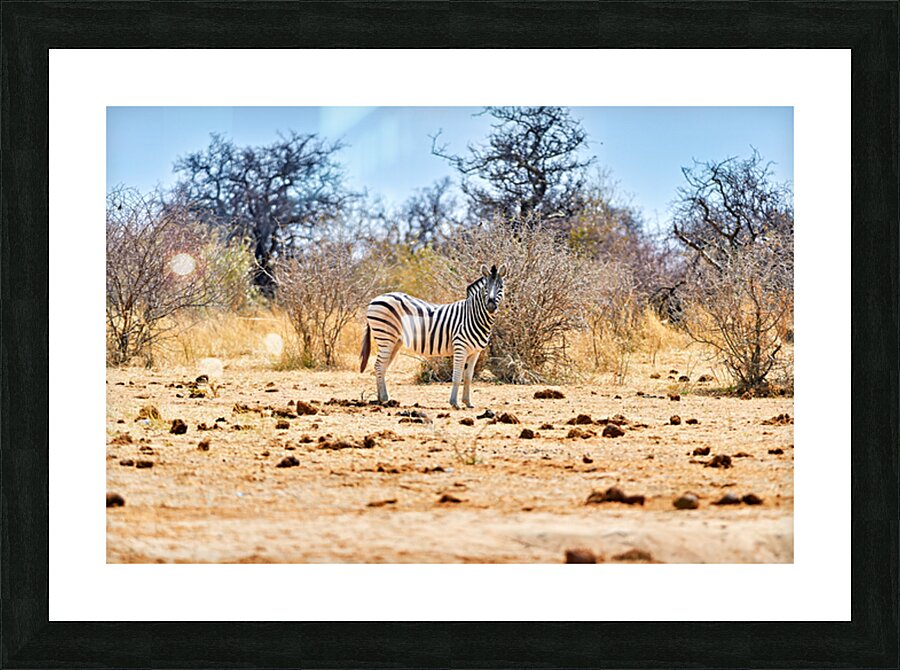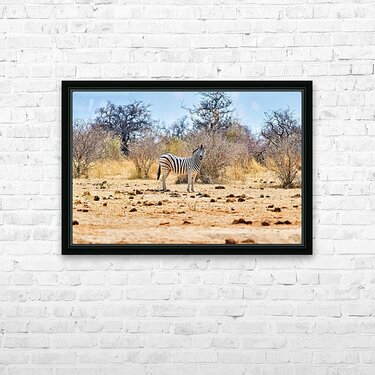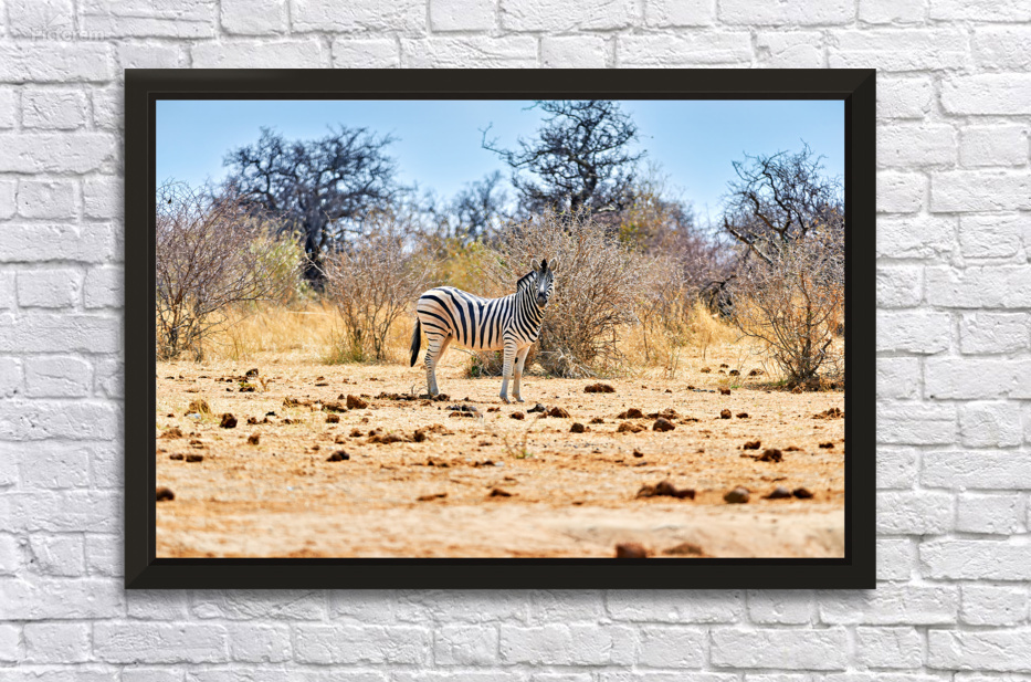 "A zebra stands on dry land in Etosha National Park Namibia" in a framed print.
