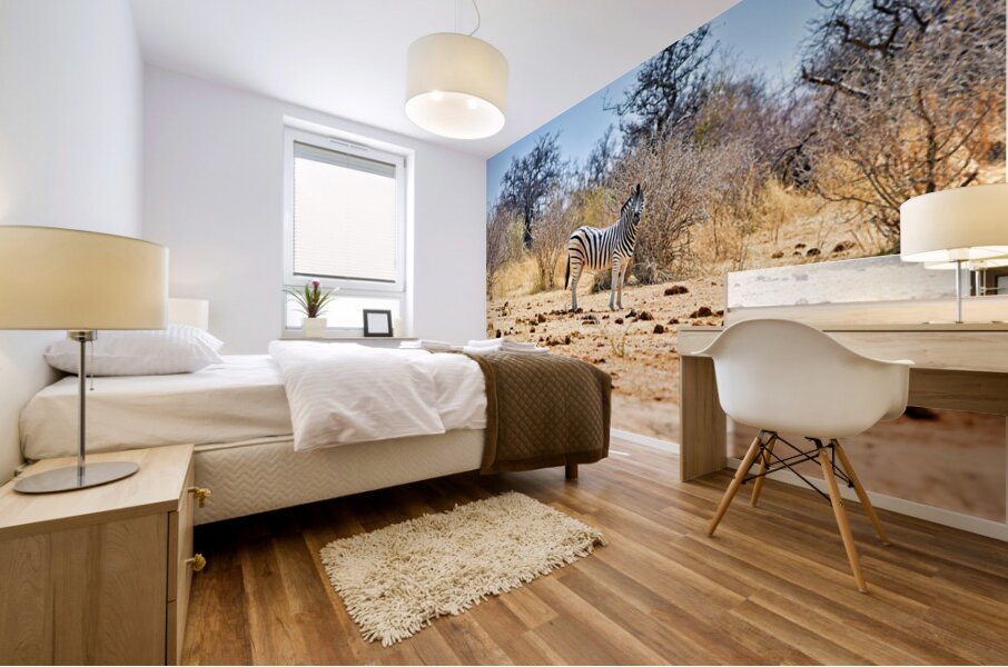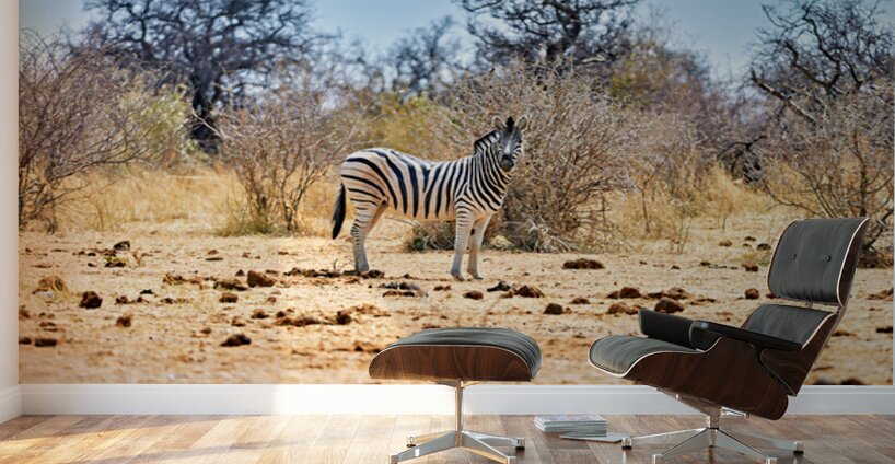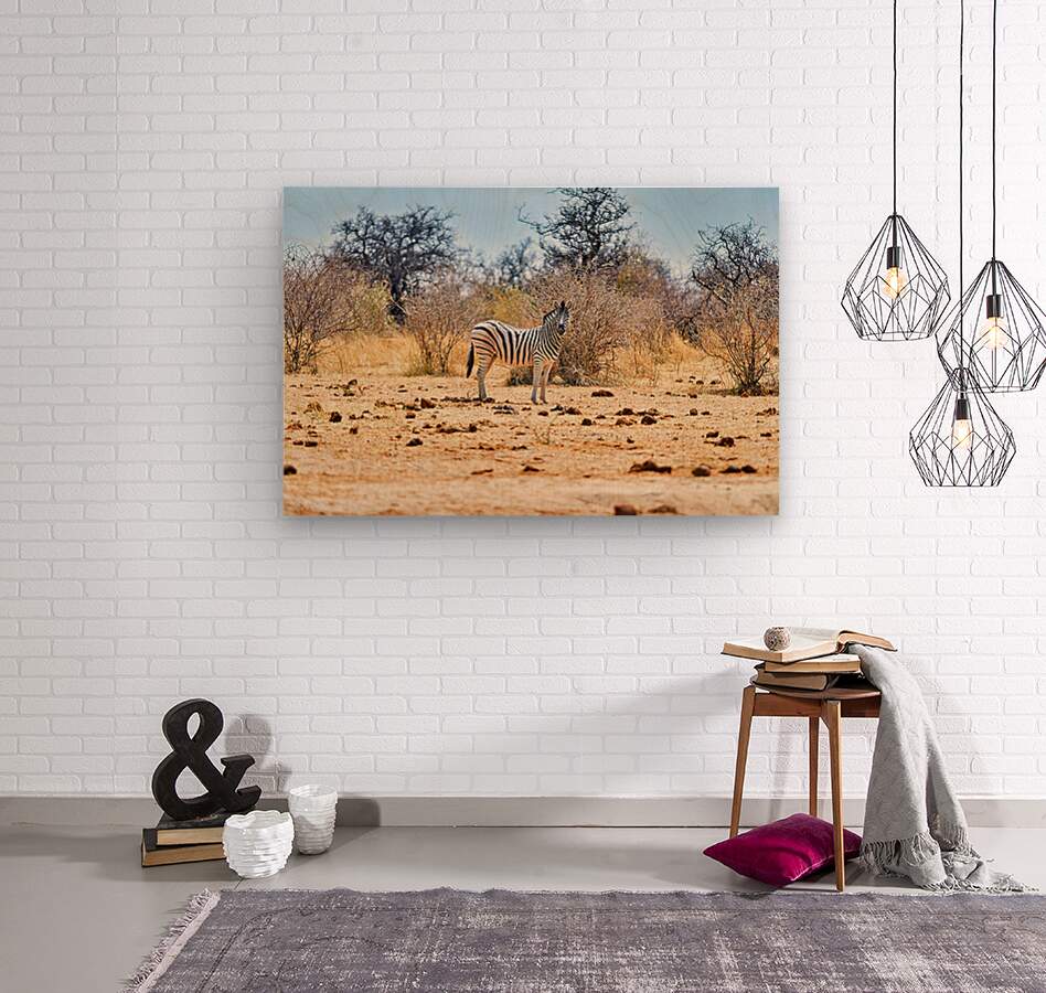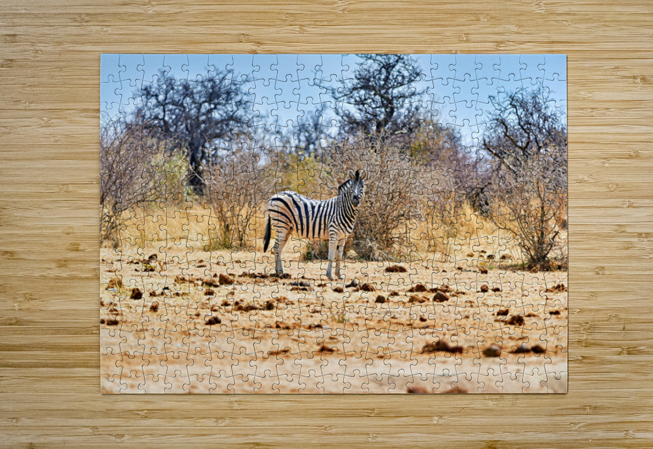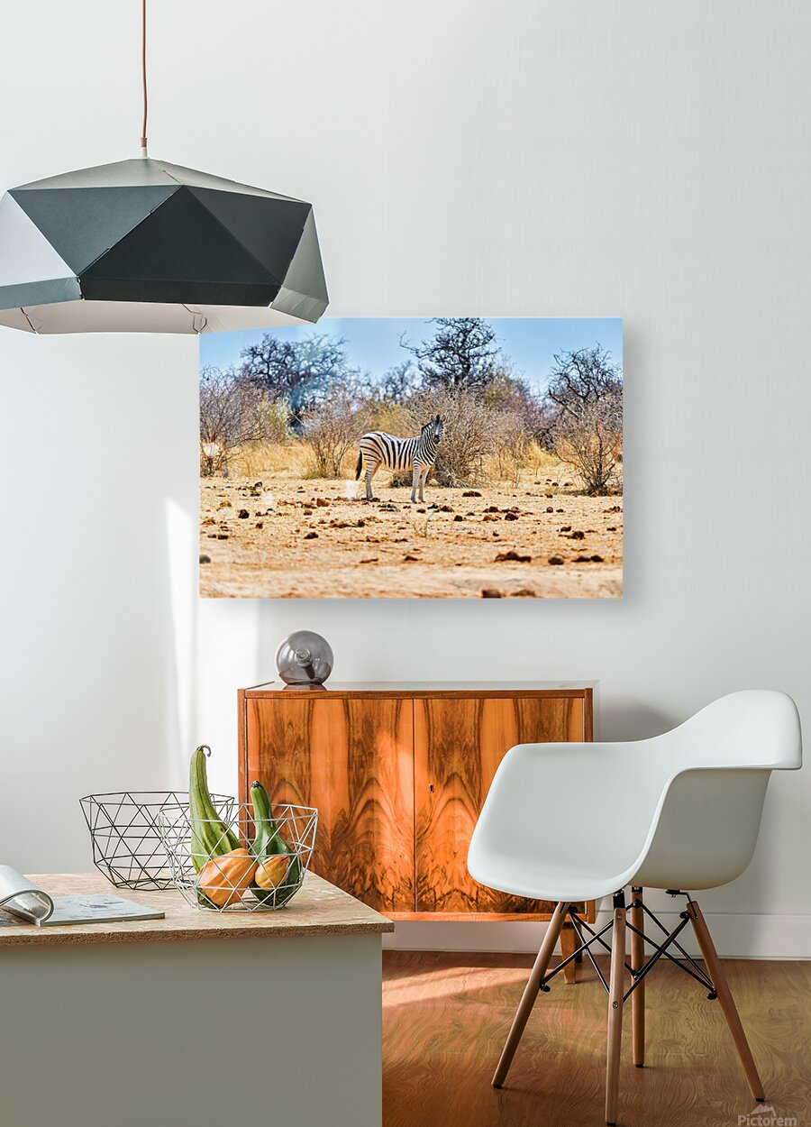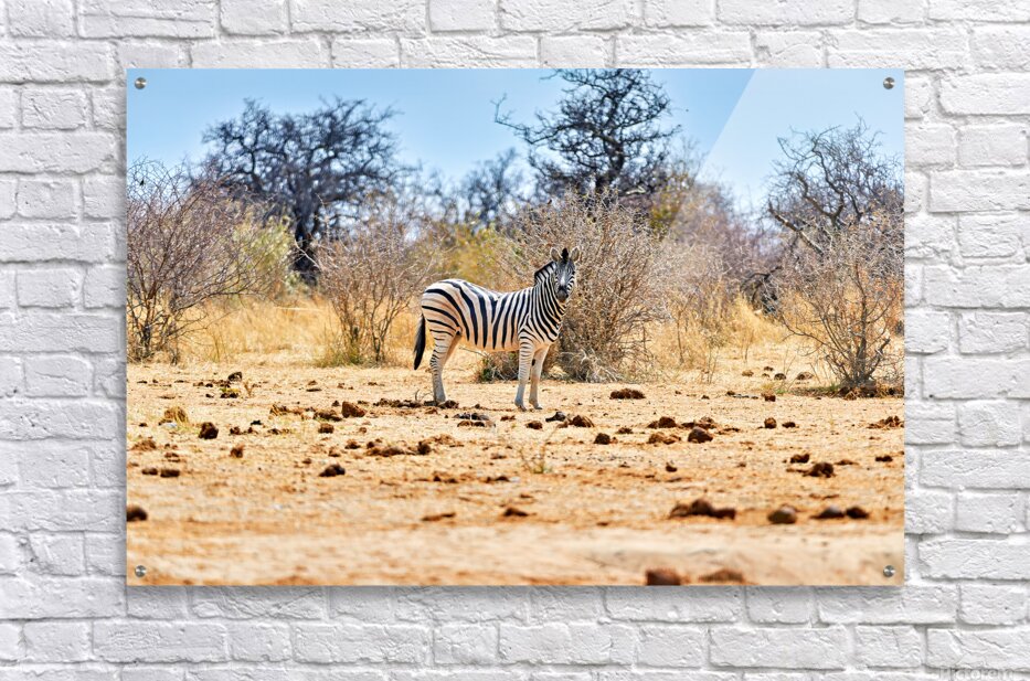 "A zebra stands on dry land in Etosha National Park Namibia" in a framed print.