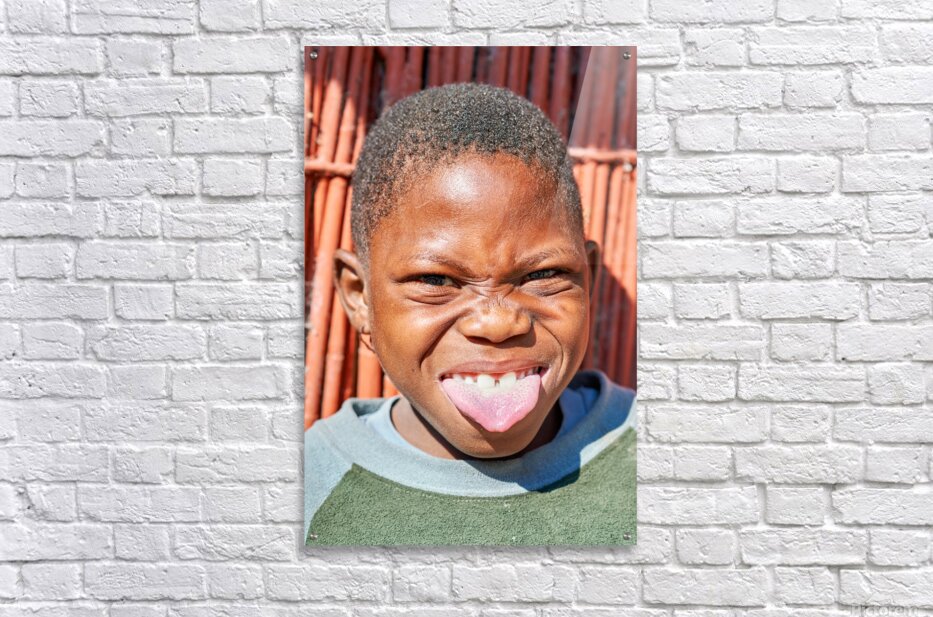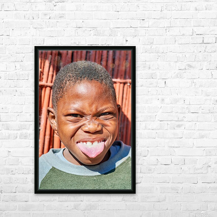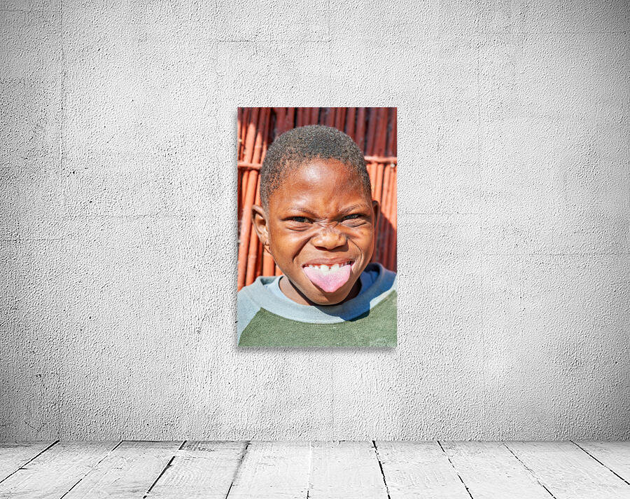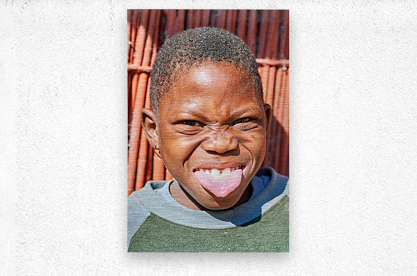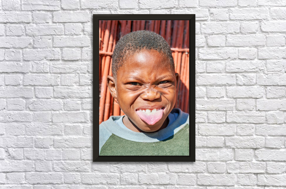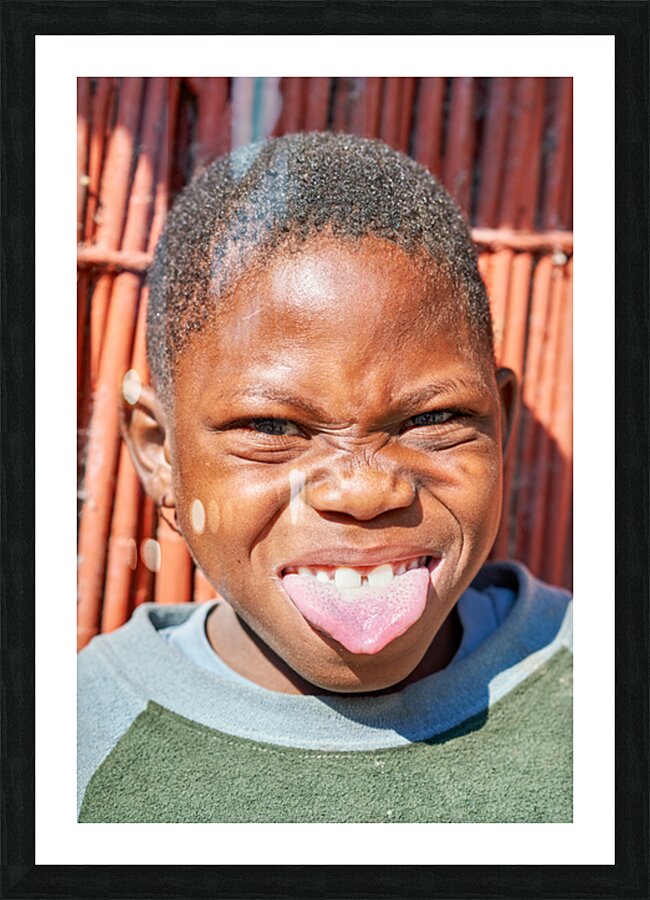 "Joyful child shows playful expression in Kavango Region Namibia" in a framed print.
