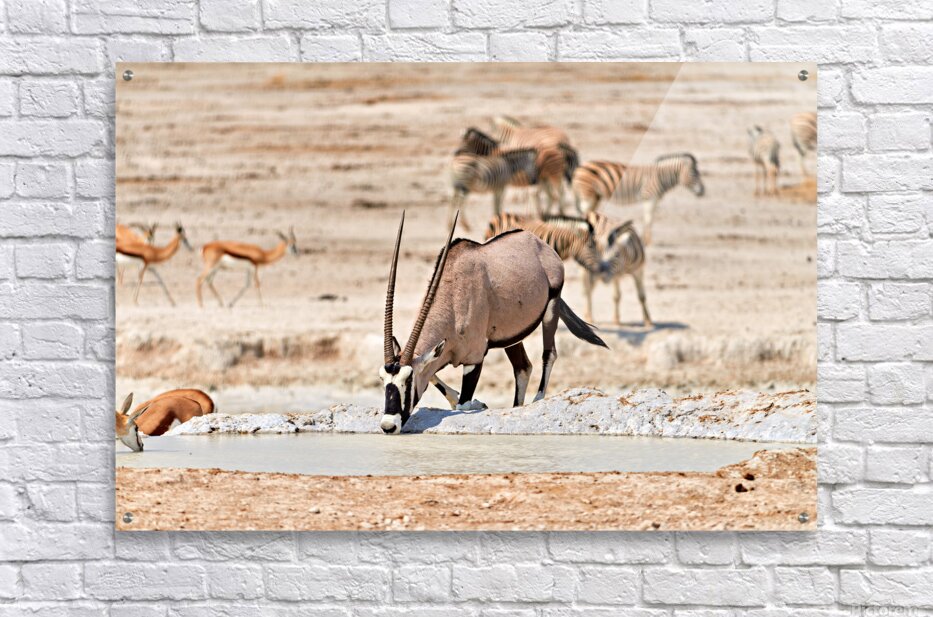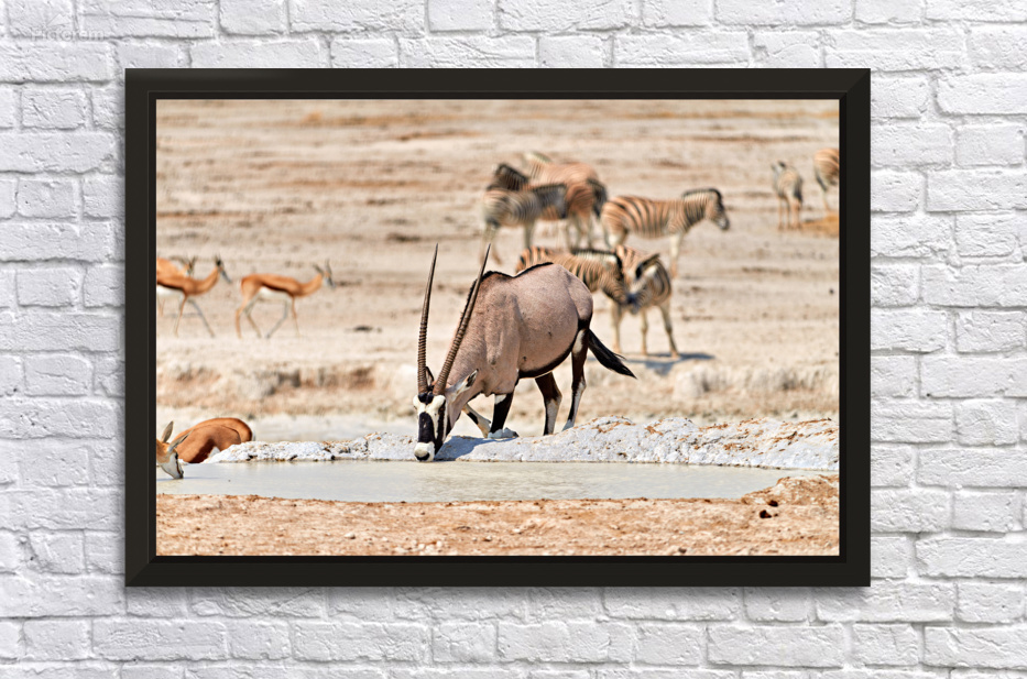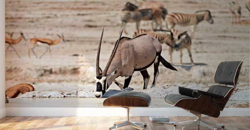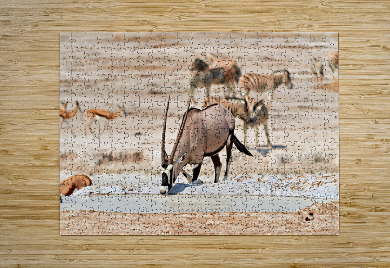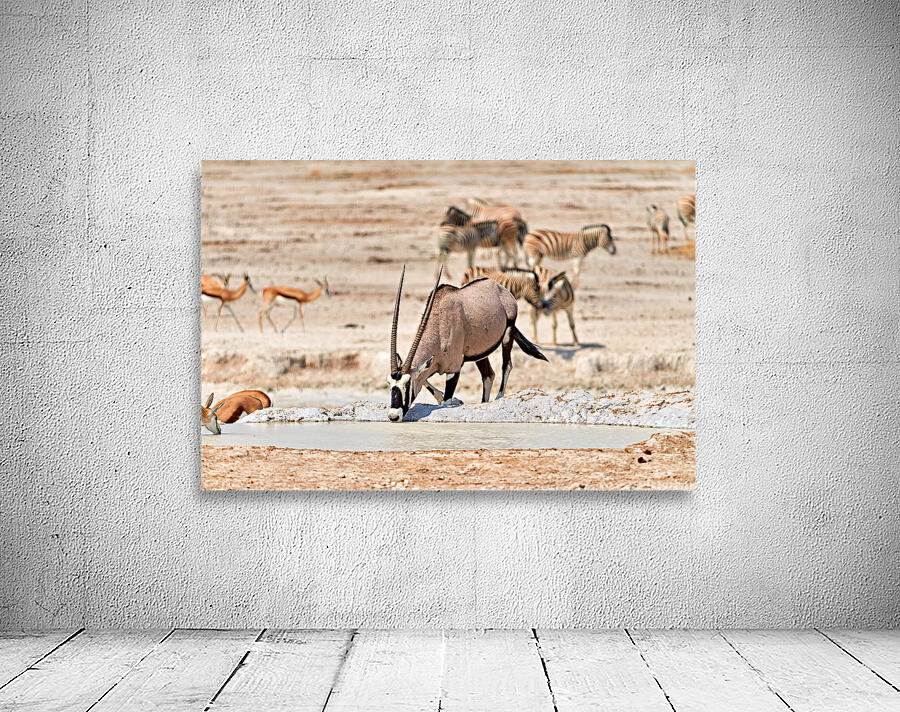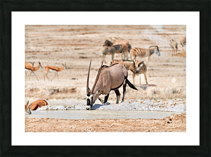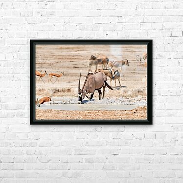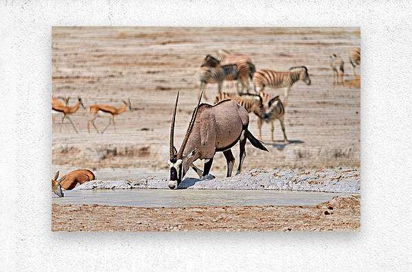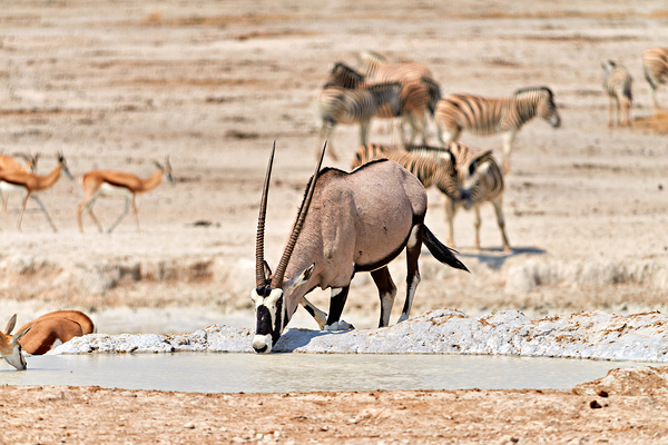 Gemsbok Oryx is drinking from a waterhole while other animals are nearby in Etosha National Park during the dry season.