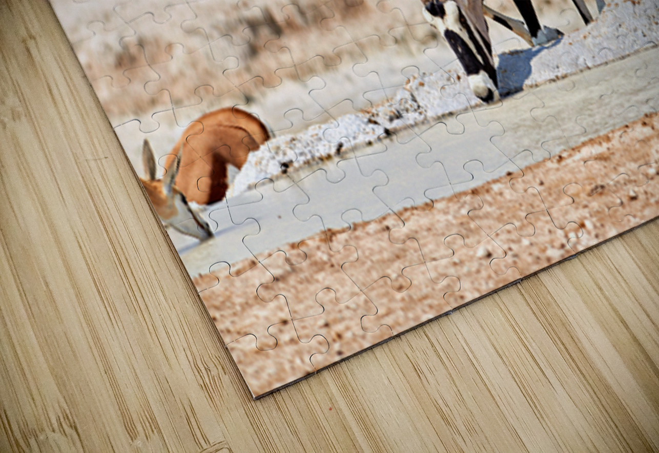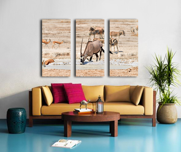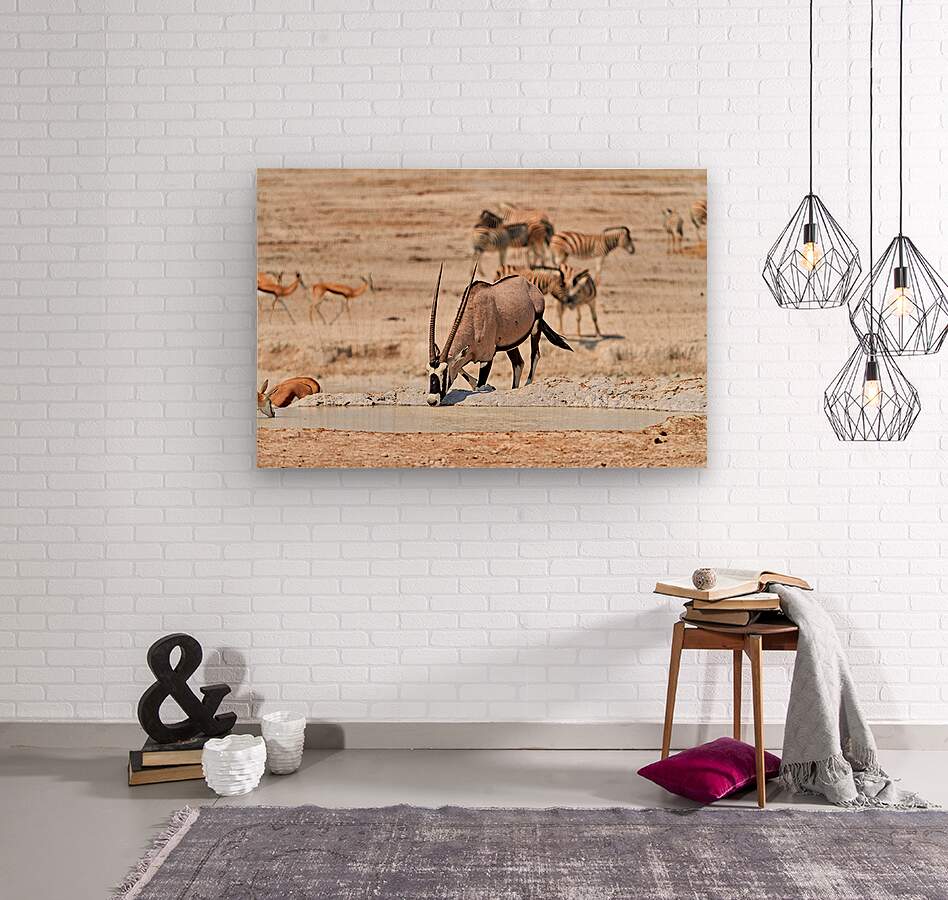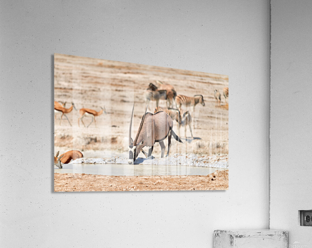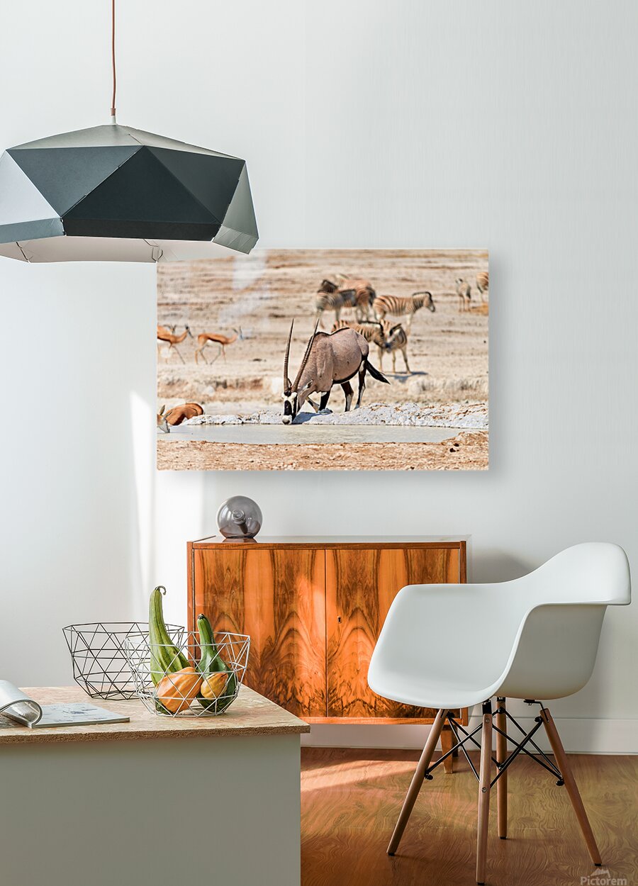 Gemsbok Oryx is drinking from a waterhole while other animals are nearby in Etosha National Park during the dry season.
