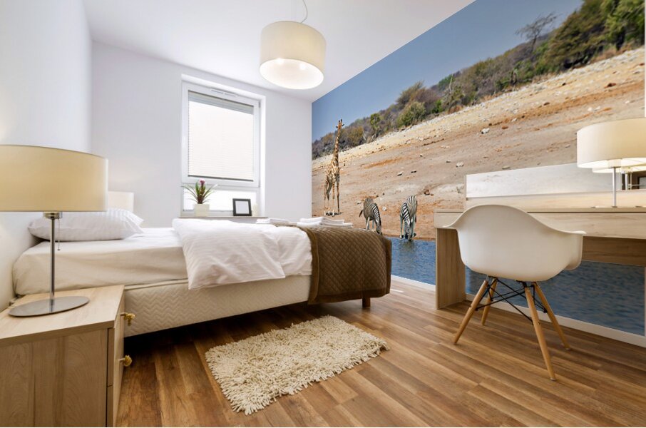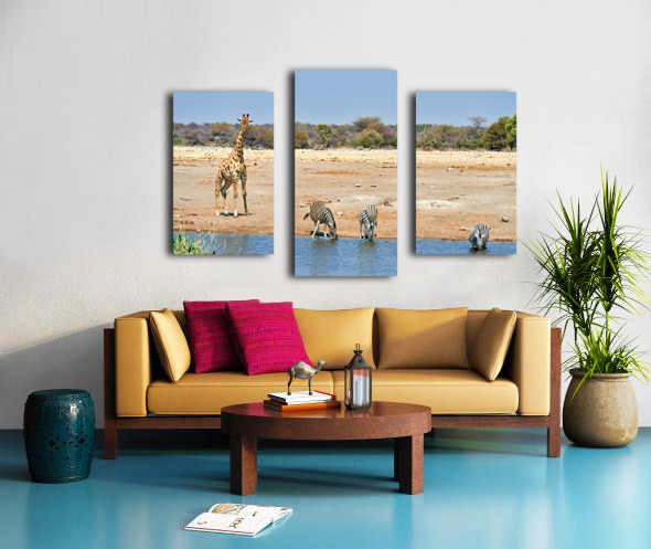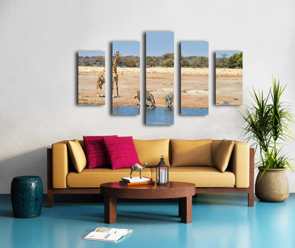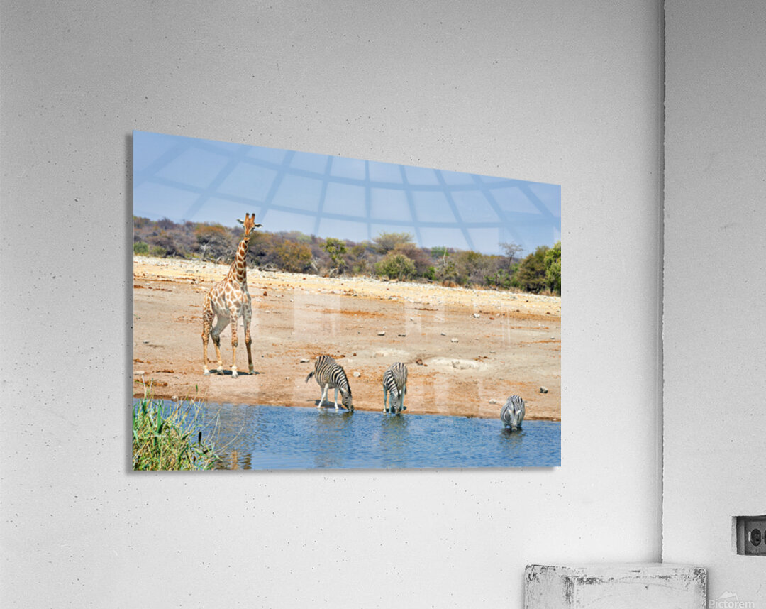 ABOUT THIS ARTWORK: GIRAFFE AND ZEBRAS DRINK WATER TOGETHER AT A WATERHOLE IN NAMIBI