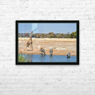 Get this artwork "Giraffe and zebras drink water together at a waterhole in Namibi" in a framed print.