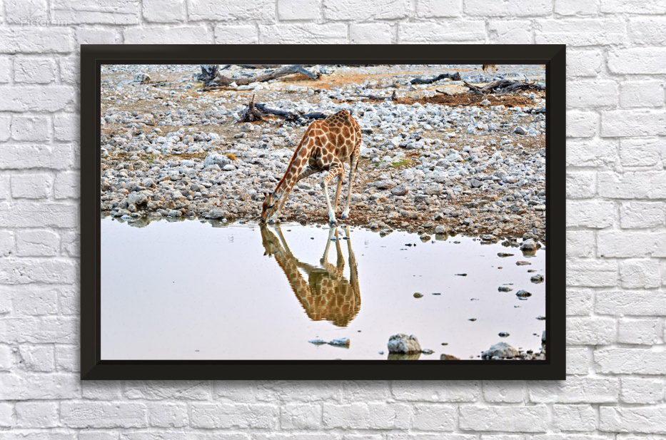 A giraffe bends down to drink water from a waterhole in Etosha National Park. The scene shows wildlife in a natural setting.