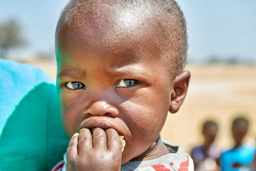 A boy stands in the Kavango Region of Namibia. He seems to be lost in thought while holding food. Other children are visible in the background.