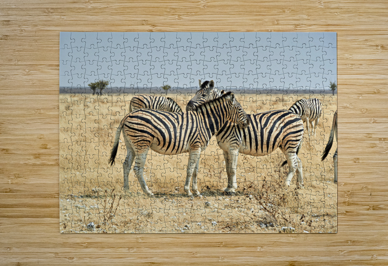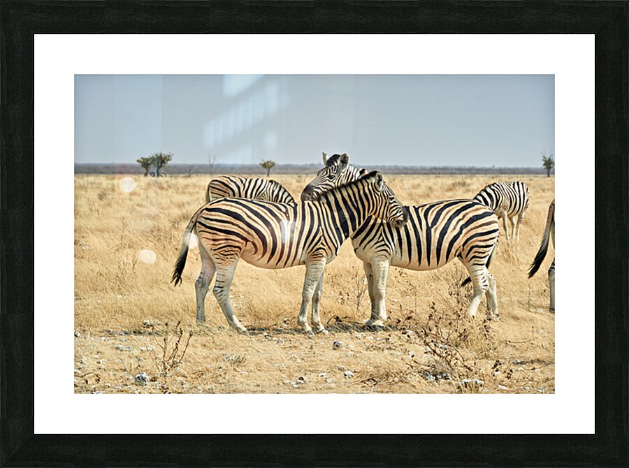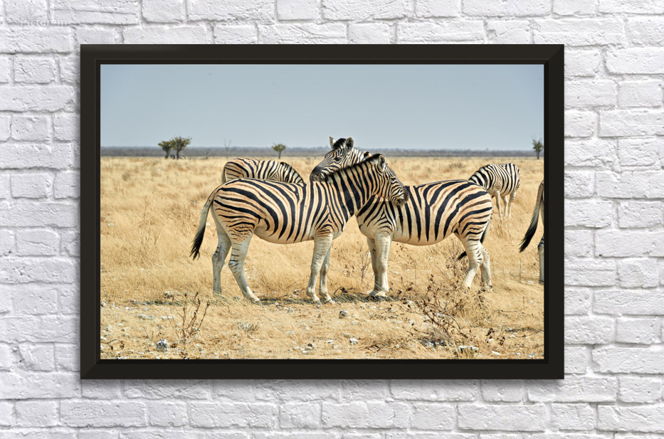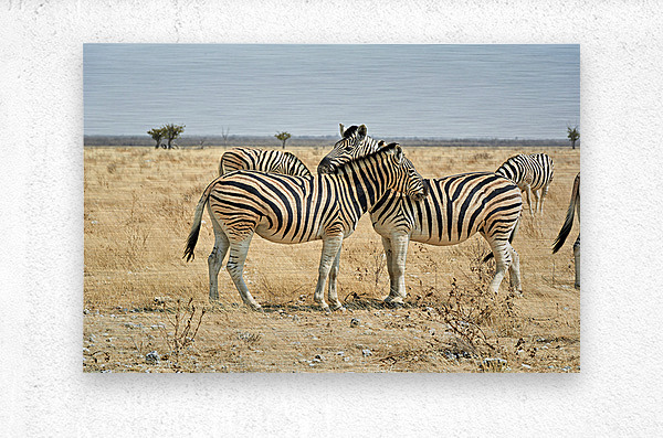 Two zebras are close together in the wild showing affection in Etosha National Park during the day in Namibia.