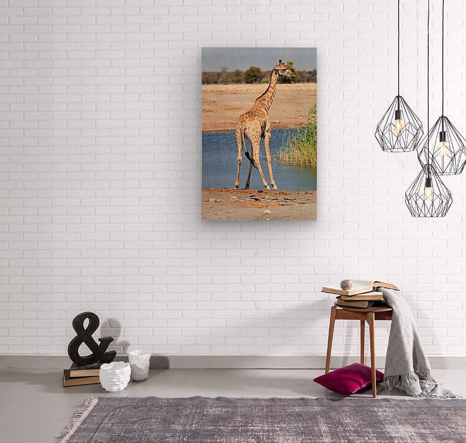 A giraffe stands nearby a waterhole in Etosha National Park Namibia bending down to drink water. The sun shines on the dry landscape.