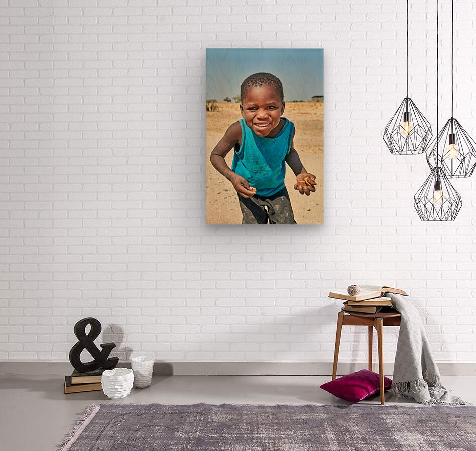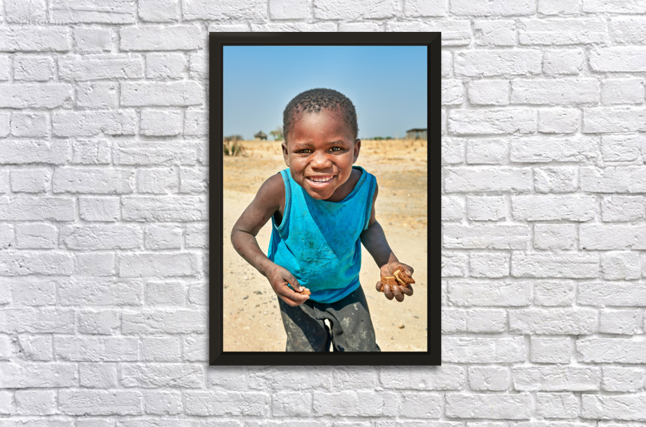 A boy smiles widely while holding pieces of food. The scene captures a sunny day in the Kavango Region of Namibia.