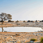 Zebras gather at a waterhole in Etosha National Park Namibia to drink water during the day. Surrounding land is dry and bare.
