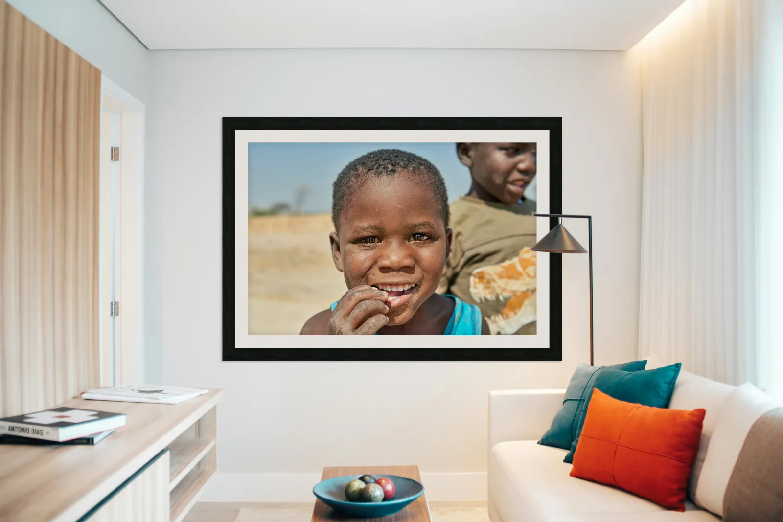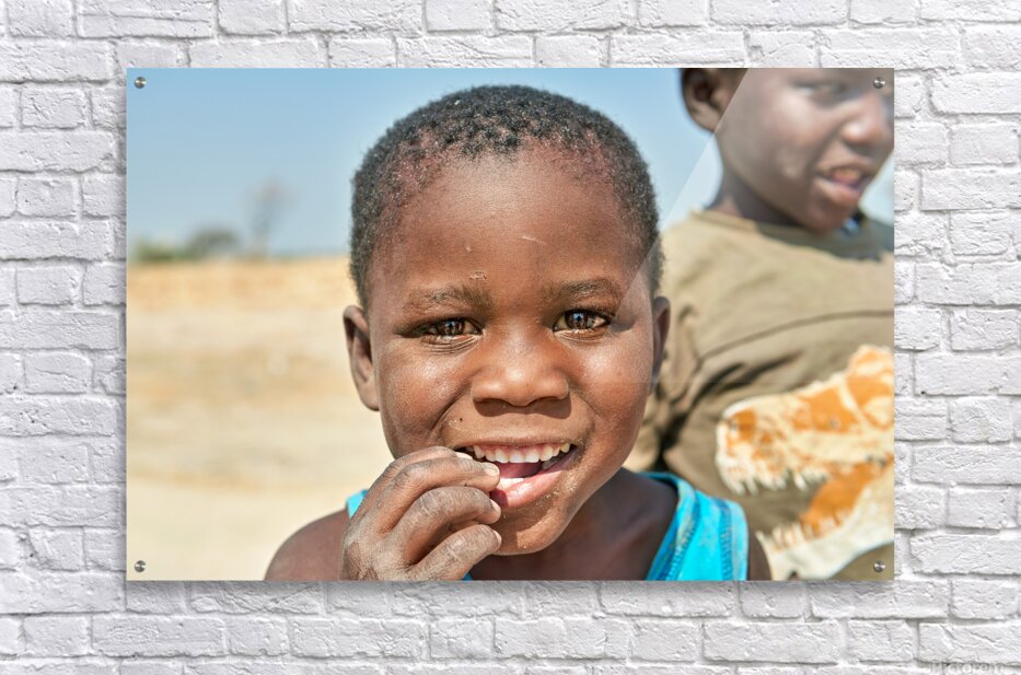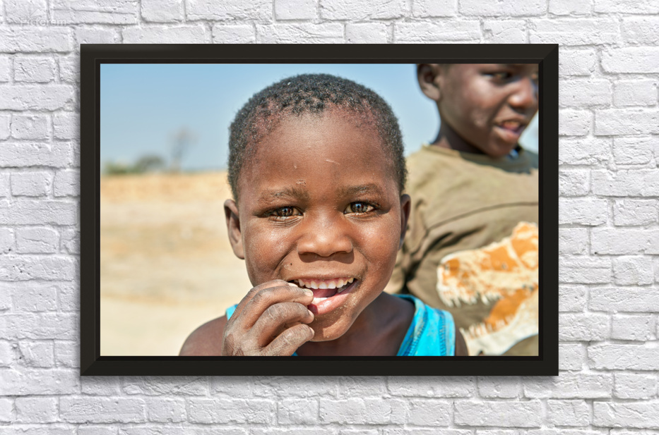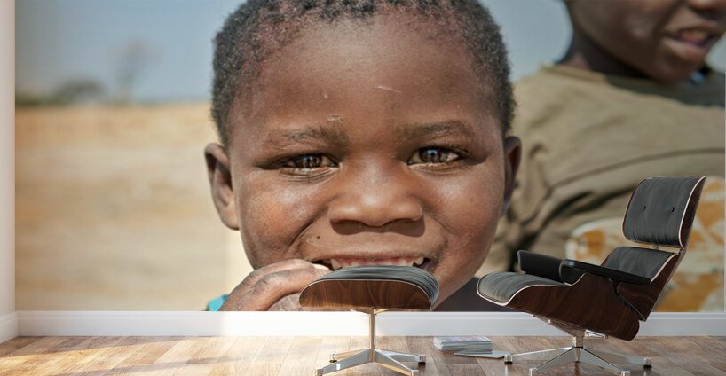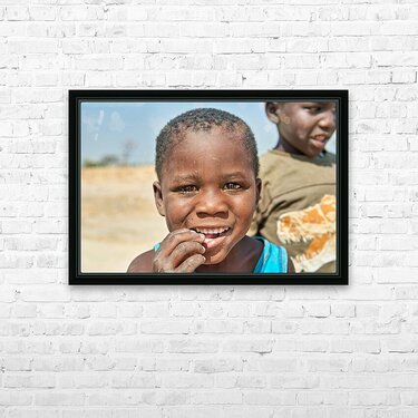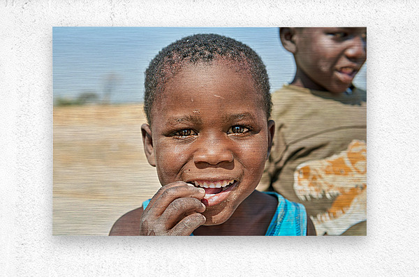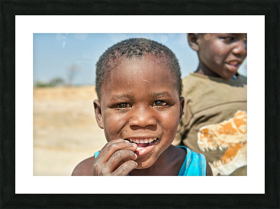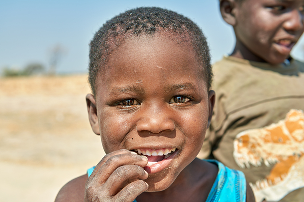 A boy shows joy while smiling in Kavango Region. There is another child behind him. The sun shines bright during the day.