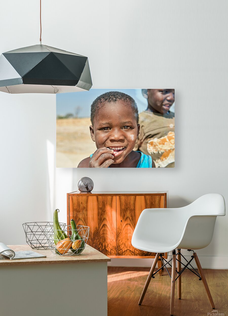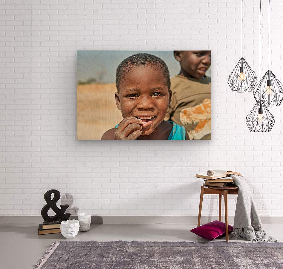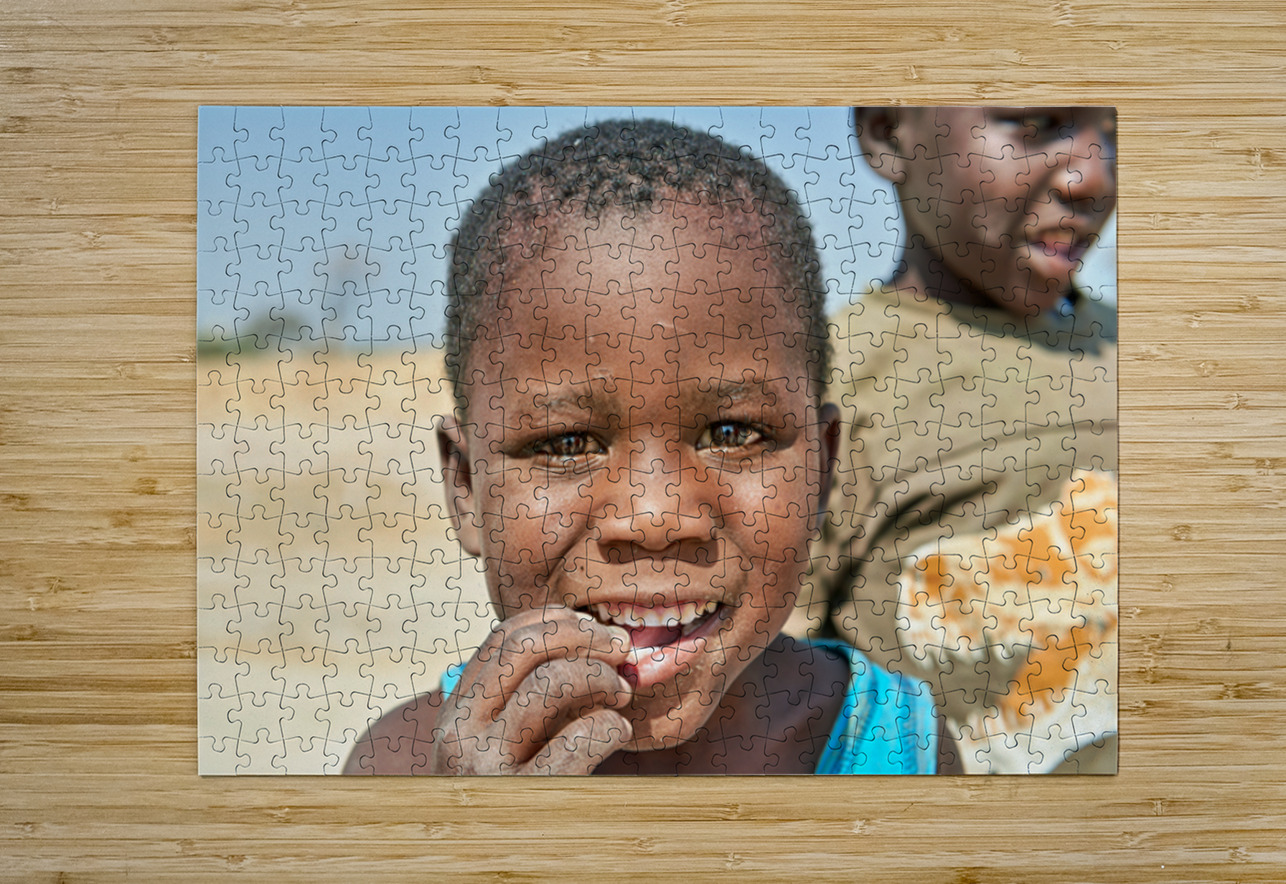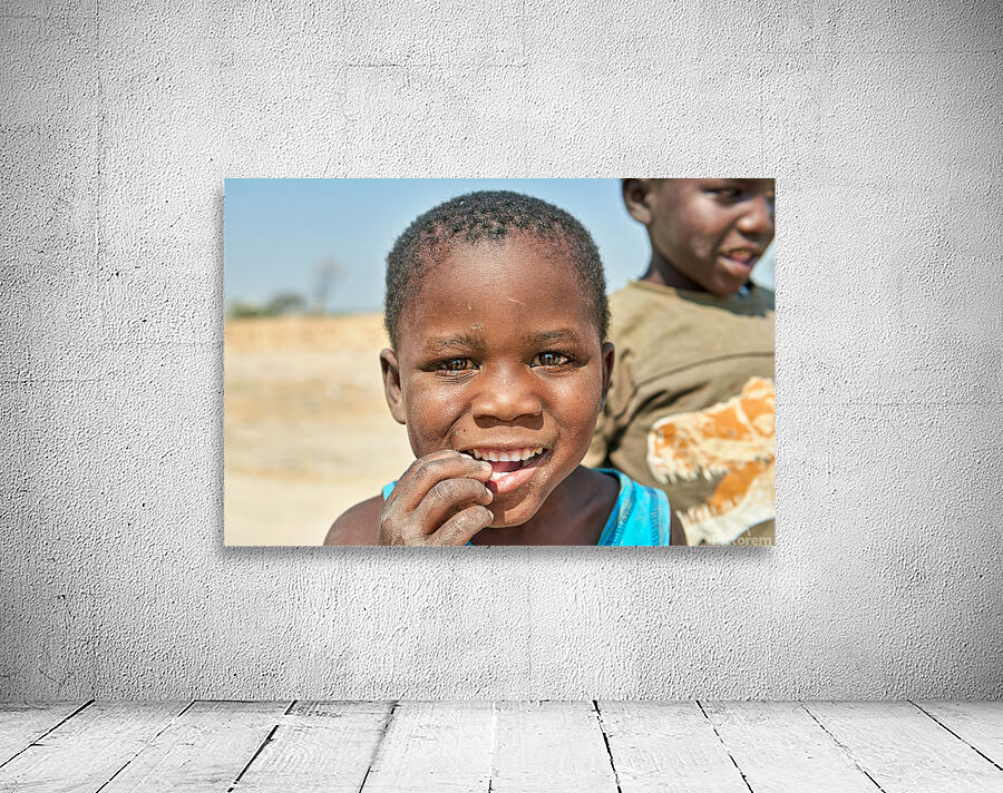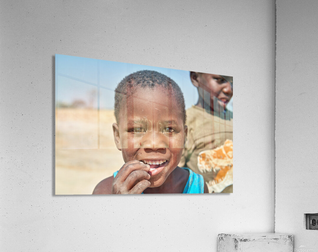 A boy shows joy while smiling in Kavango Region. There is another child behind him. The sun shines bright during the day.