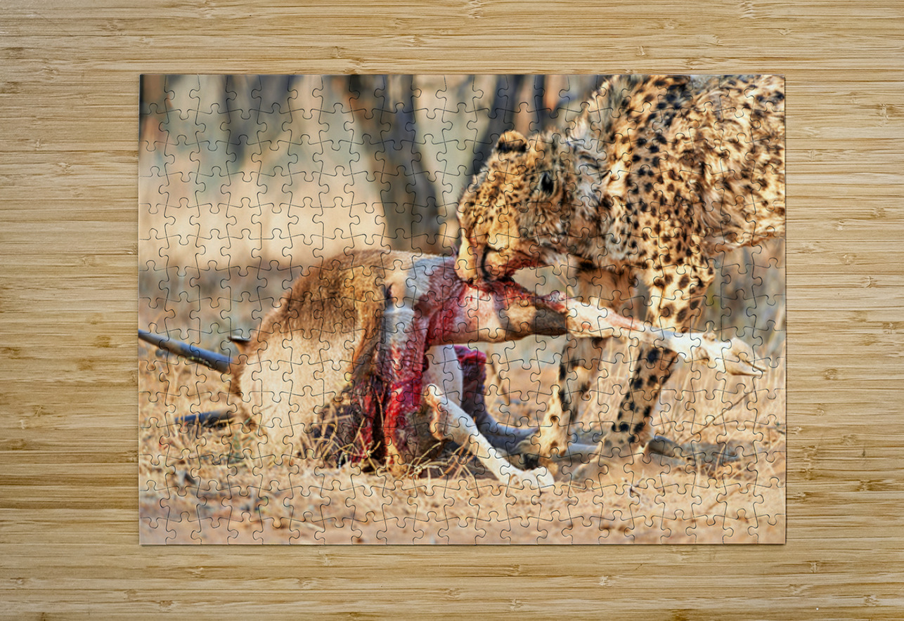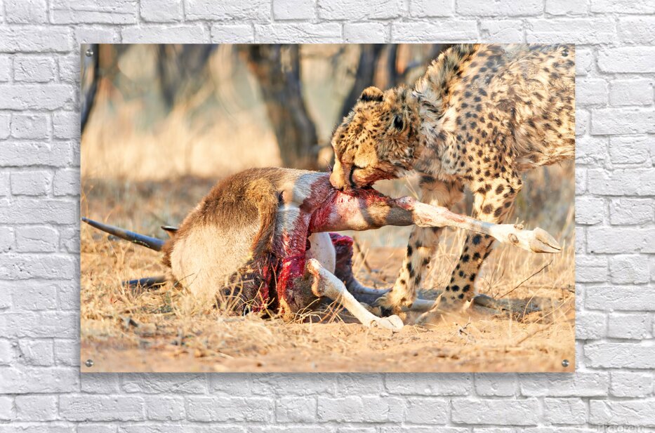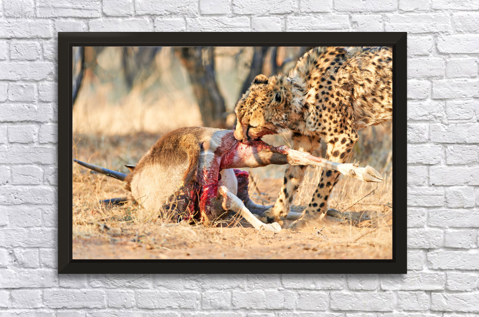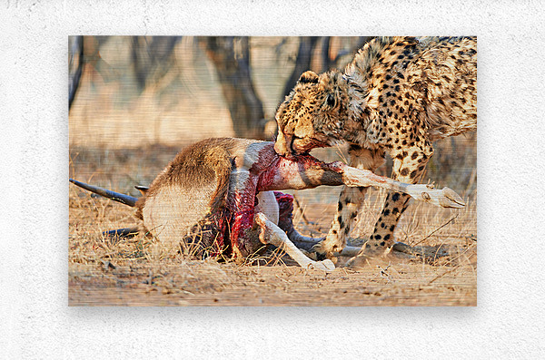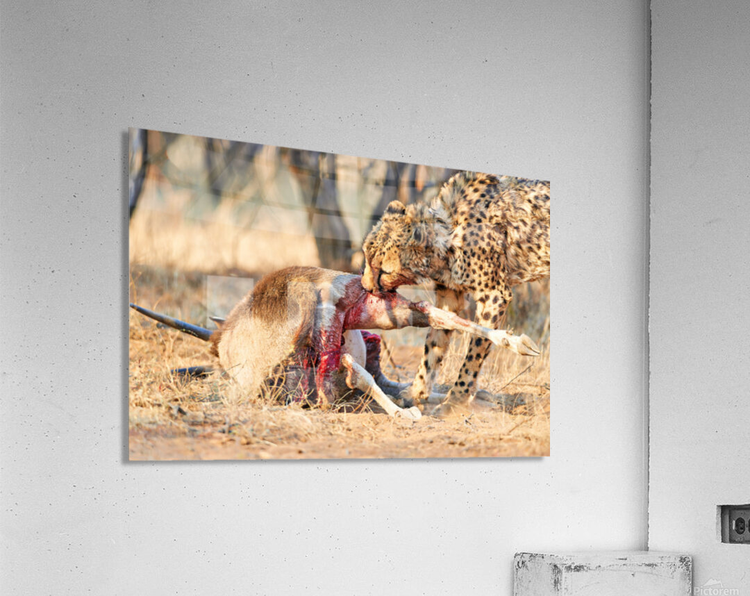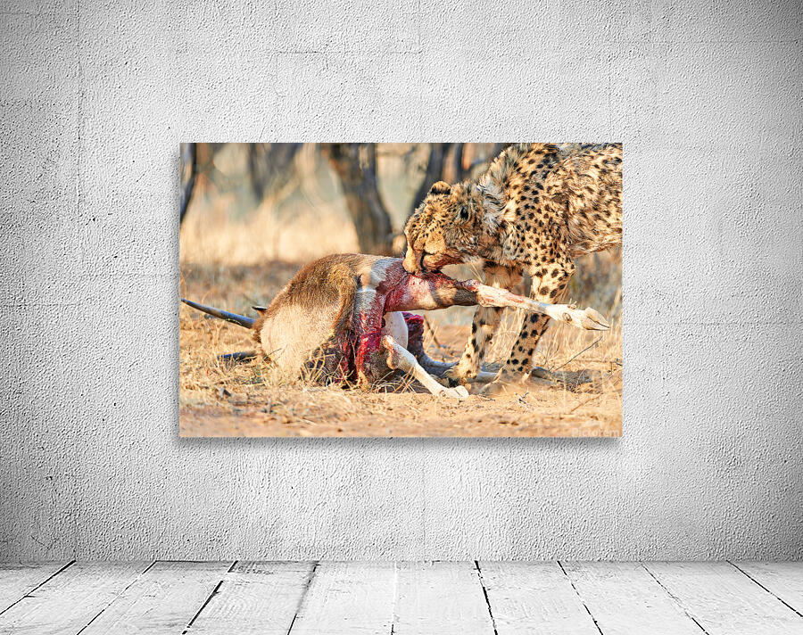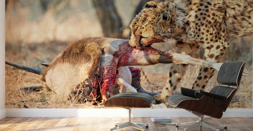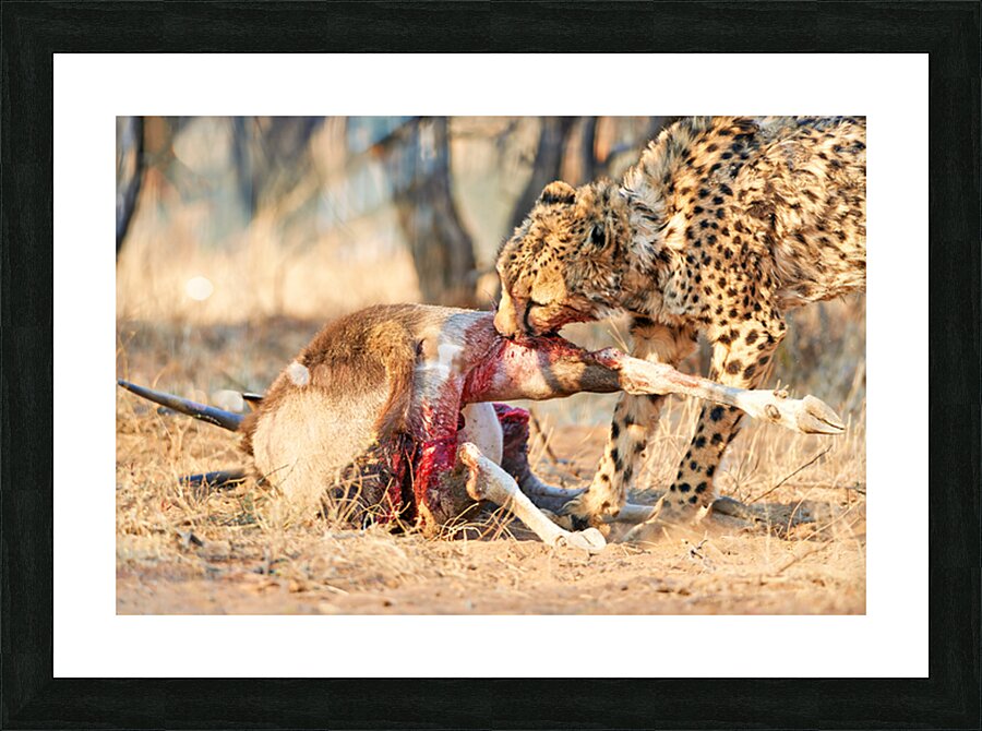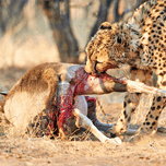 A cheetah is eating its catch in Okonjima Reserve Namibia. The scene shows the cheetah after a successful hunt engaging with its prey.