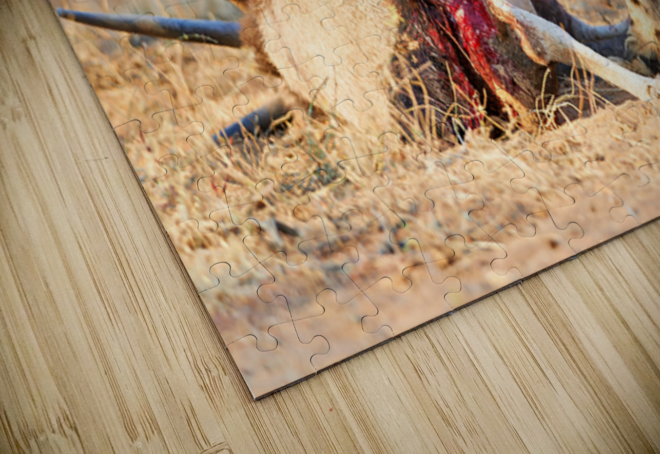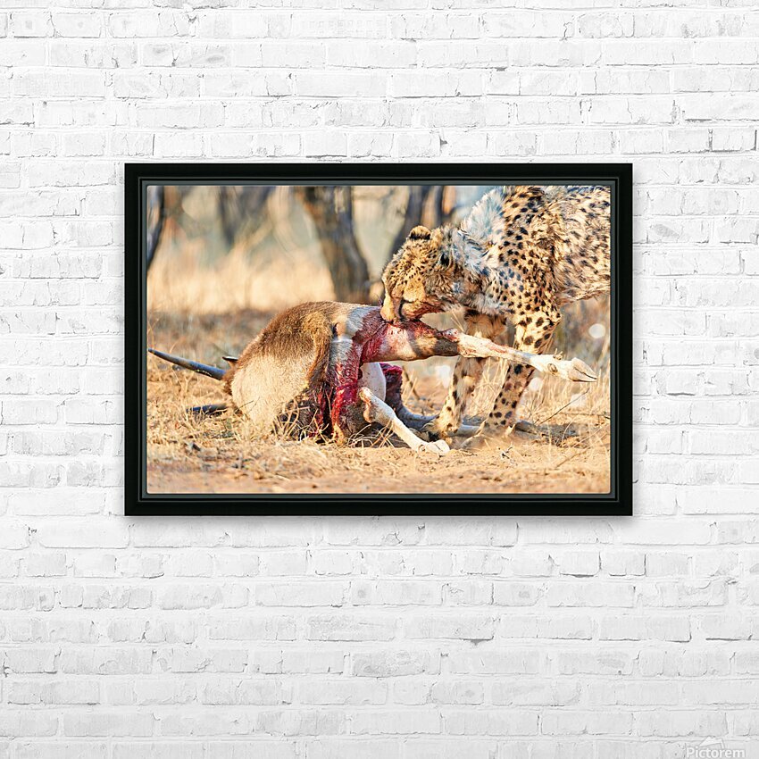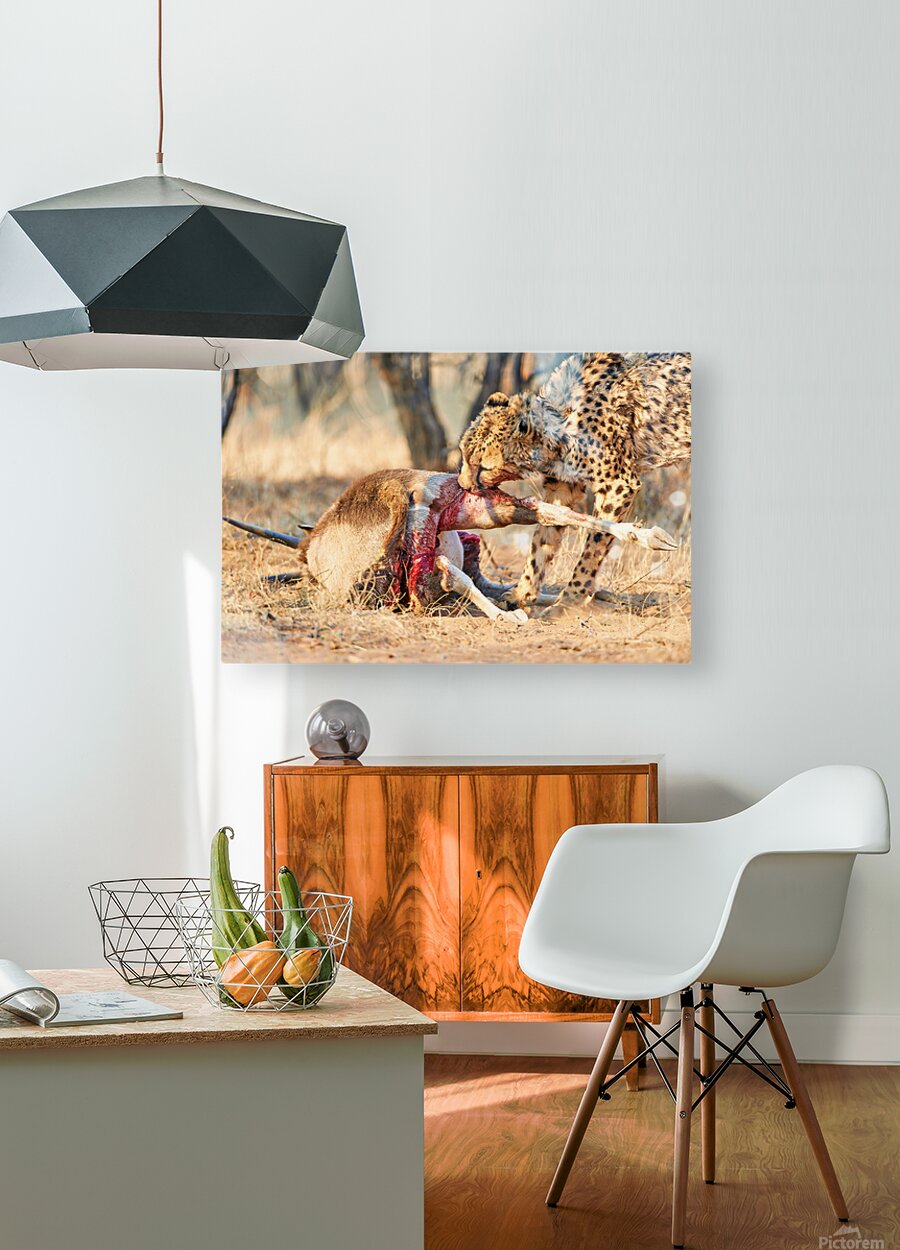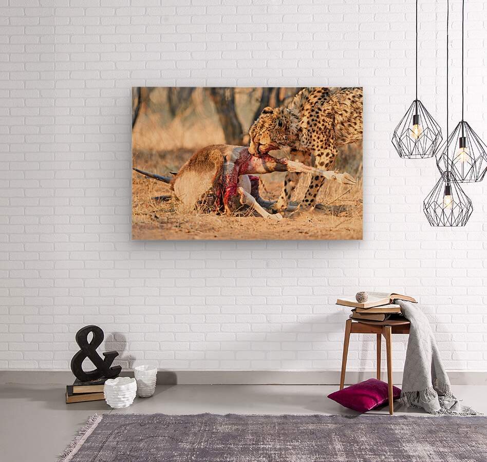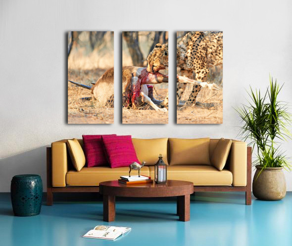 A cheetah is eating its catch in Okonjima Reserve Namibia. The scene shows the cheetah after a successful hunt engaging with its prey.