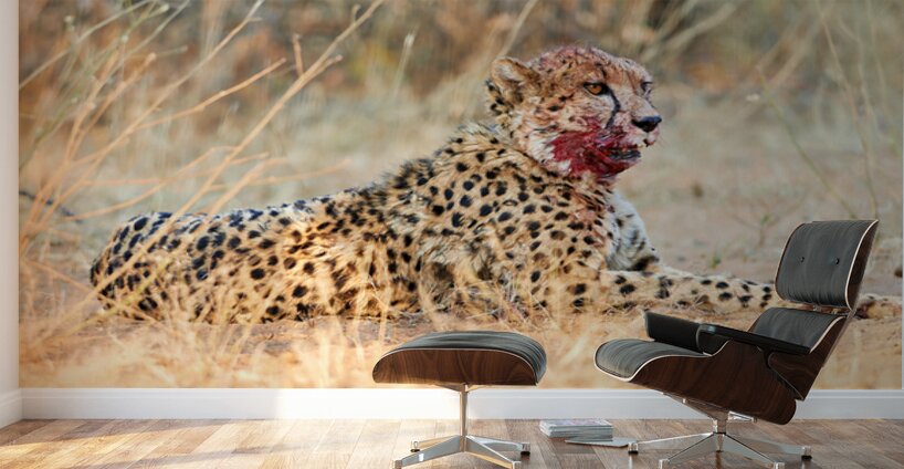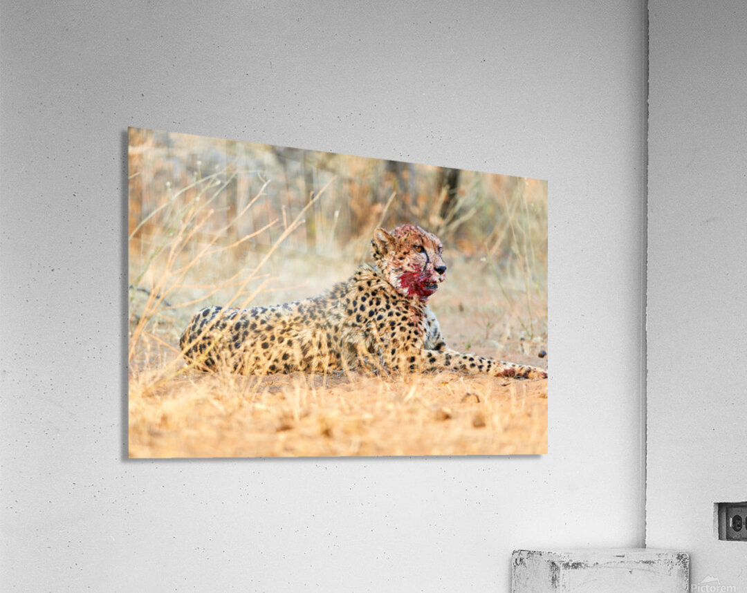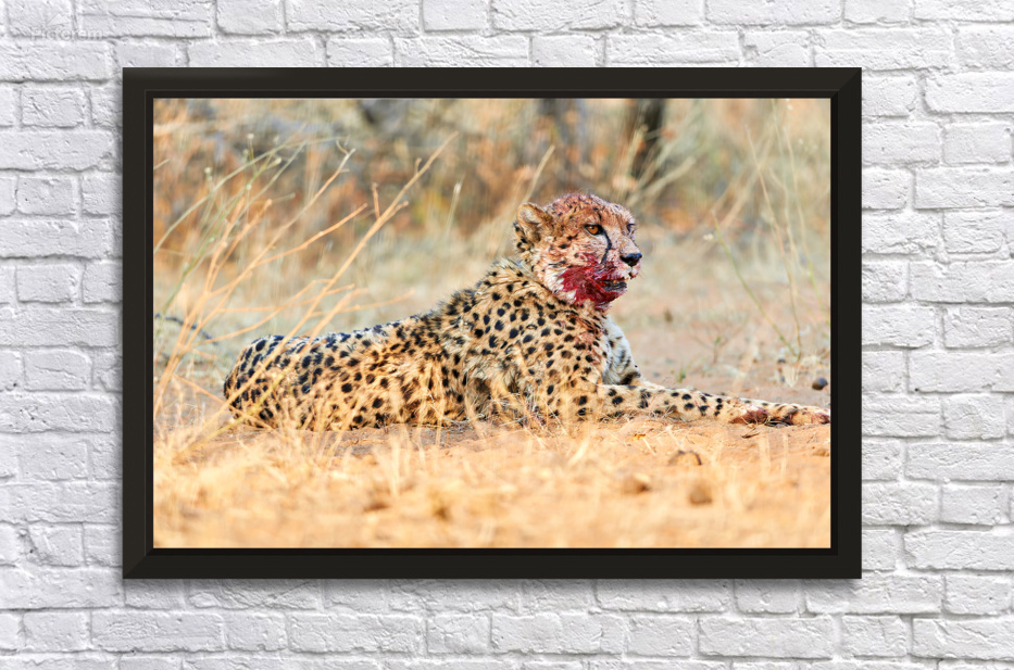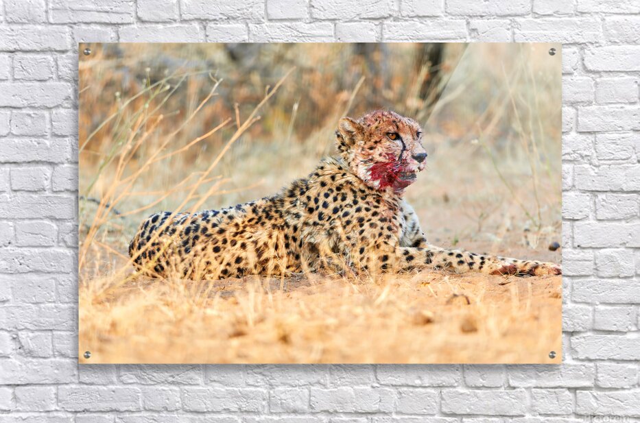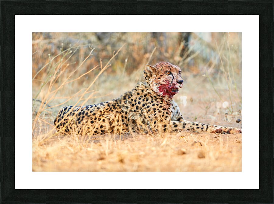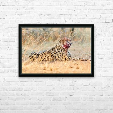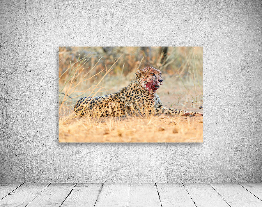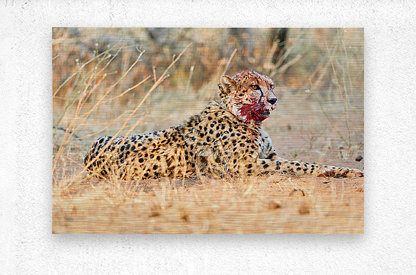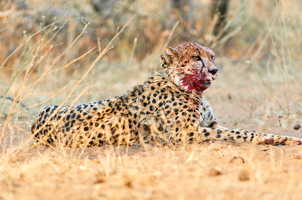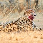 A cheetah lies on the ground in Okonjima Reserve Namibia with blood on its face after hunting and catching prey.