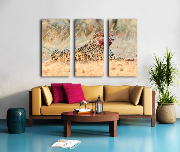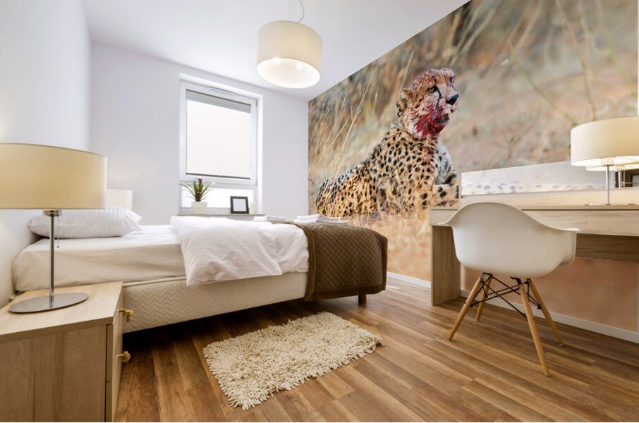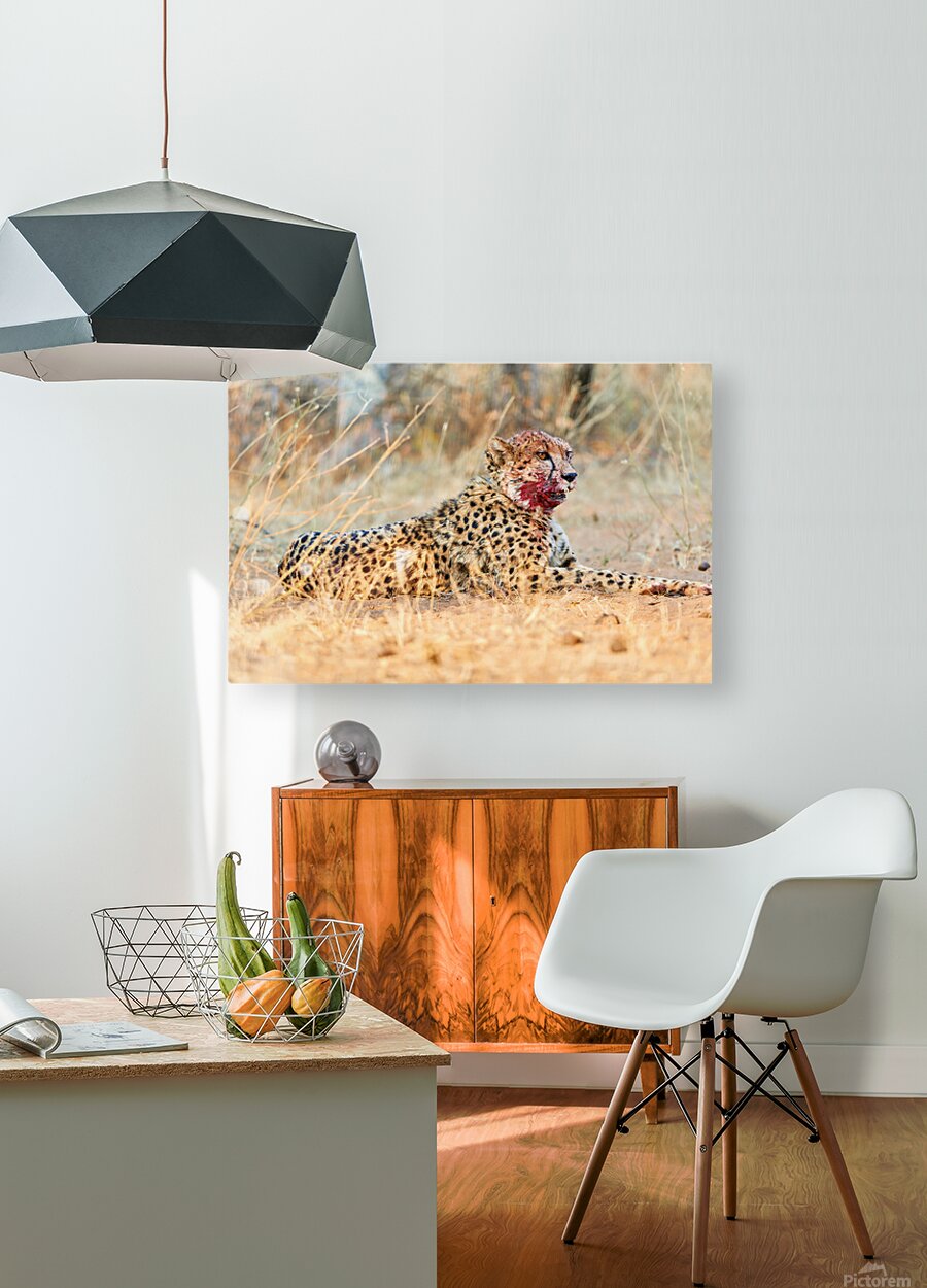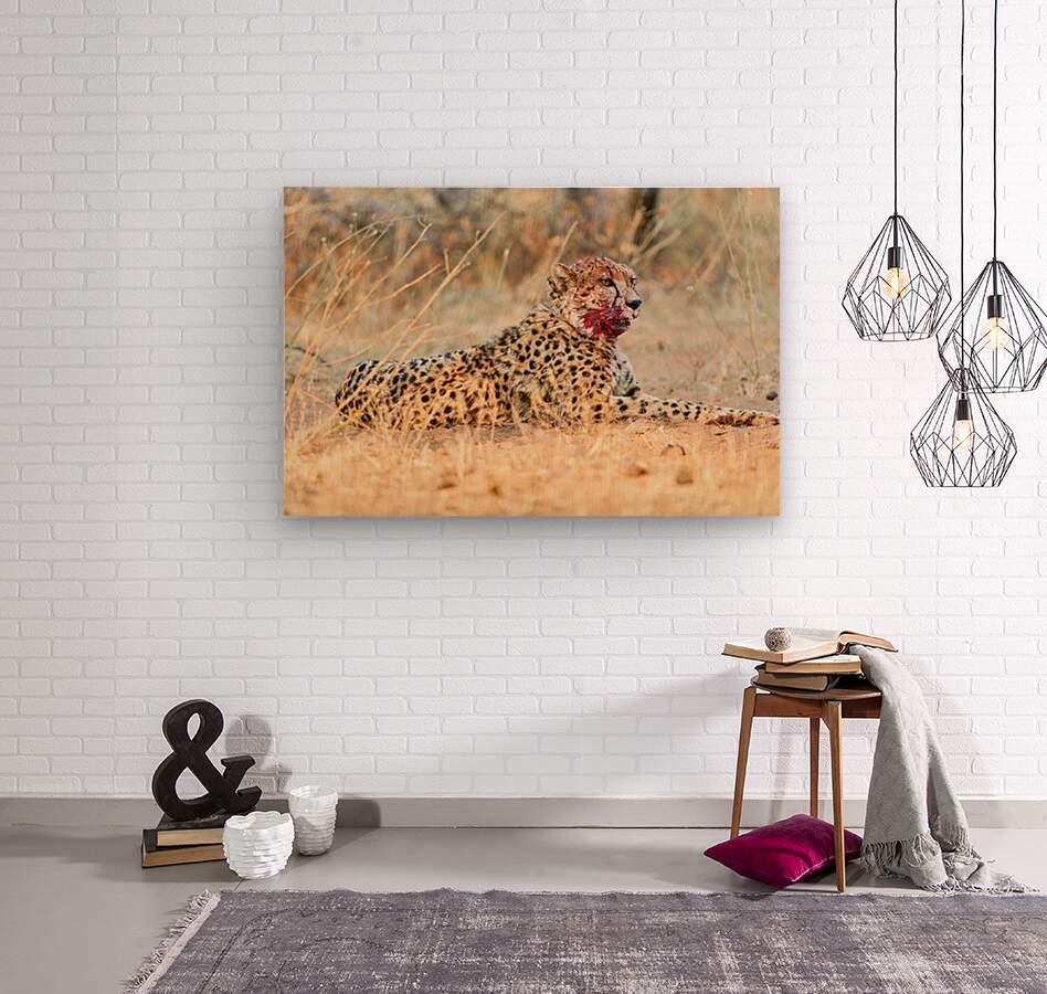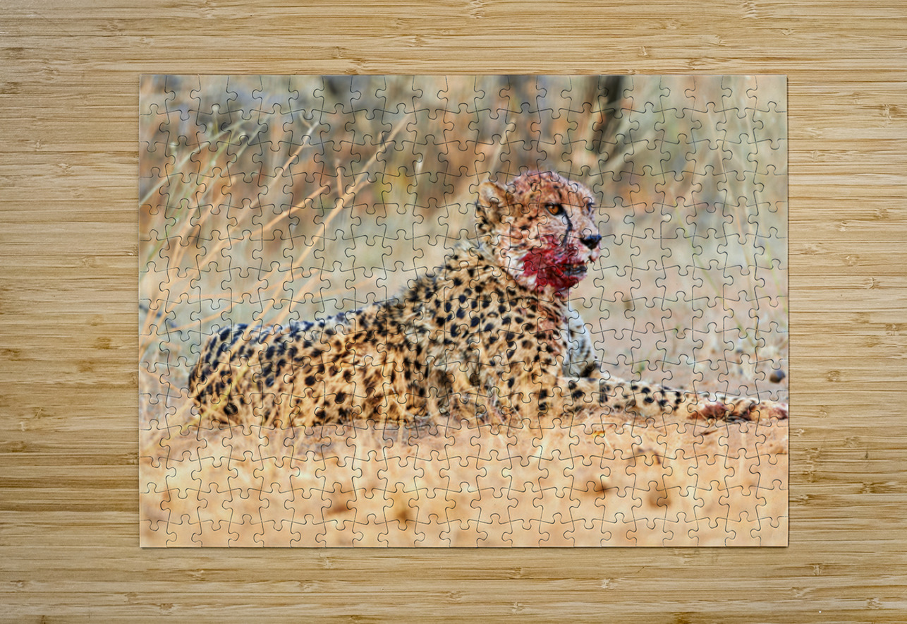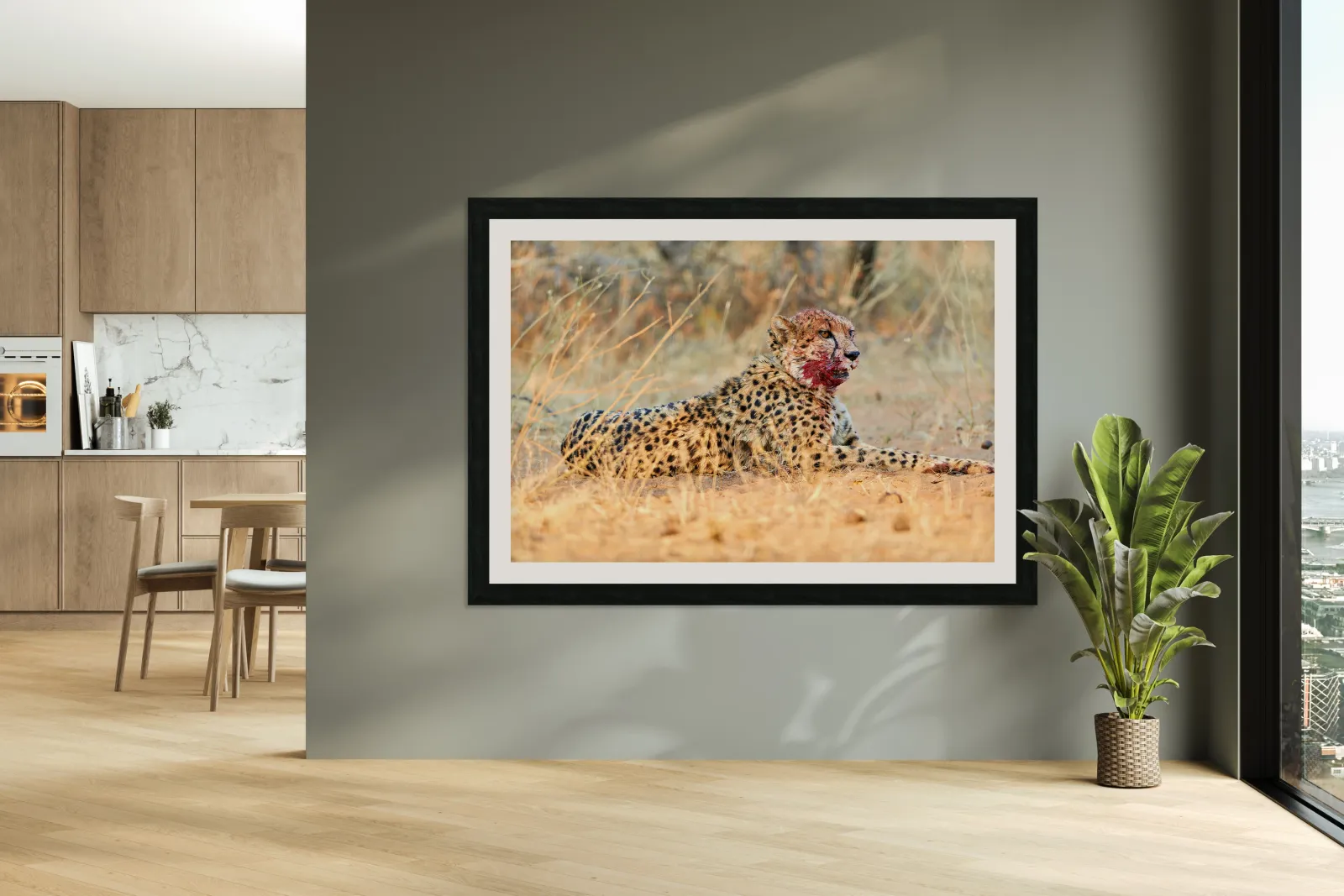 A cheetah lies on the ground in Okonjima Reserve Namibia with blood on its face after hunting and catching prey.