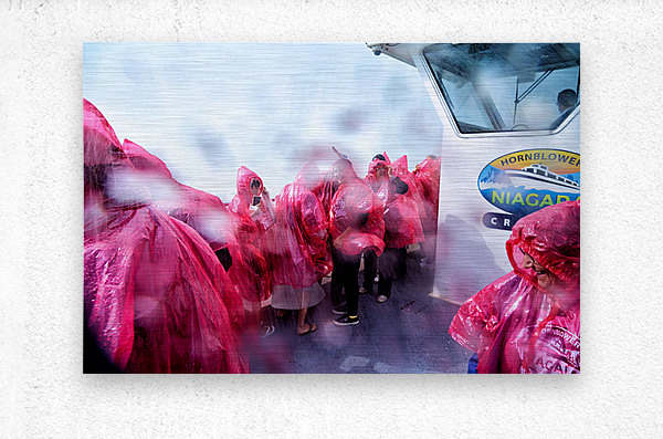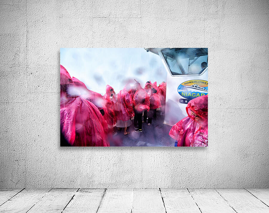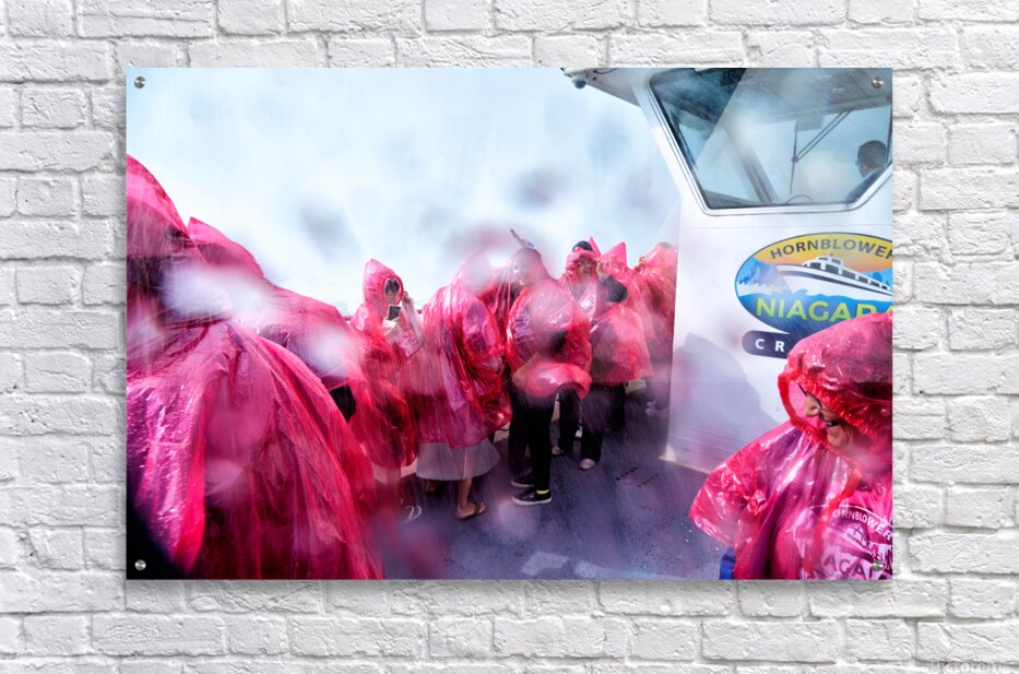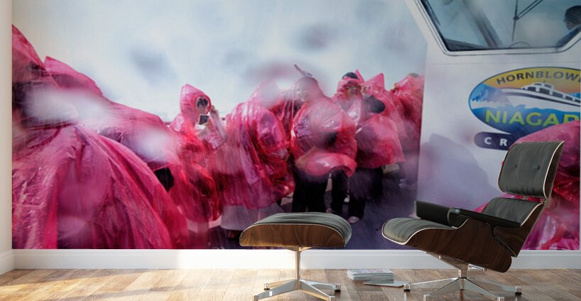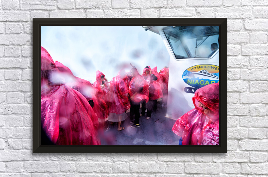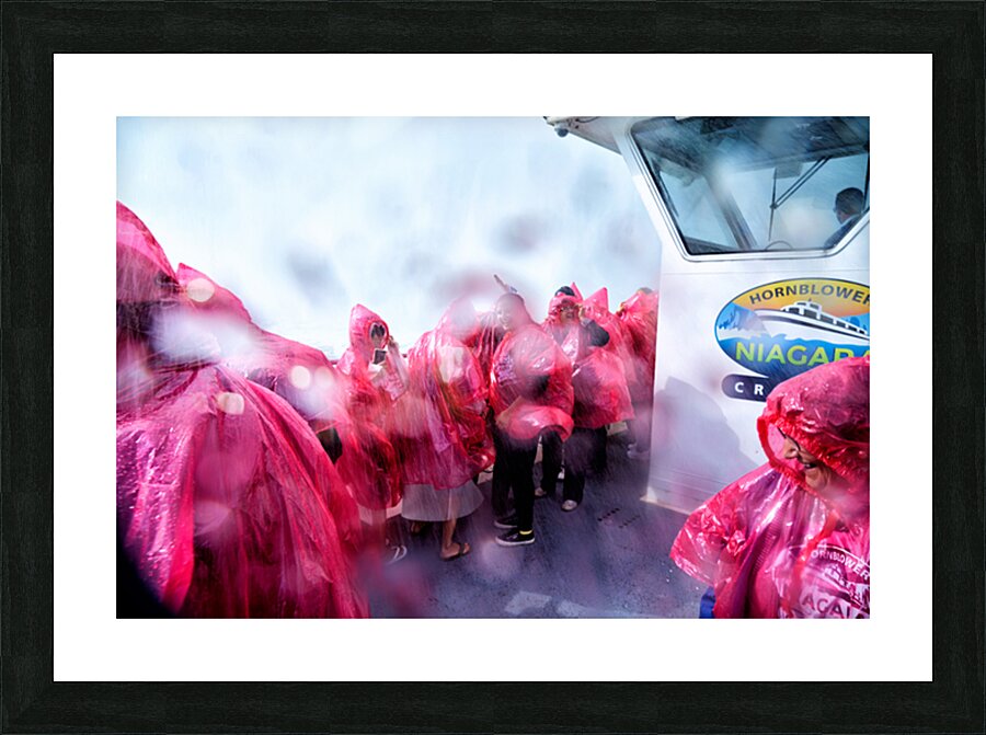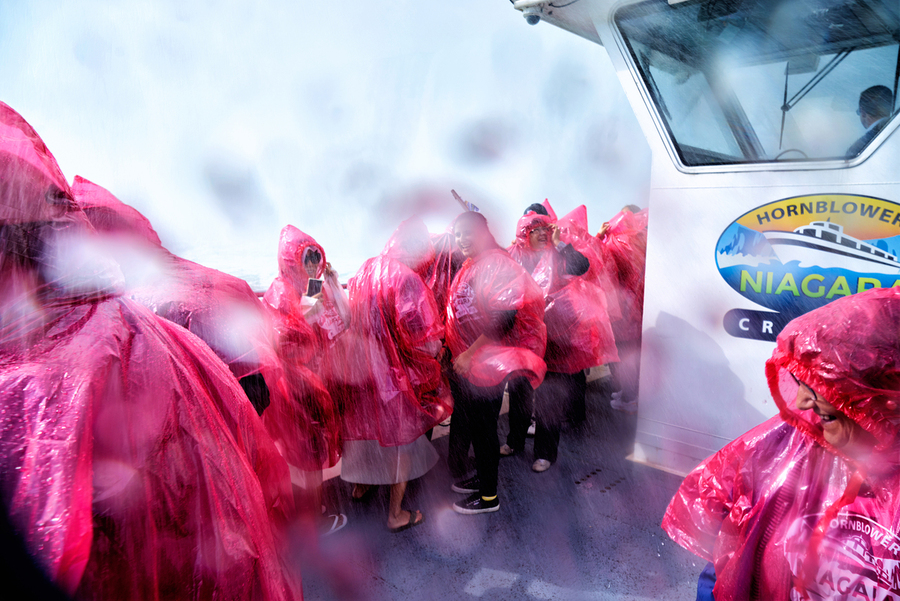 Tourists in pink ponchos on a Hornblower Niagara Cruises boat get soaked by the mist of Niagara Falls enjoying the close-up experience.