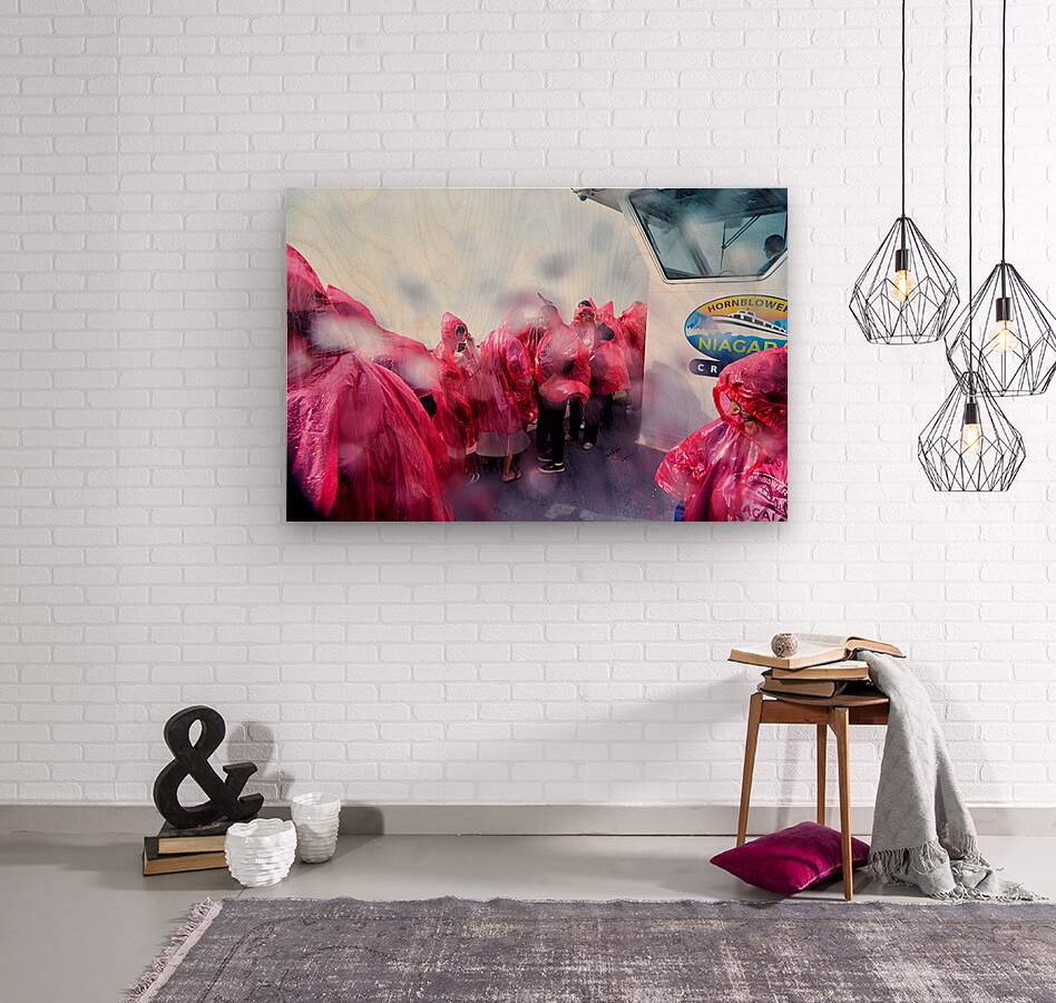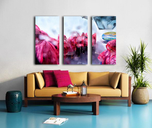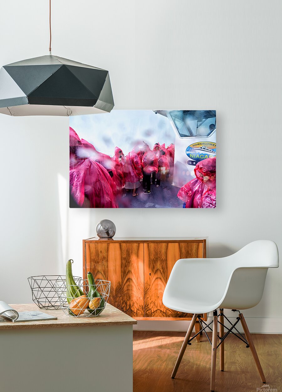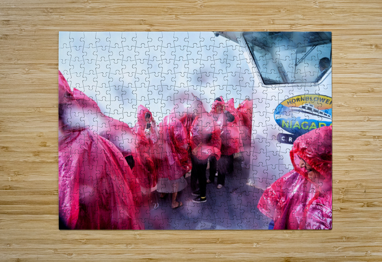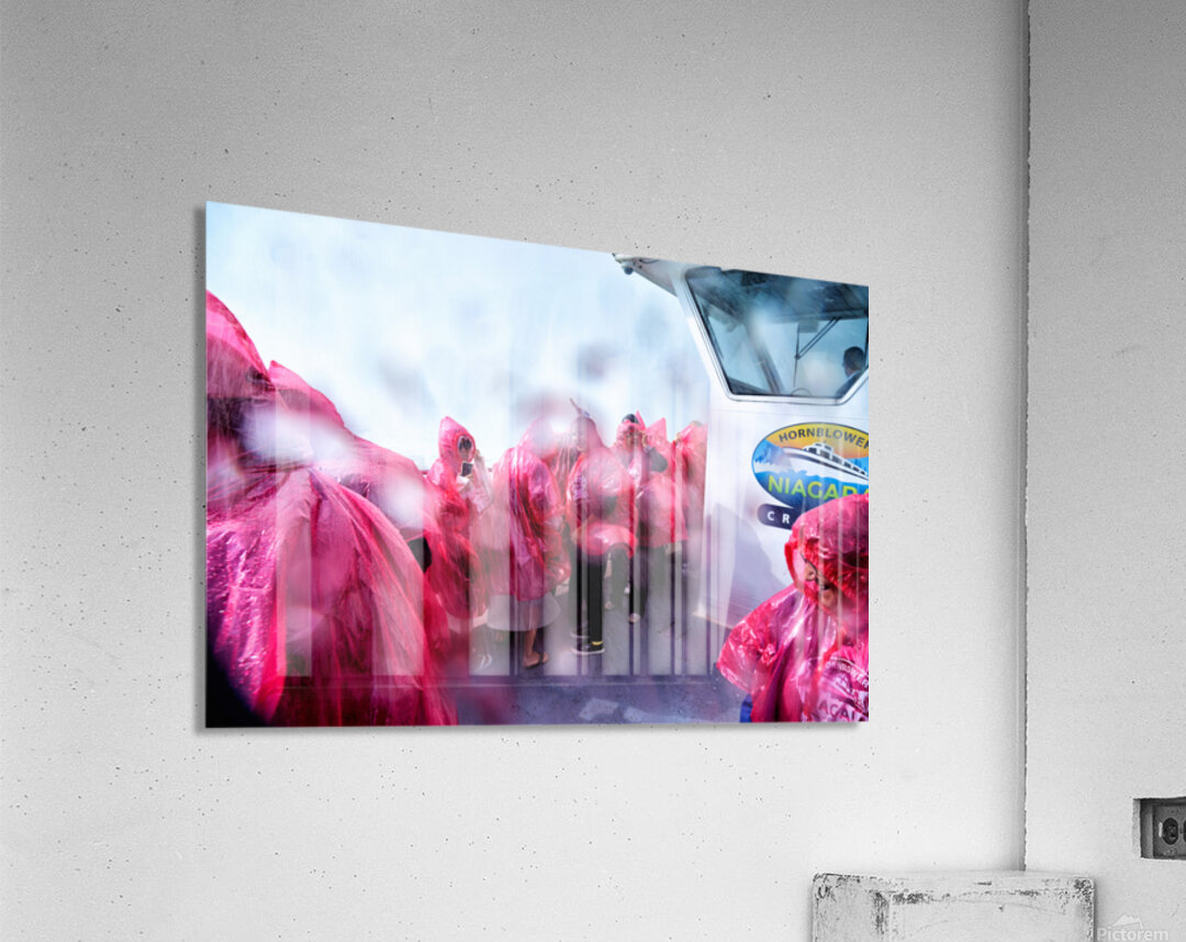 Tourists in pink ponchos on a Hornblower Niagara Cruises boat get soaked by the mist of Niagara Falls enjoying the close-up experience.