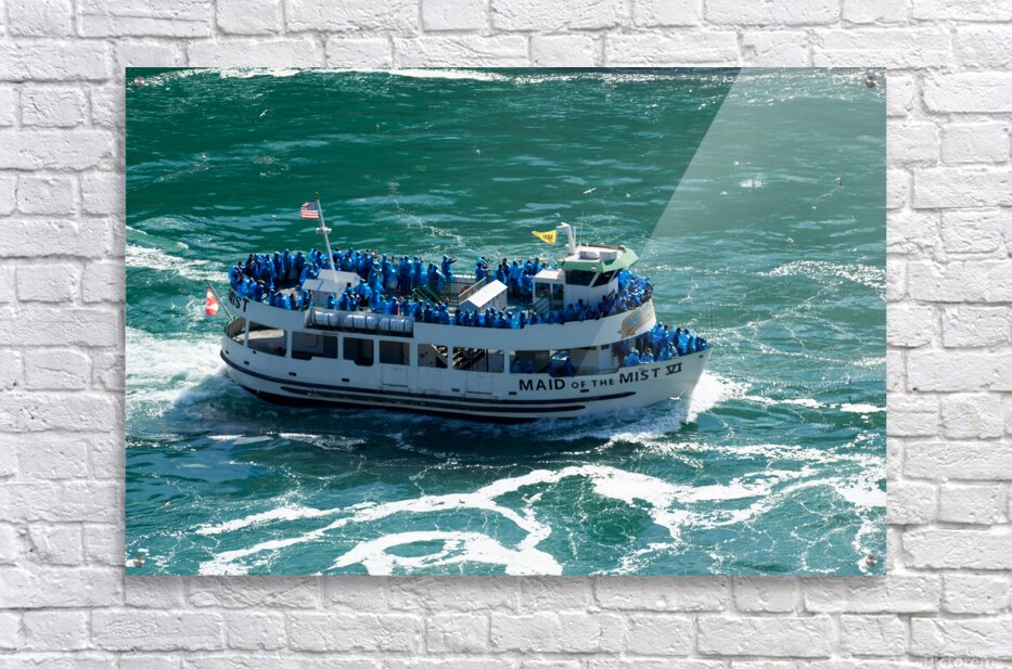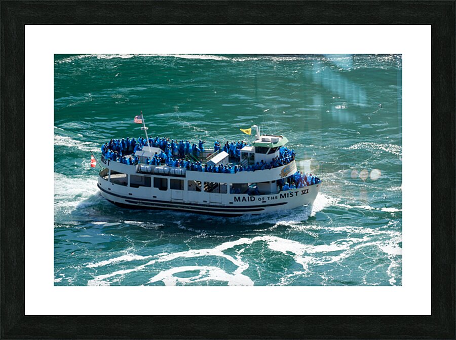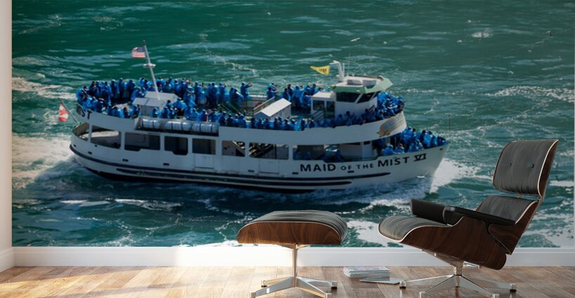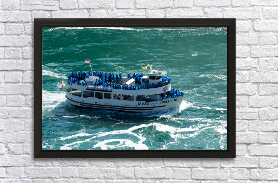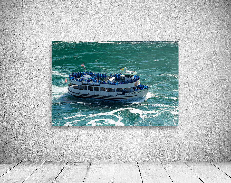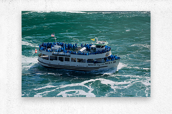 Tourists in blue ponchos ride the Maid of the Mist VI boat at Niagara Falls experiencing the iconic natural wonder up close.
