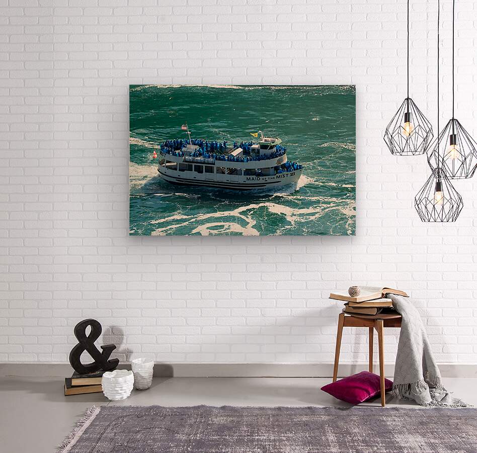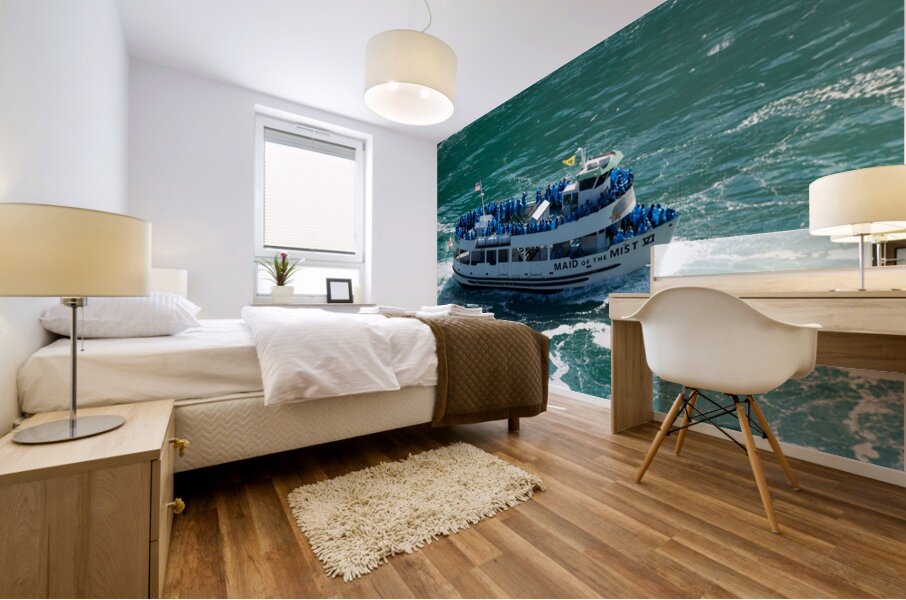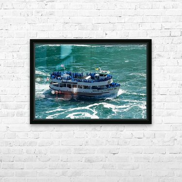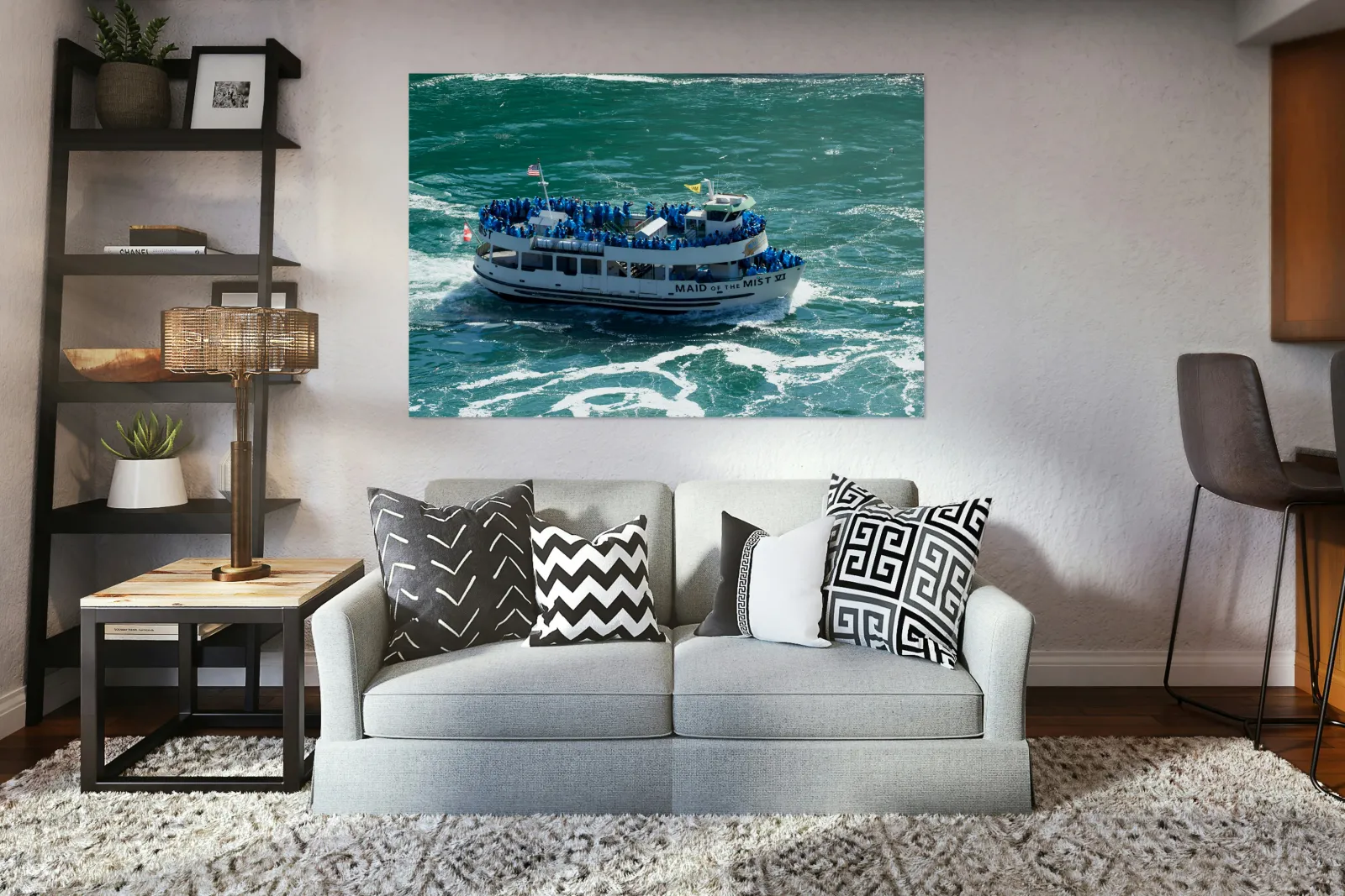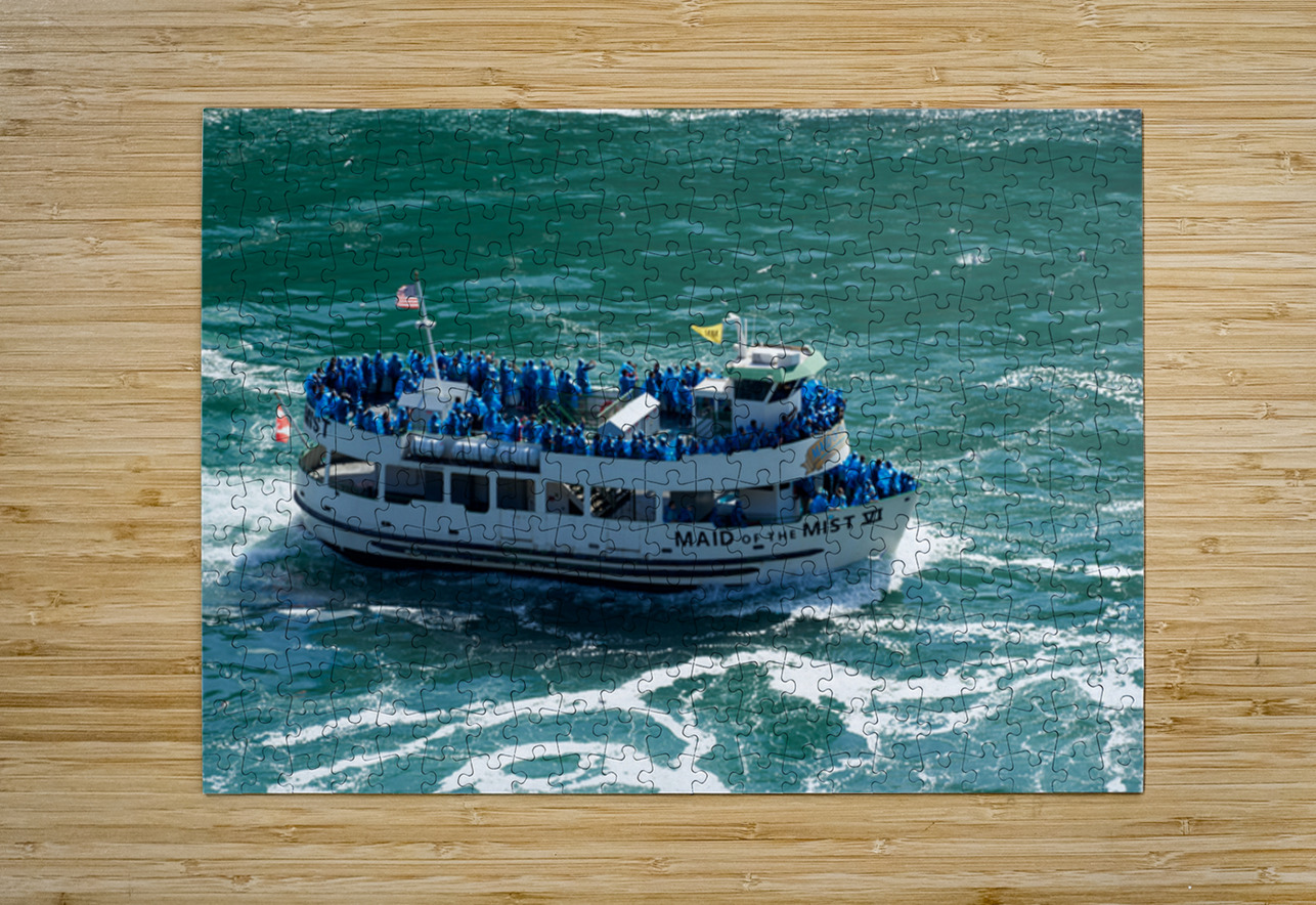 Tourists in blue ponchos ride the Maid of the Mist VI boat at Niagara Falls experiencing the iconic natural wonder up close.