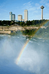A vibrant rainbow arches through the mist of Niagara Falls Ontario Canada with the Skylon Tower and city skyline in the background.