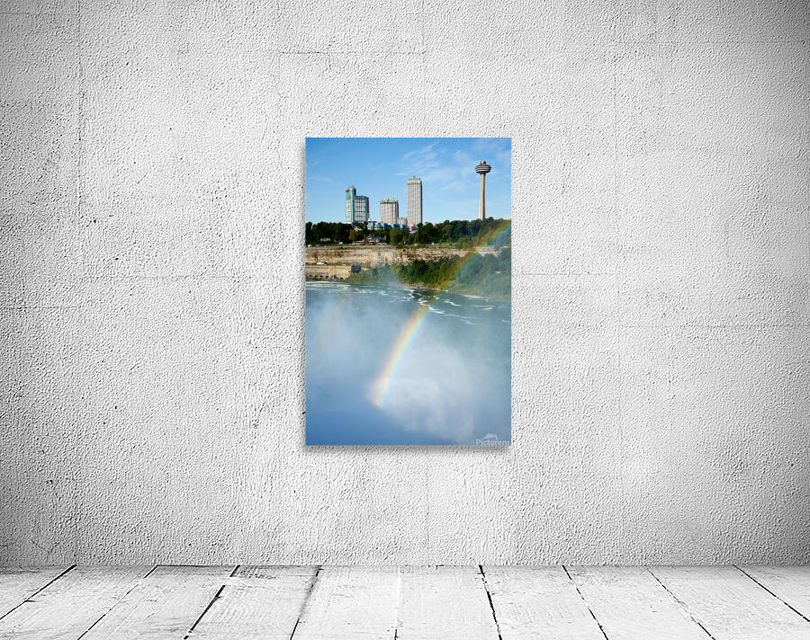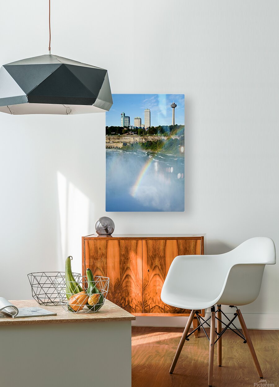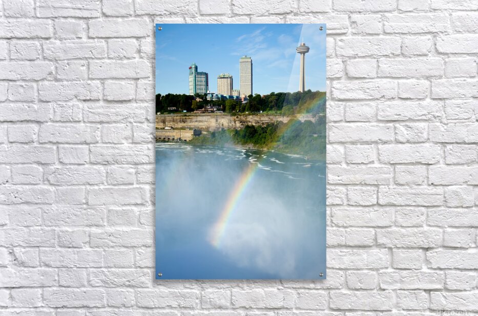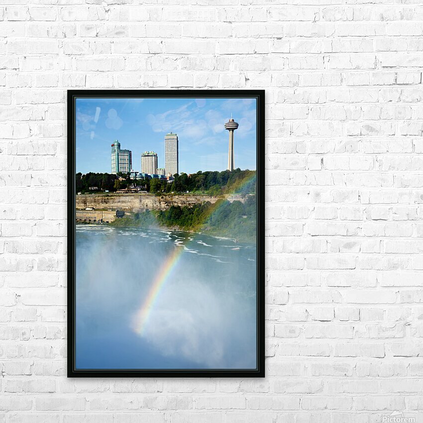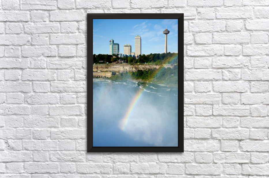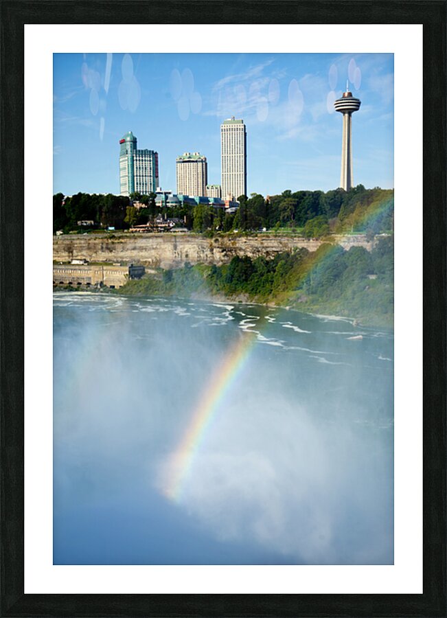 "Rainbow over Niagara Falls with city skyline." in a framed print.