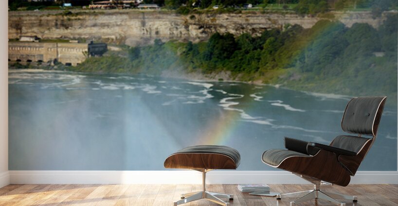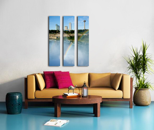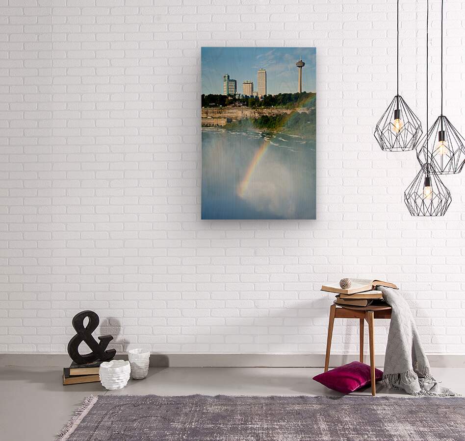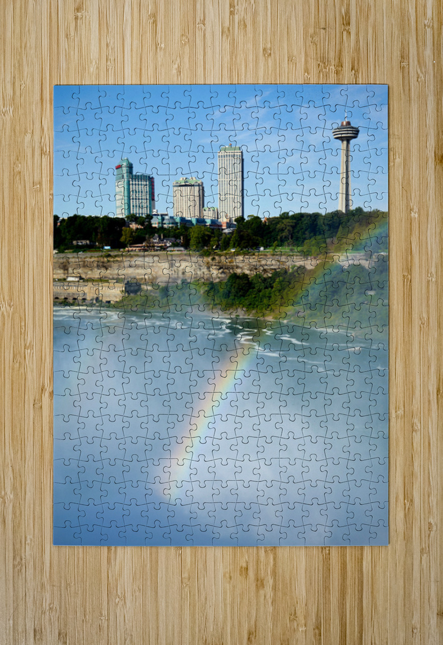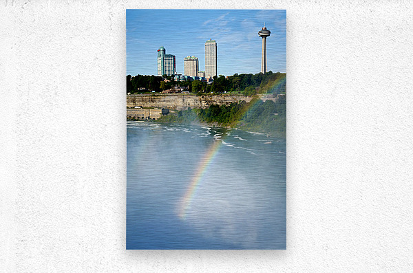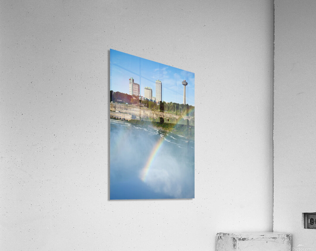 "Rainbow over Niagara Falls with city skyline." in a framed print.