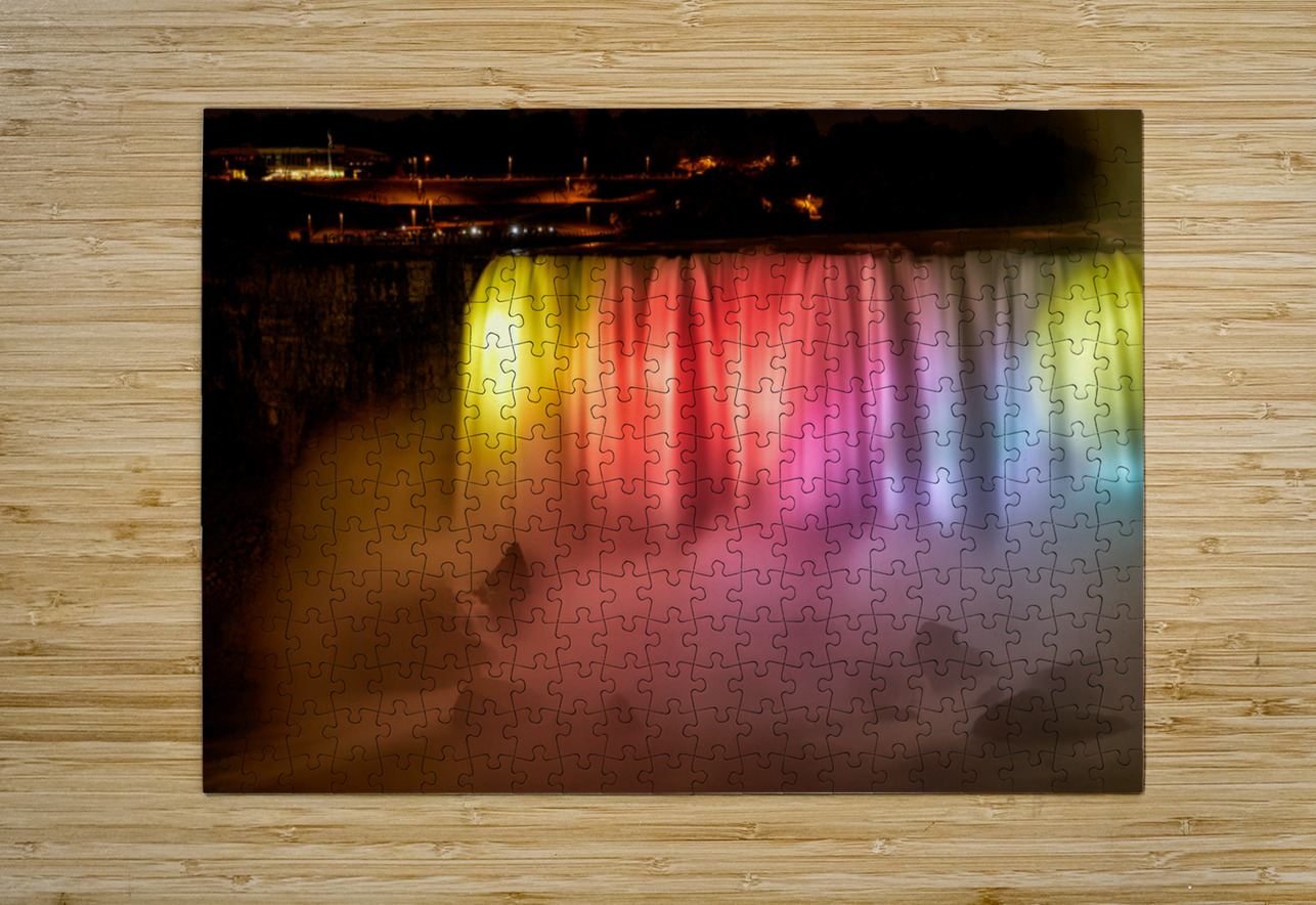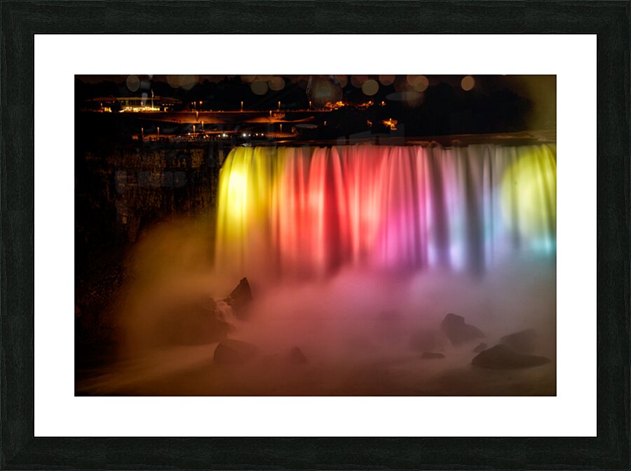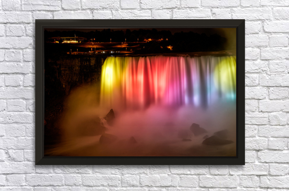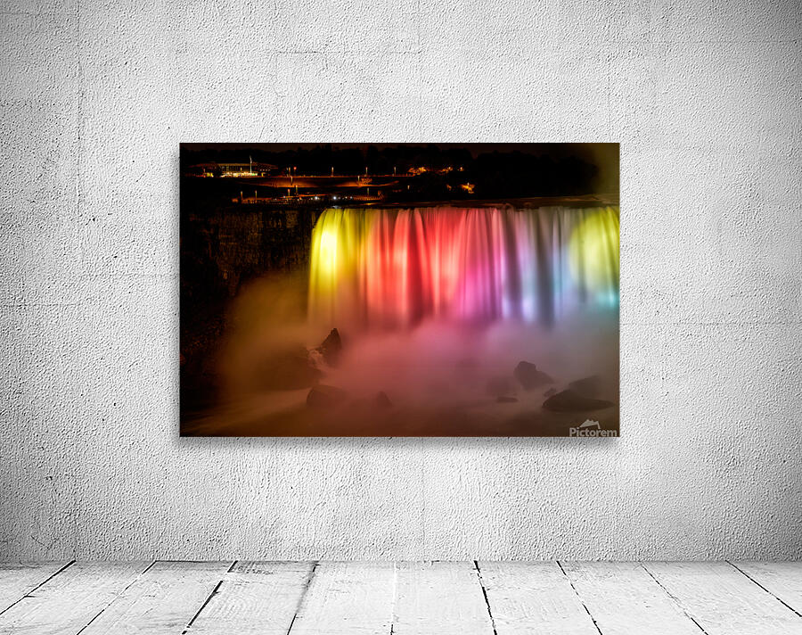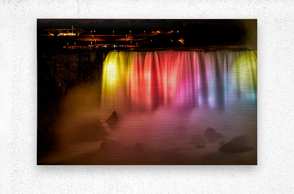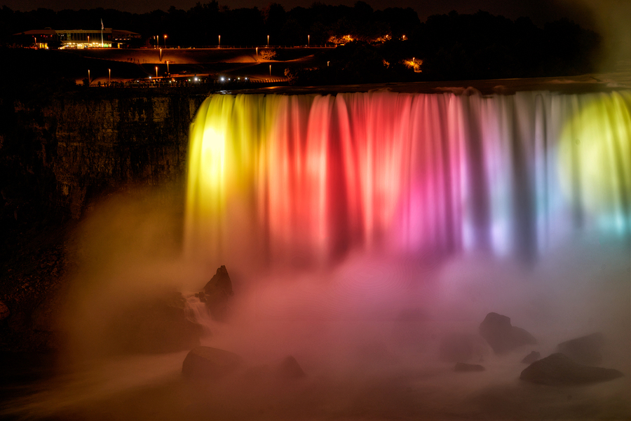 Niagara Falls Canada glows with vibrant lights at night captivating tourists gathered on the observation deck for a spectacular view.