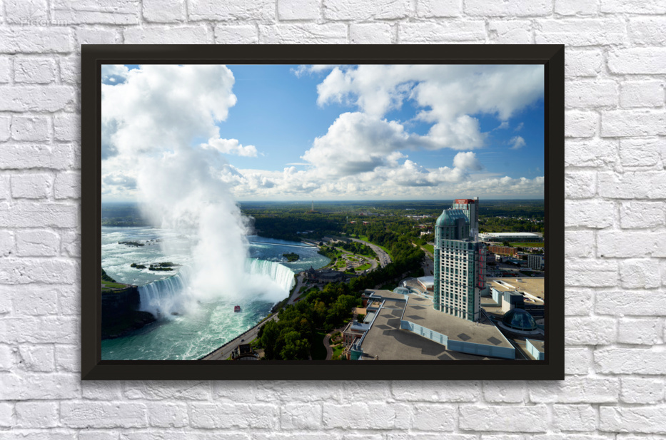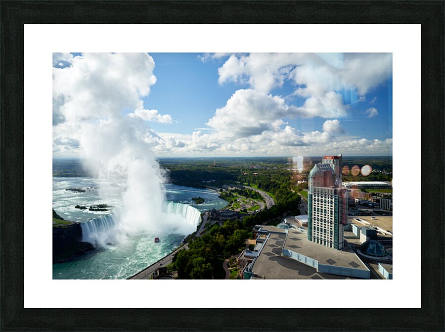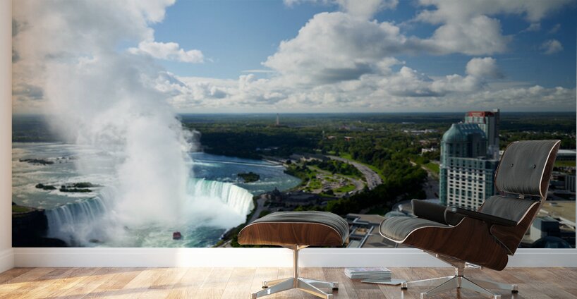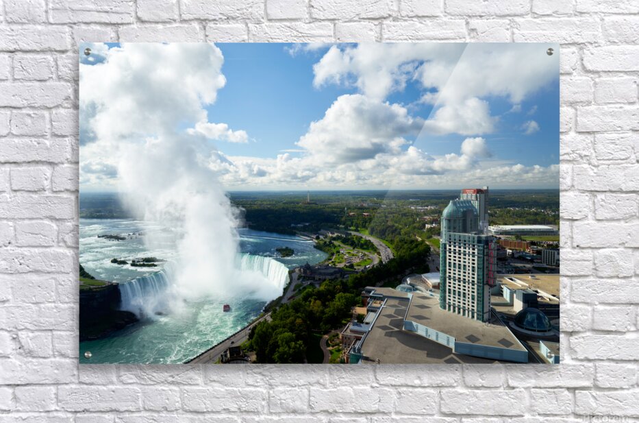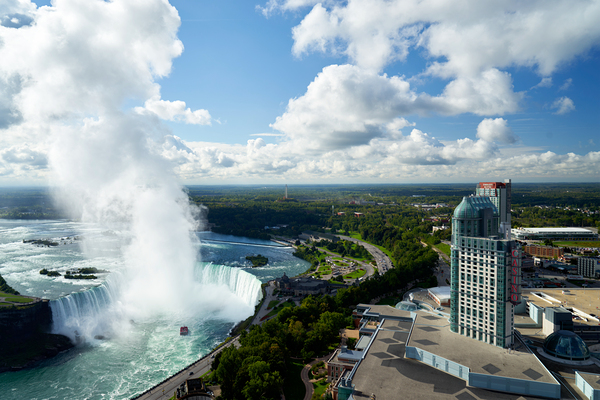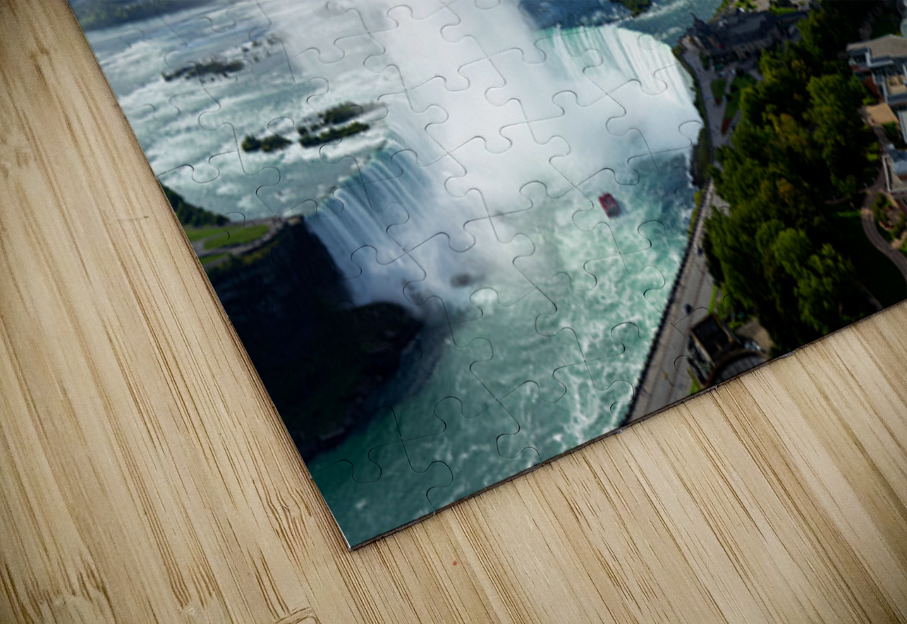 An aerial view of the majestic Horseshoe Falls at Niagara Falls Ontario Canada with a tour boat carrying visitors experiencing the powerful cascade.
