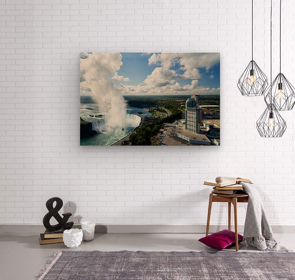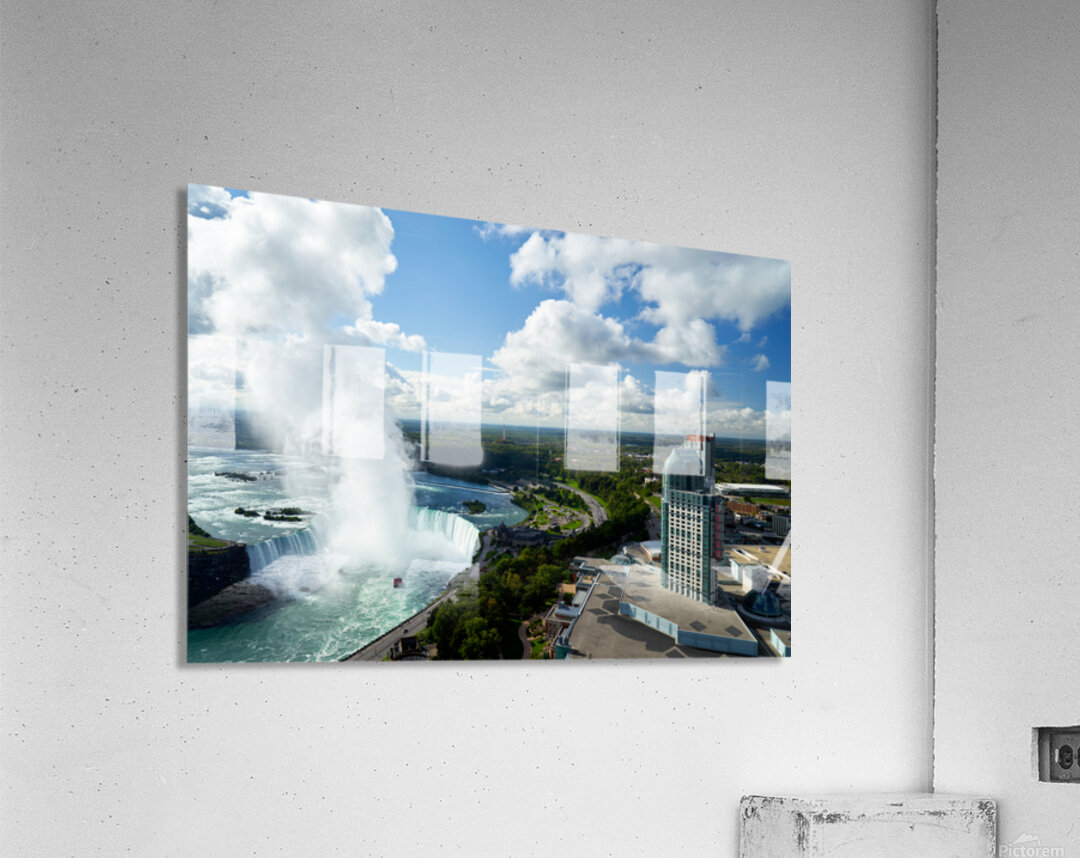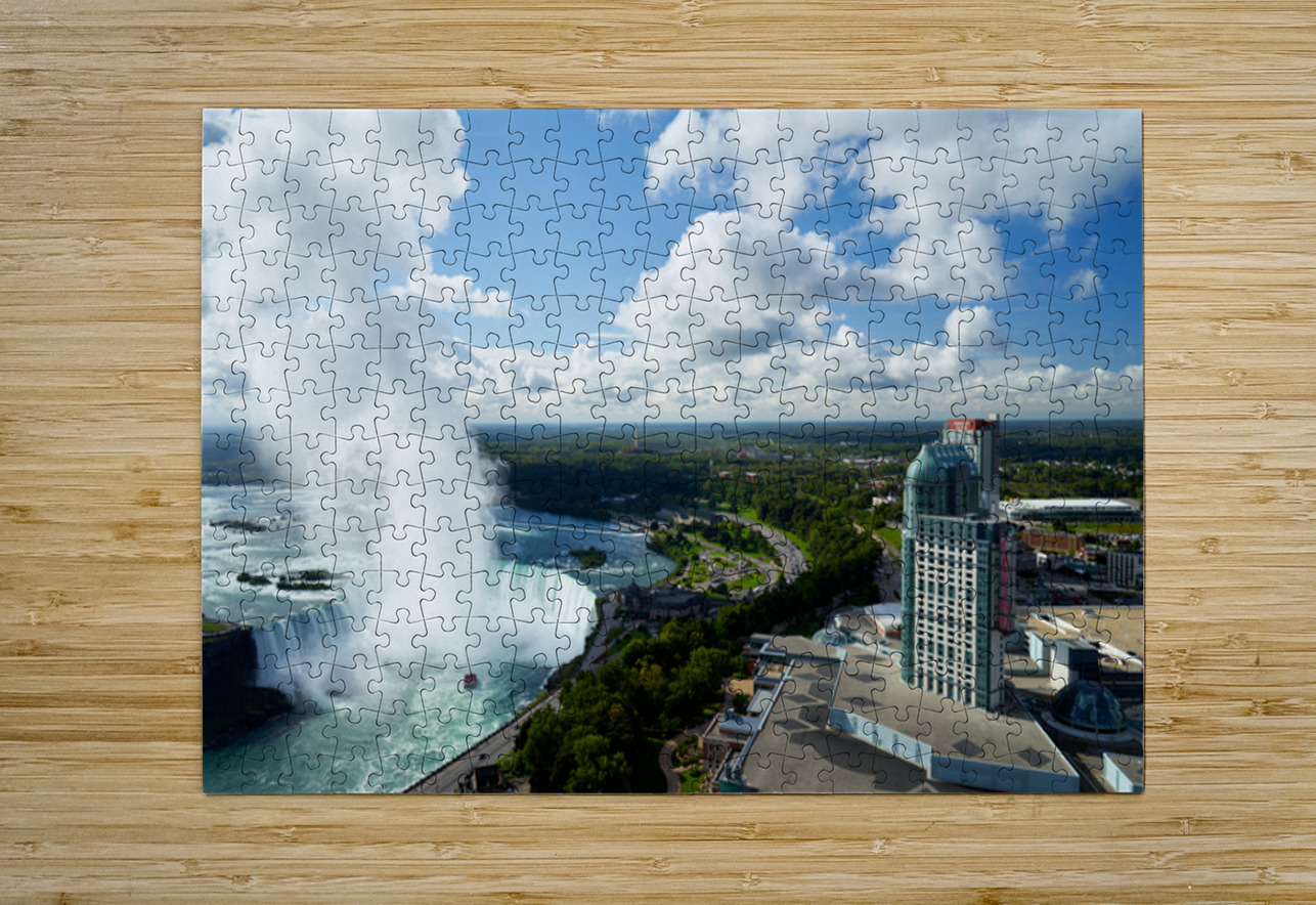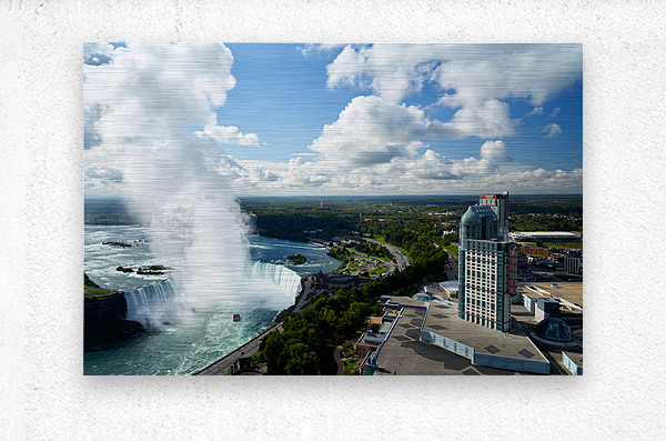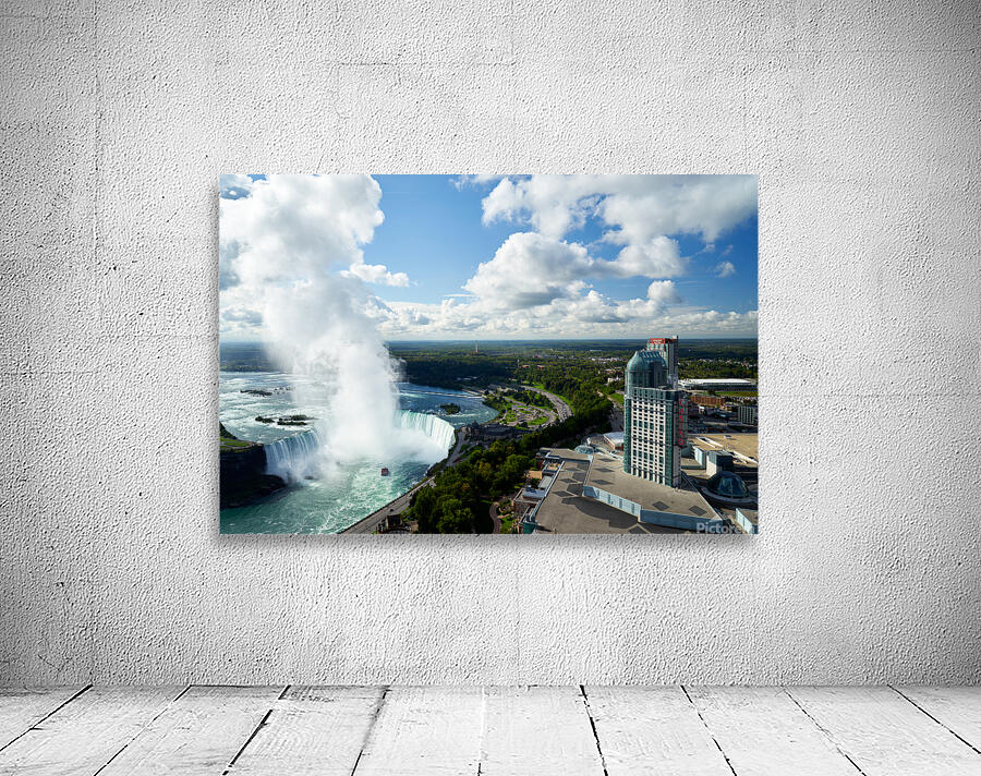 An aerial view of the majestic Horseshoe Falls at Niagara Falls Ontario Canada with a tour boat carrying visitors experiencing the powerful cascade.