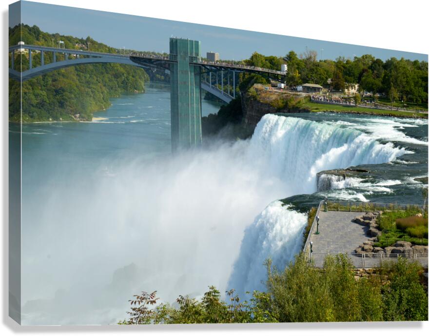 Get this artwork "Niagara Falls bridge and observation deck on a sunny day." in a framed print.