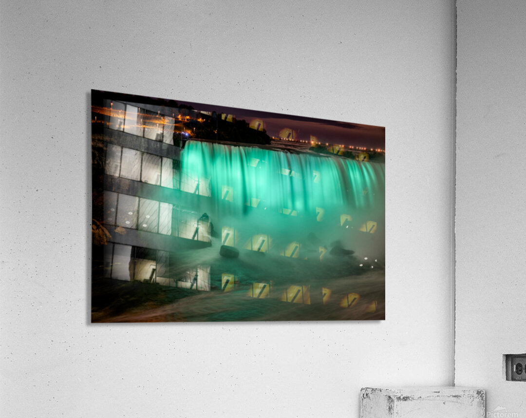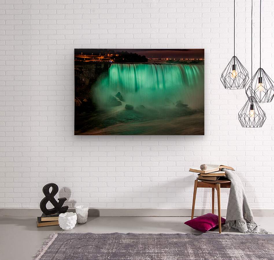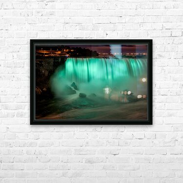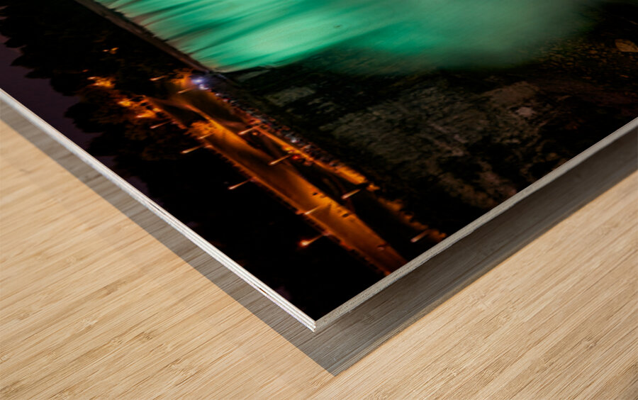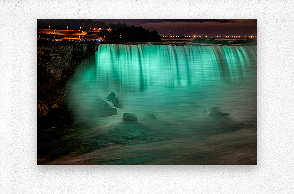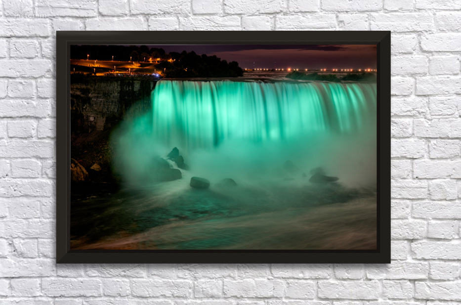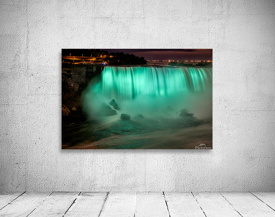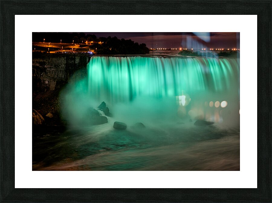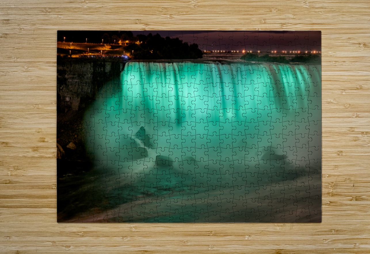 Tourists gather at Niagara Falls Canada to witness the majestic Horseshoe Falls illuminated in vibrant green at night creating a stunning spectacle.