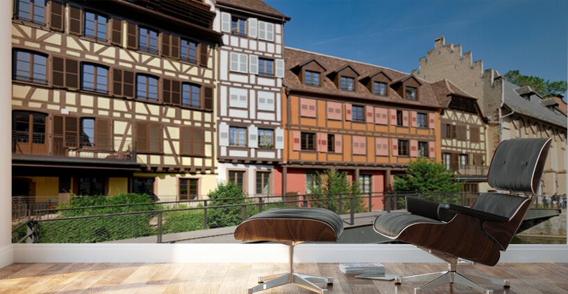 Visitors stroll along the canal in Petit France while admiring colorful timber framed houses in Strasbourg Alsace on a sunny day.