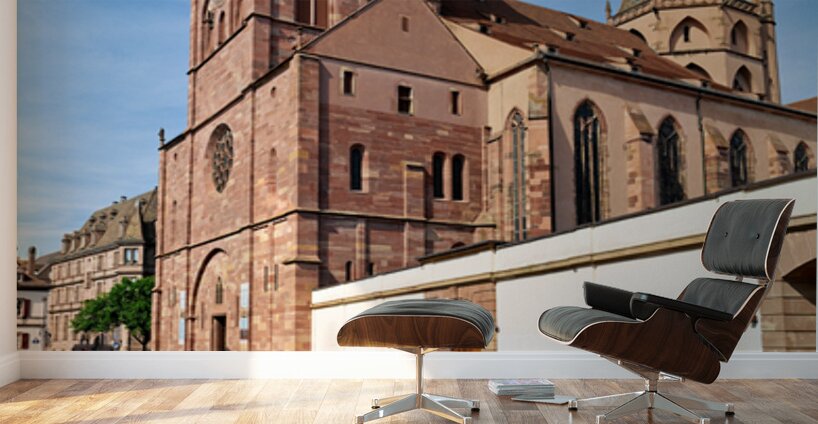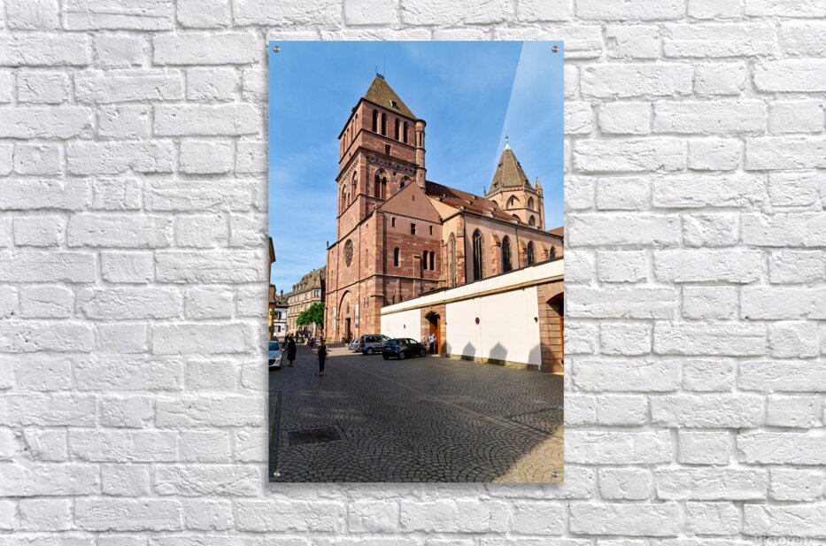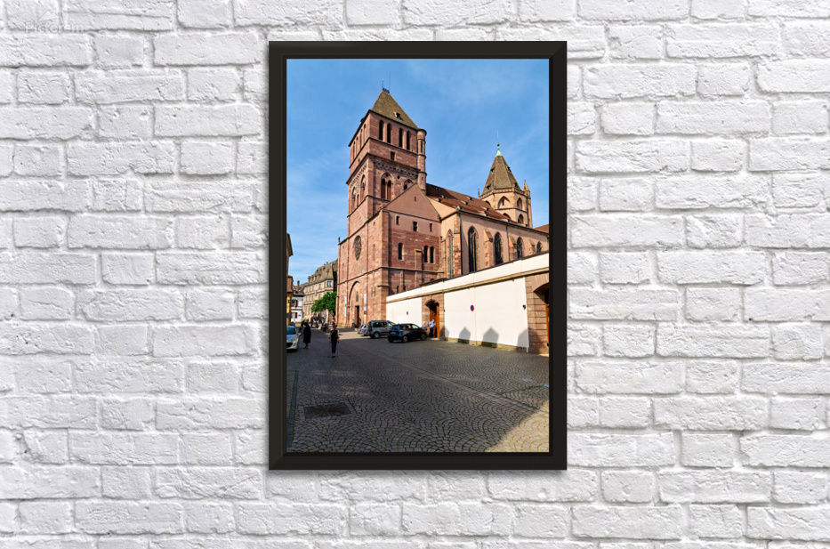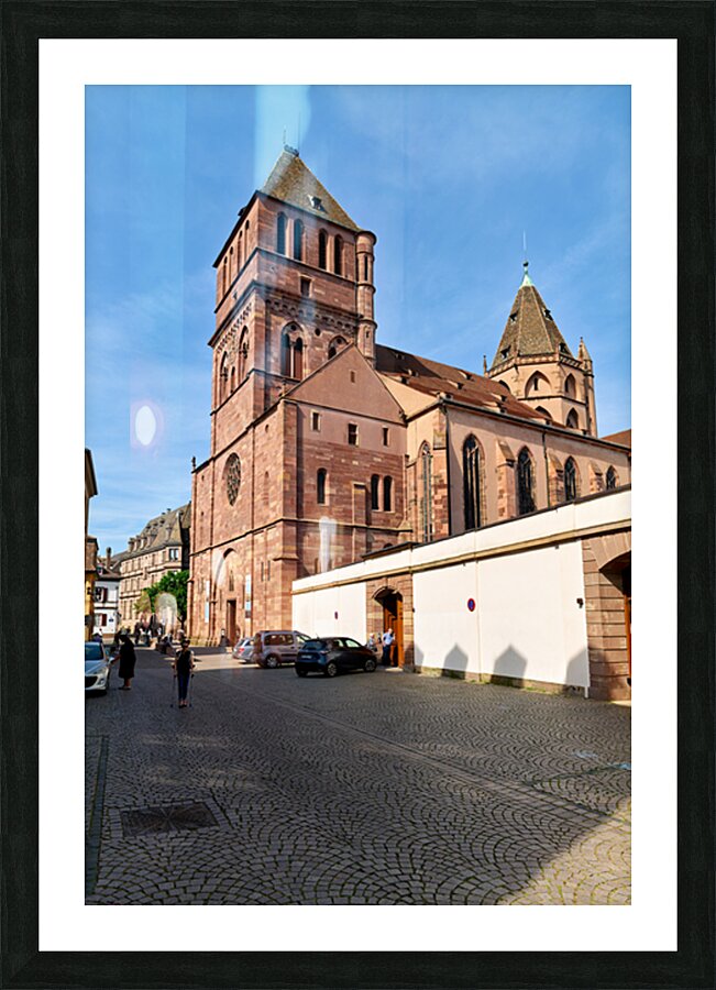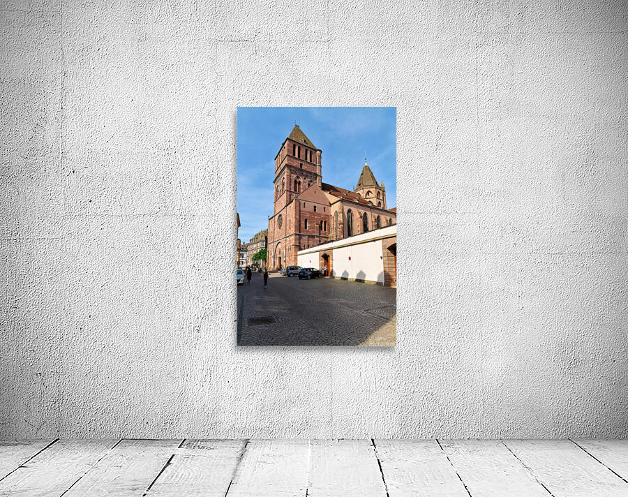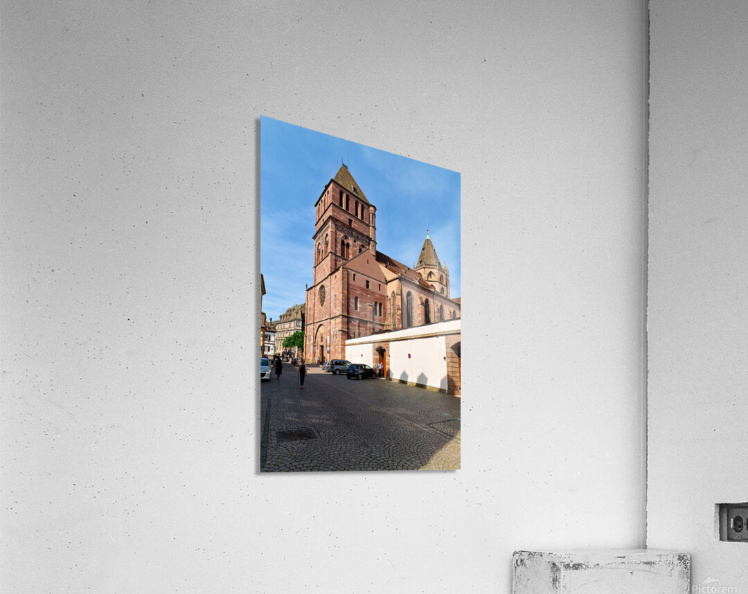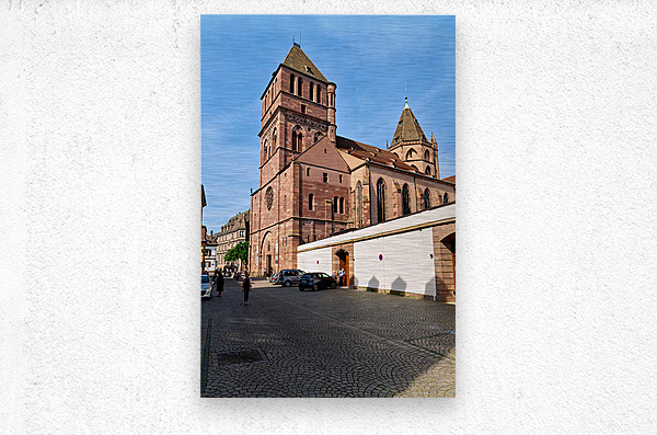 Saint Thomas church in Strasbourg is seen during a sunny day as people walk on the cobblestone street under clear skies.