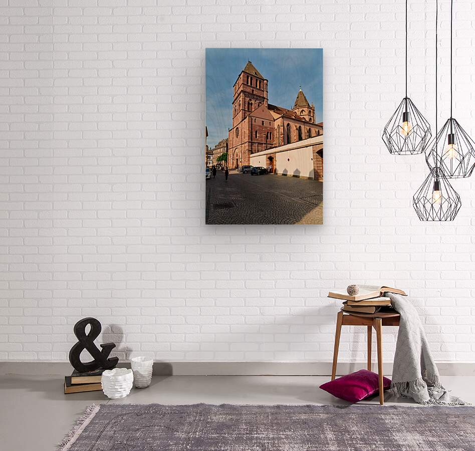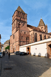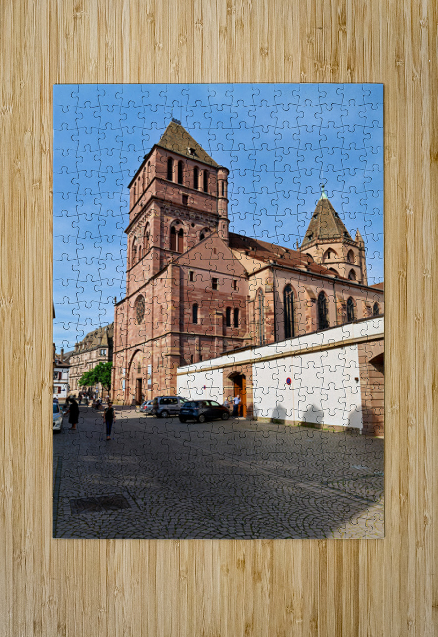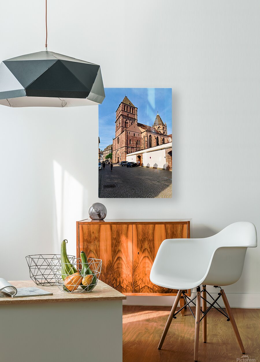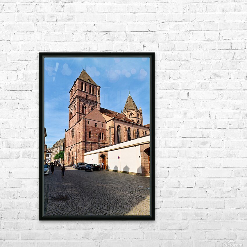 Saint Thomas church in Strasbourg is seen during a sunny day as people walk on the cobblestone street under clear skies.