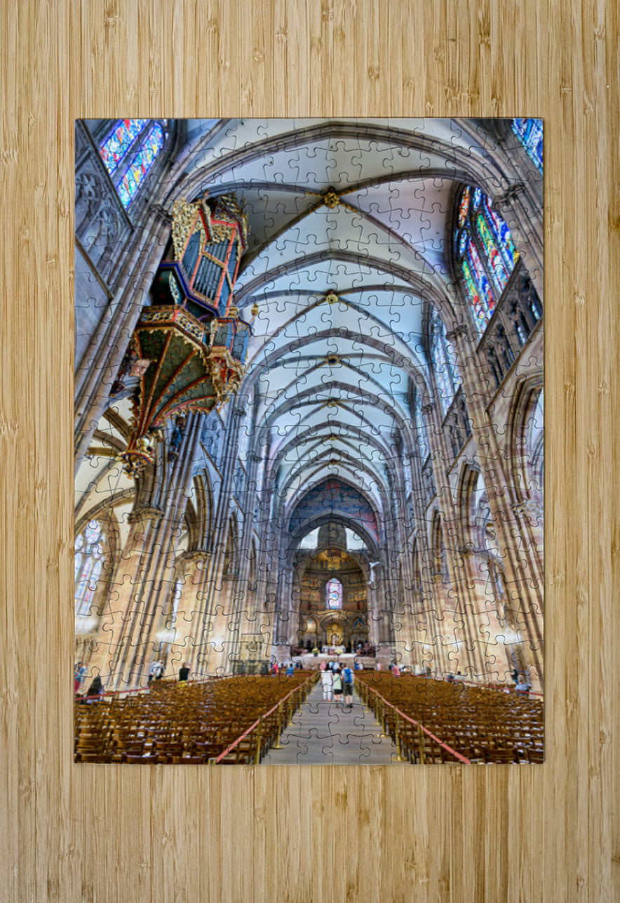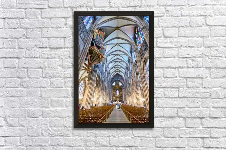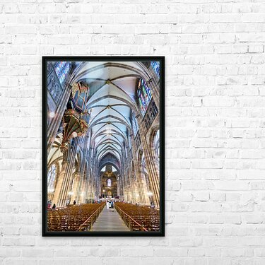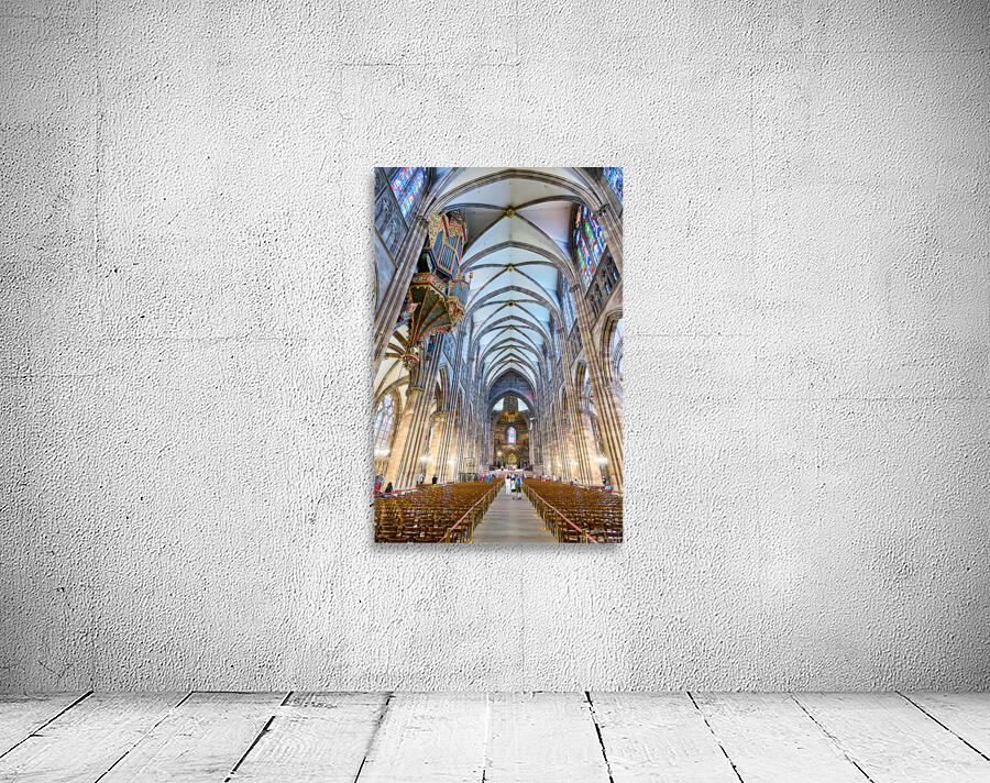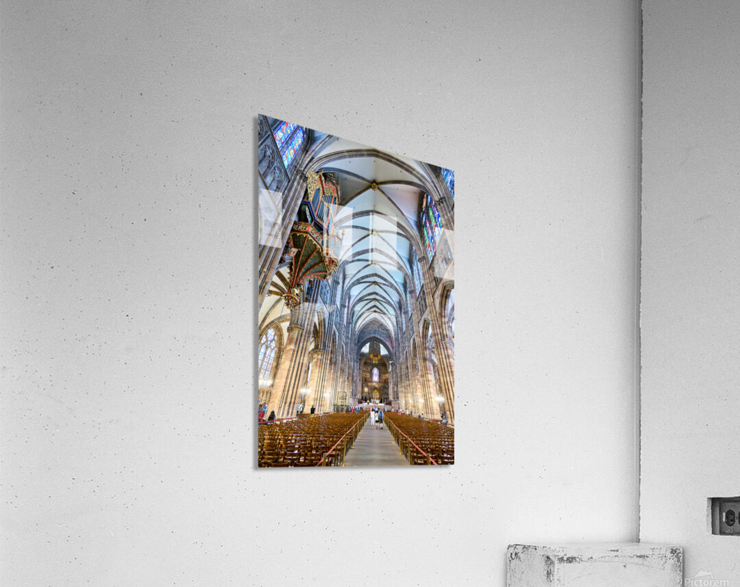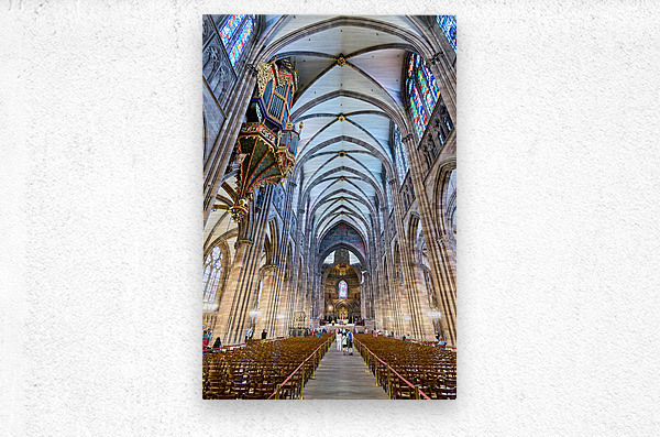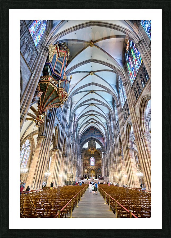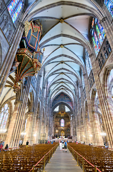People walk through the interior of Strasbourg Cathedral in Alsace France. The tall arches and stained glass surround the visitors.