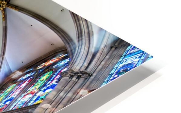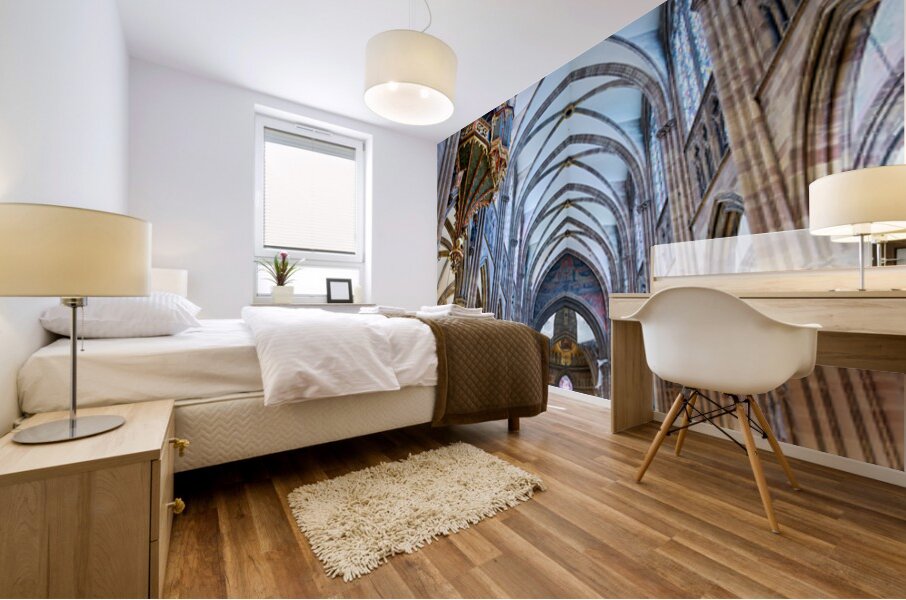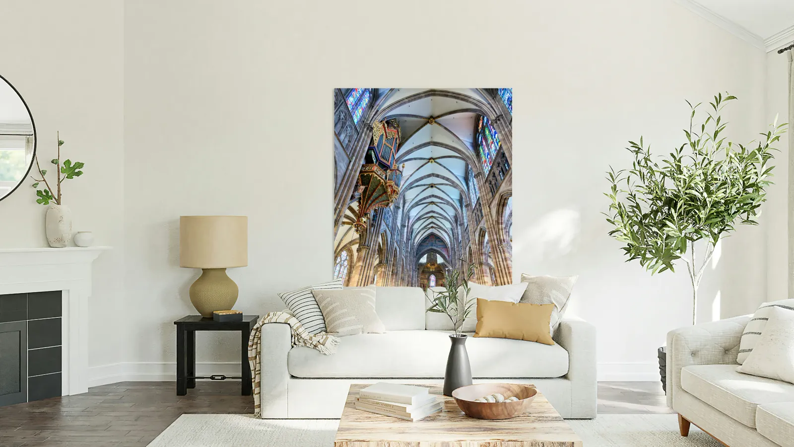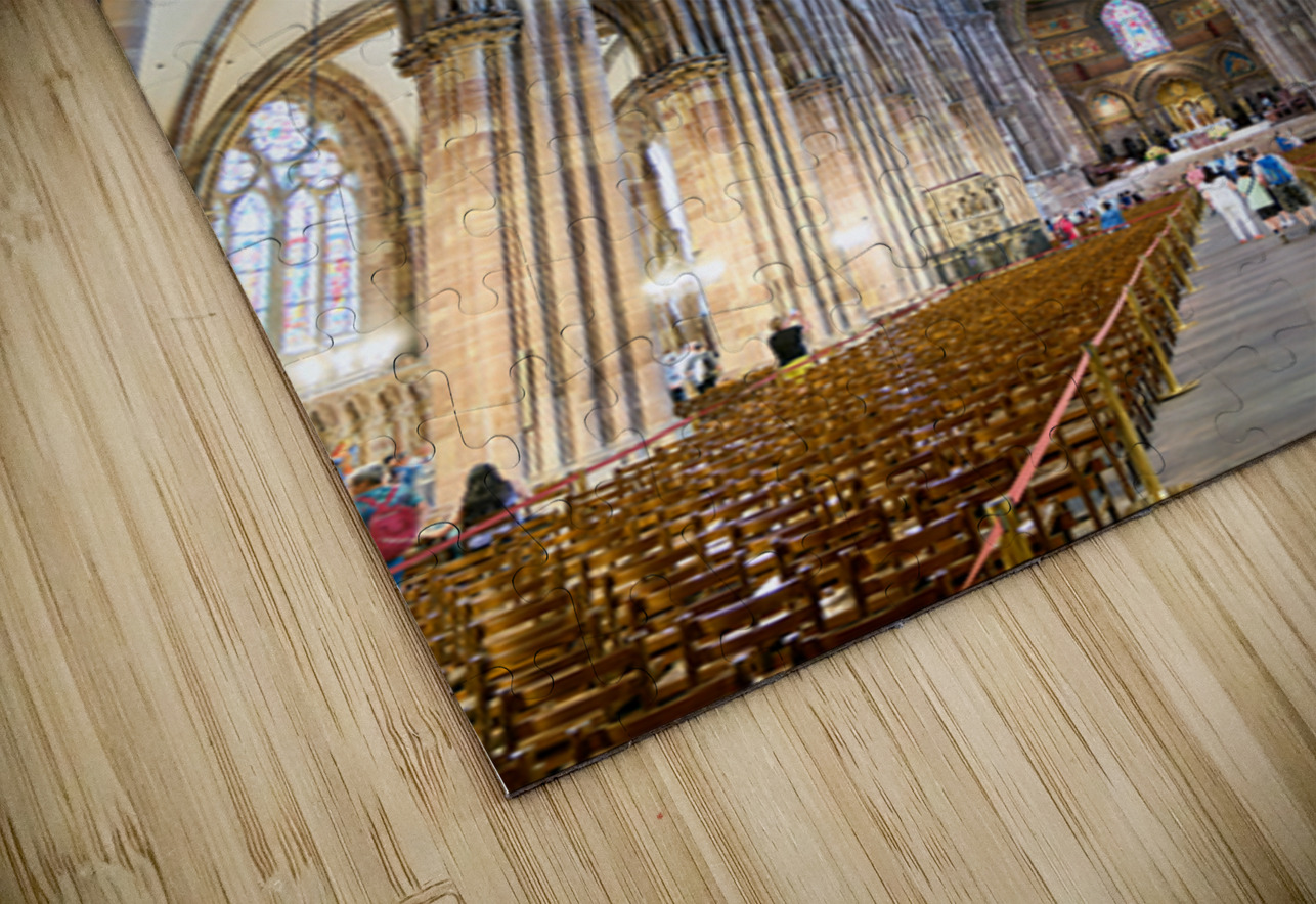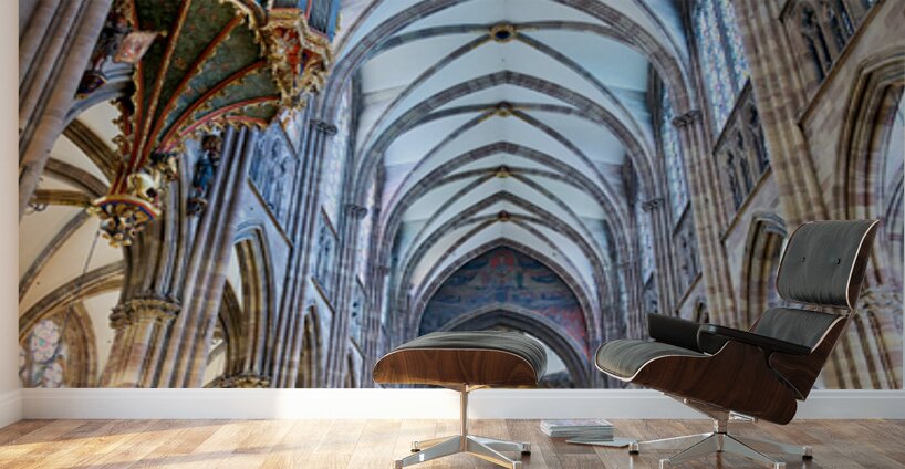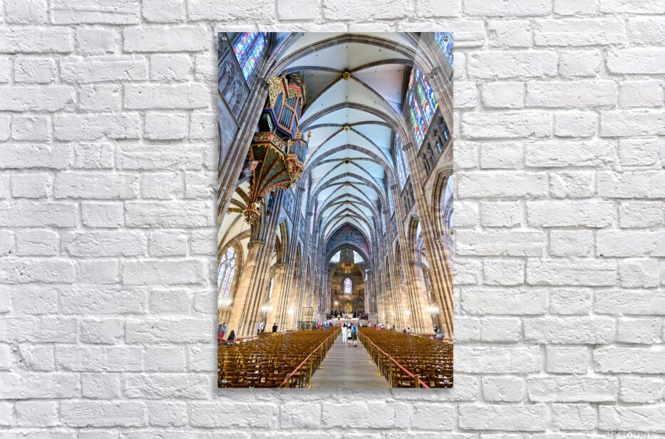 People walk through the interior of Strasbourg Cathedral in Alsace France. The tall arches and stained glass surround the visitors.