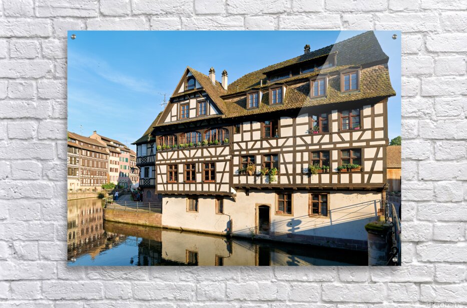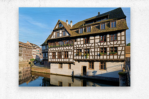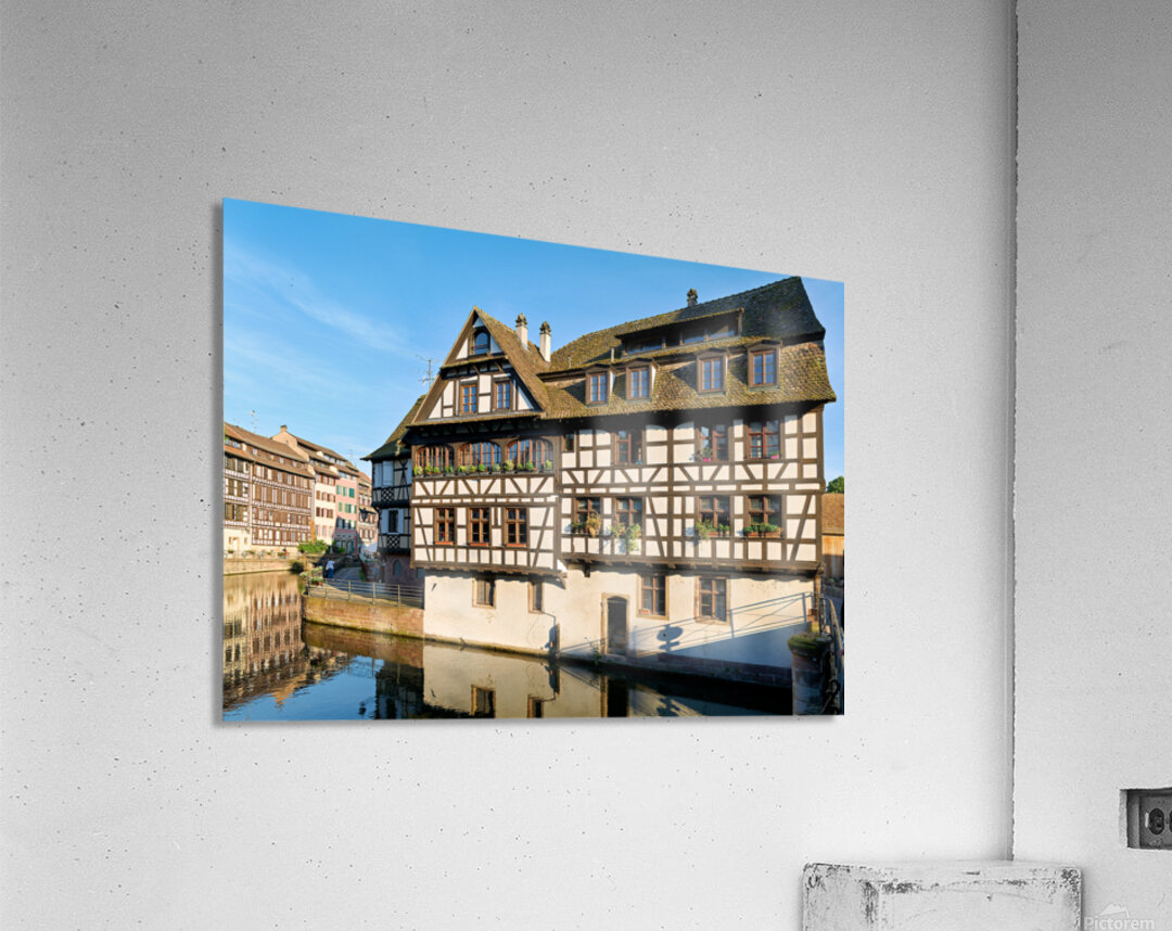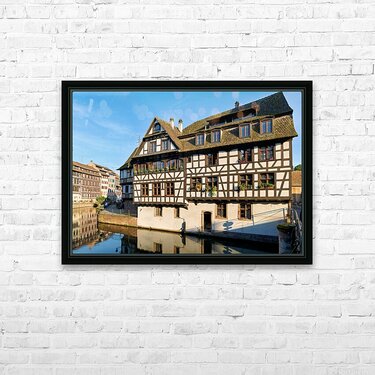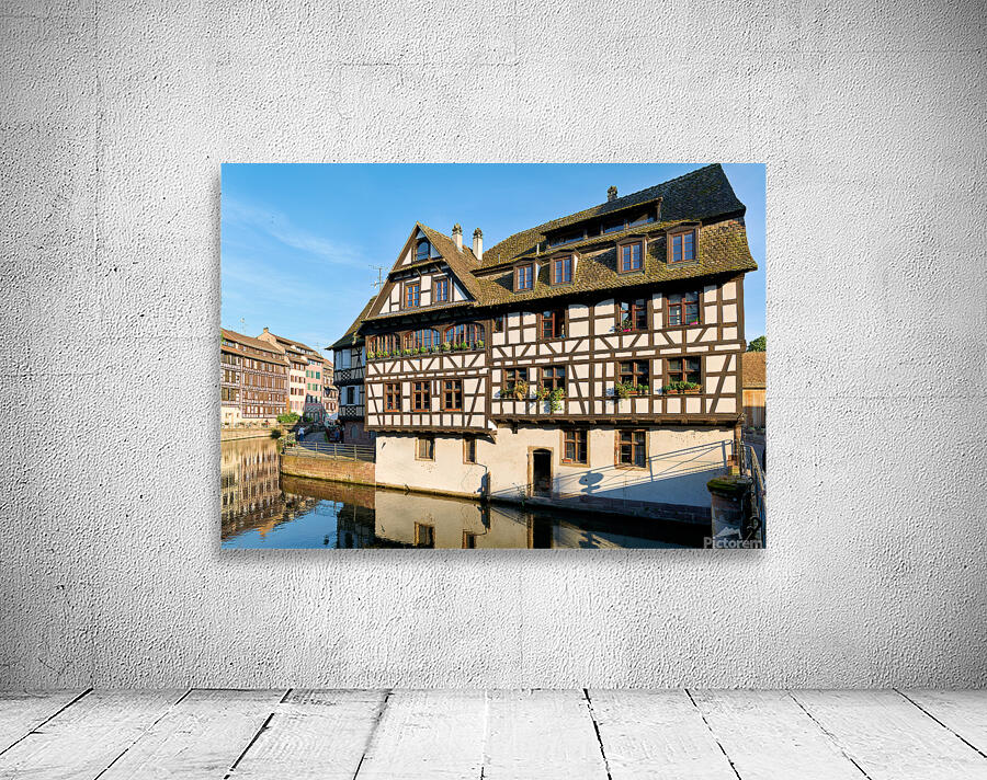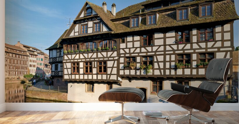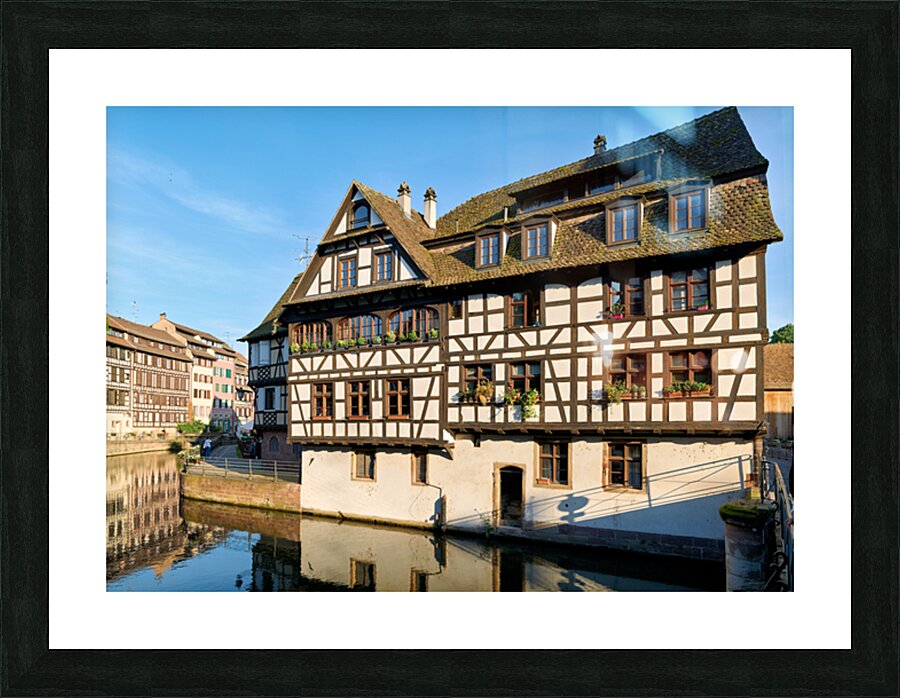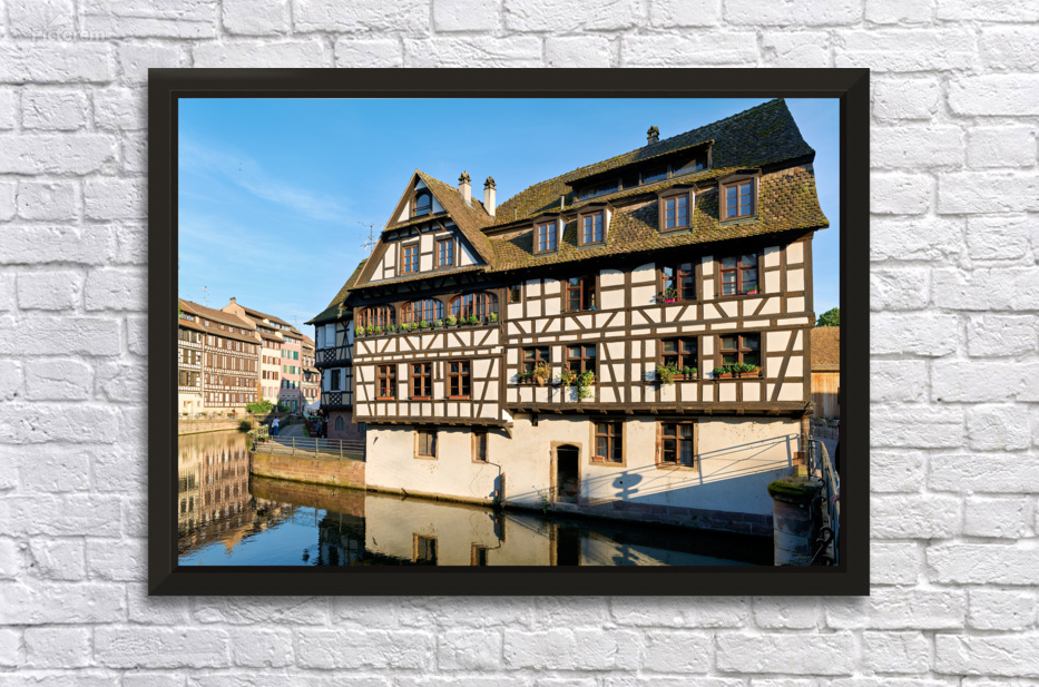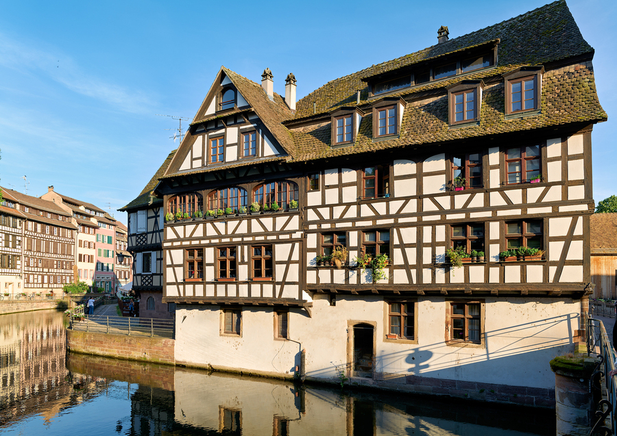 Wooden houses line the canal in Petit France district. Visitors see the architecture and explore the area under a clear blue sky.
