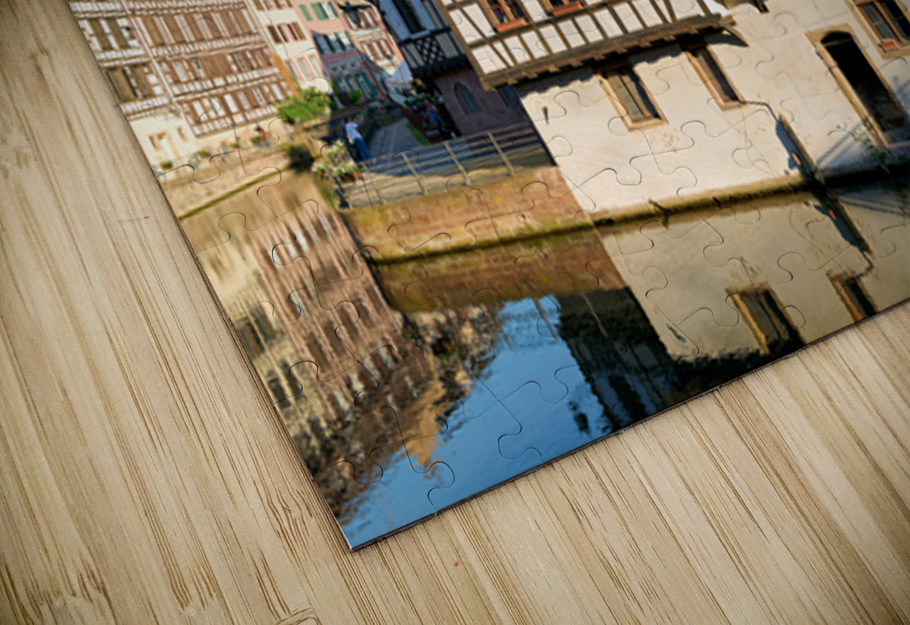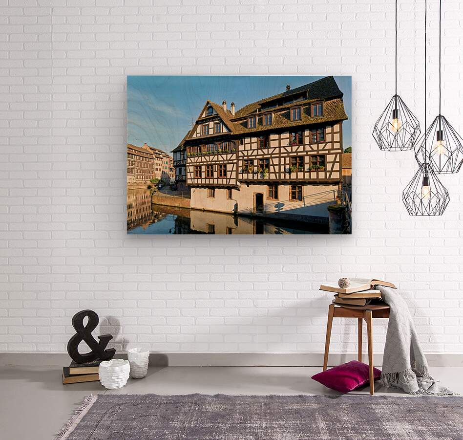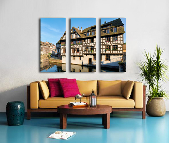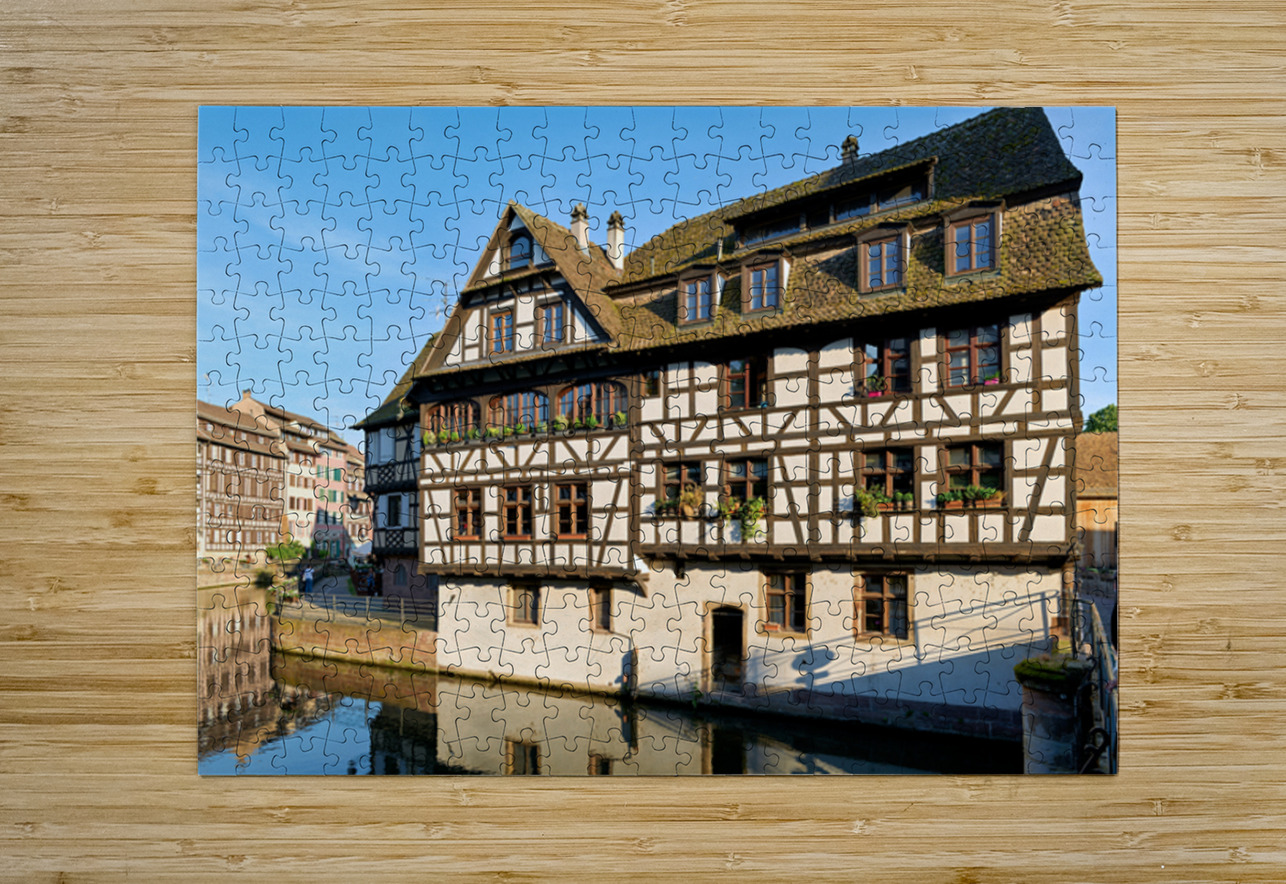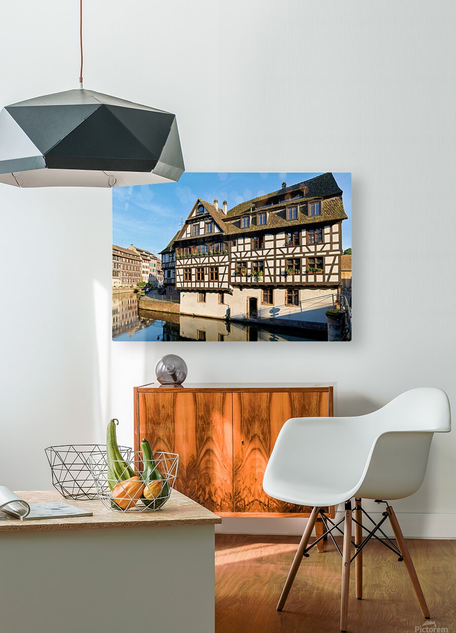 Wooden houses line the canal in Petit France district. Visitors see the architecture and explore the area under a clear blue sky.