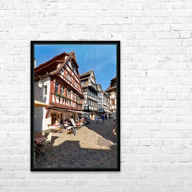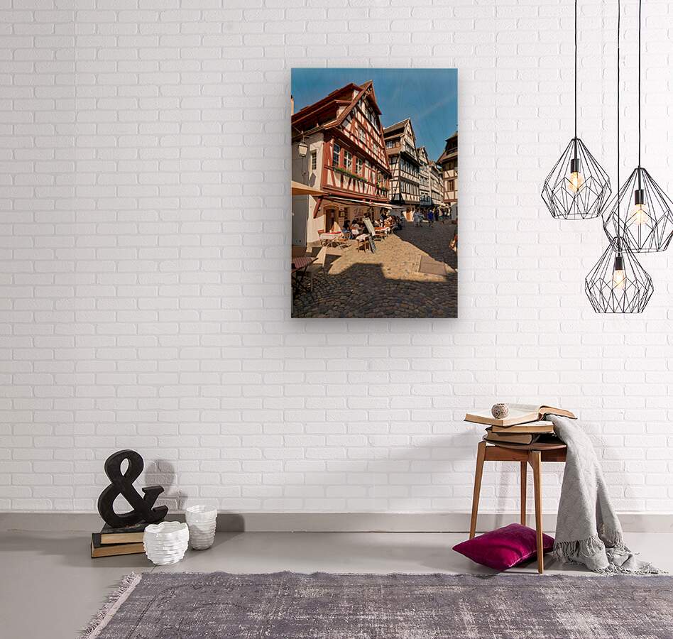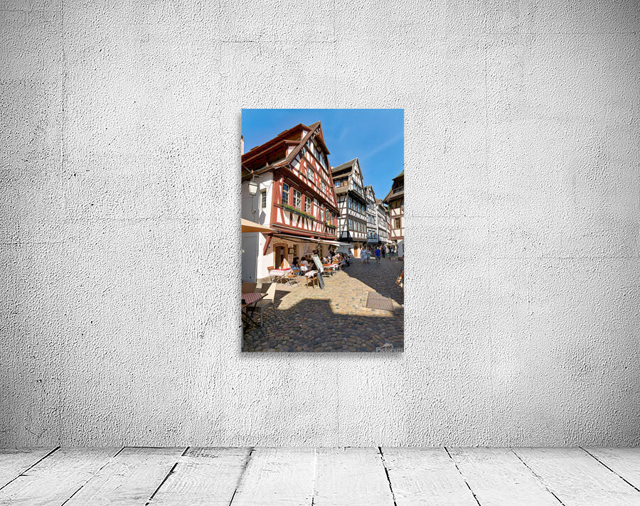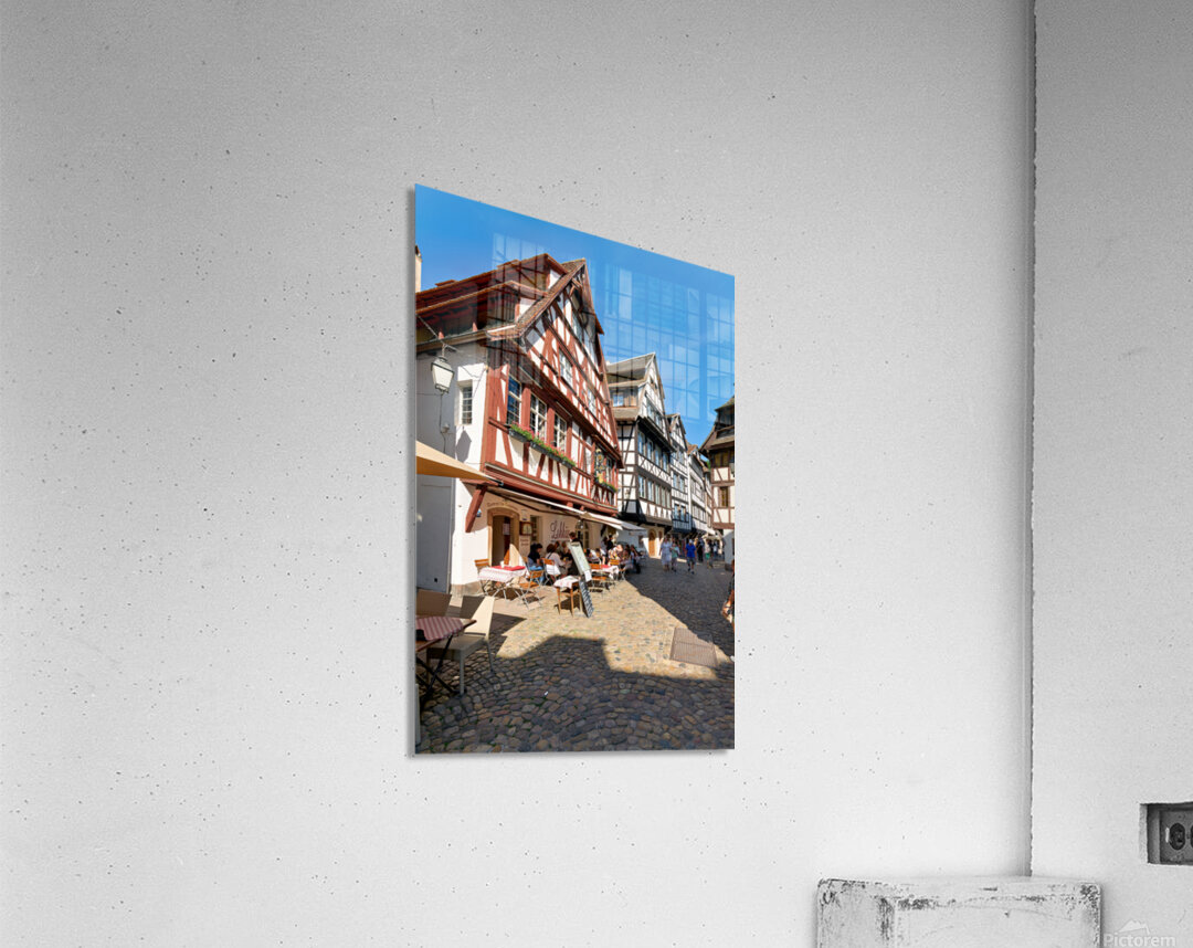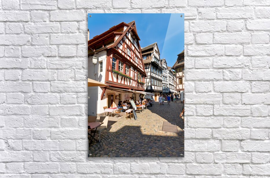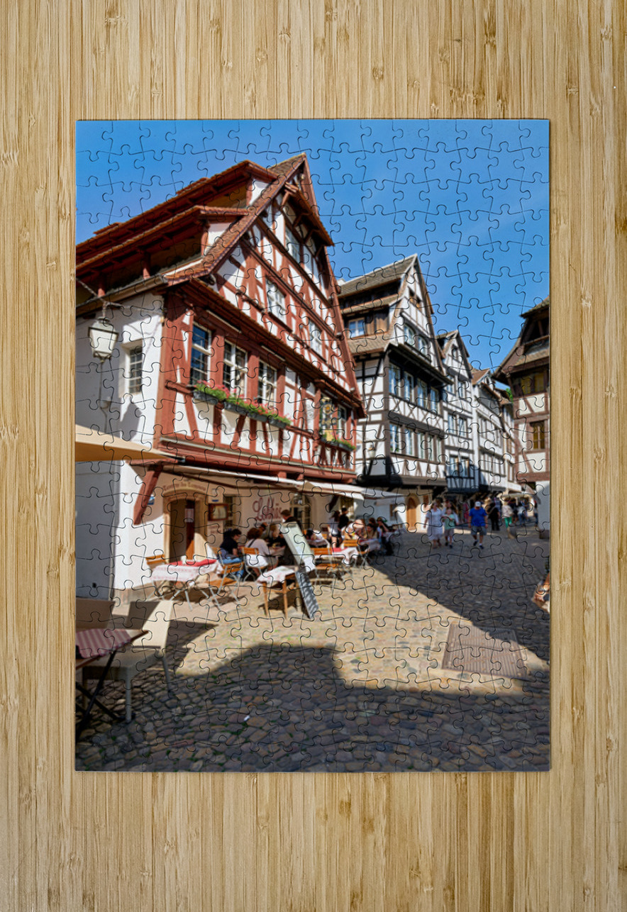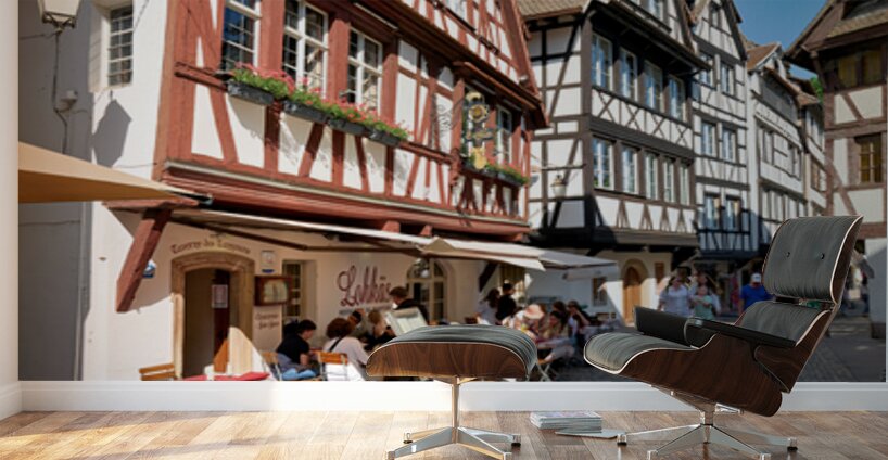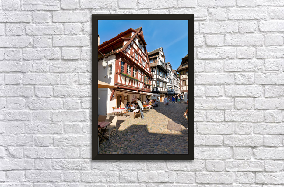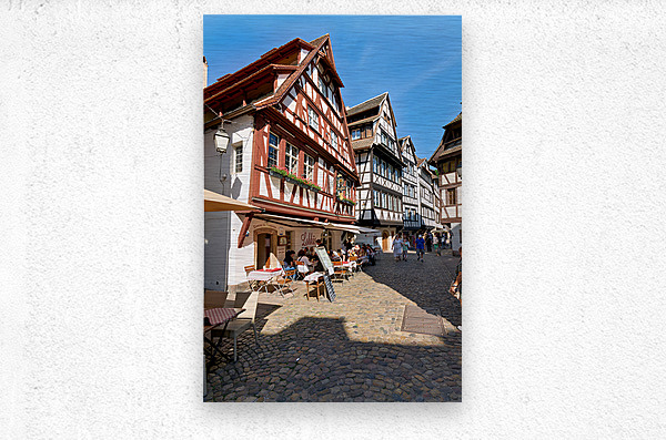 Visitors walk on cobblestone streets in Petit France while others sit at tables eating and drinking near timber framed houses in Strasbourg.
