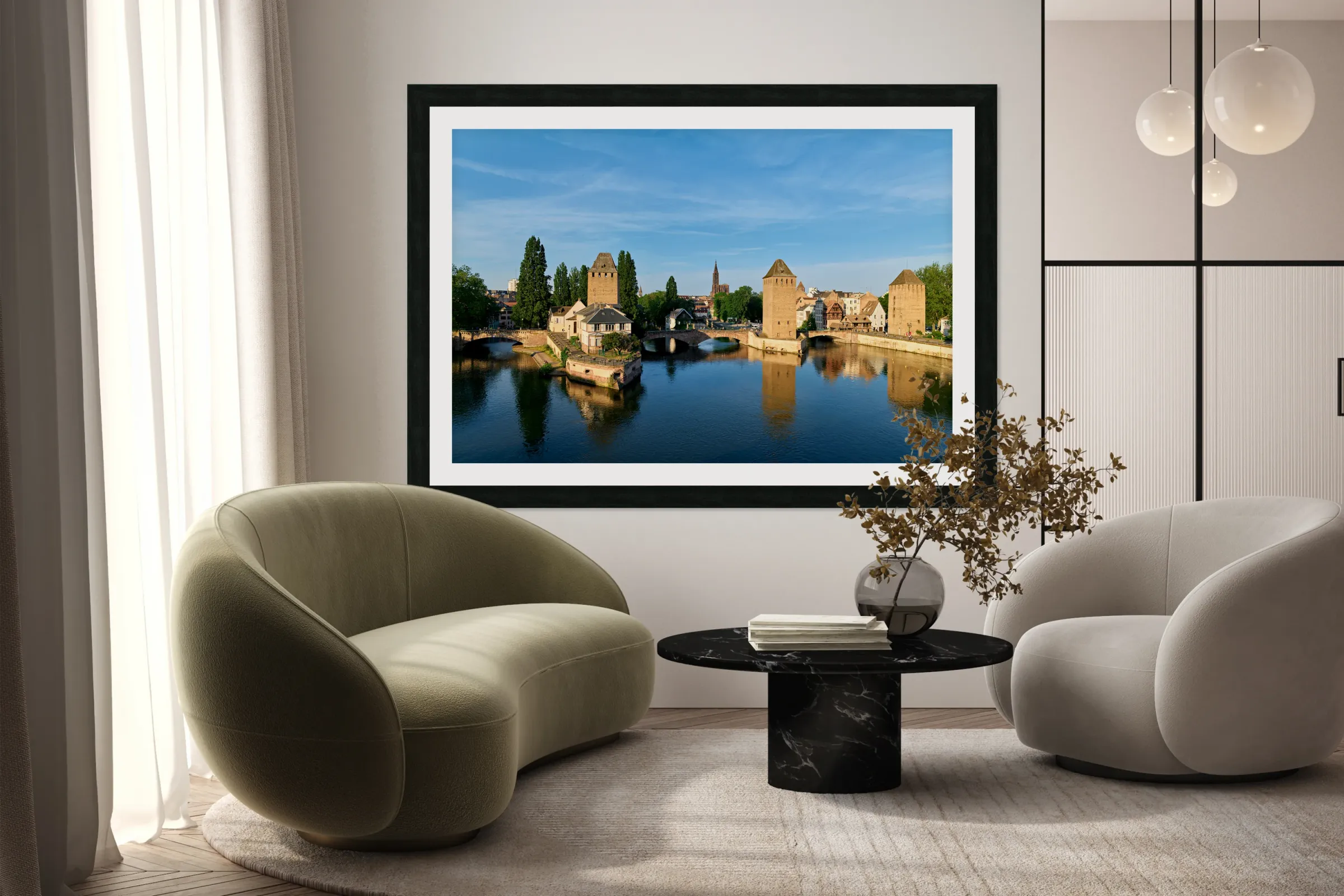 ABOUT THIS ARTWORK: COVERED BRIDGES IN STRASBOURG BY THE RIVER ON A CLEAR DAY